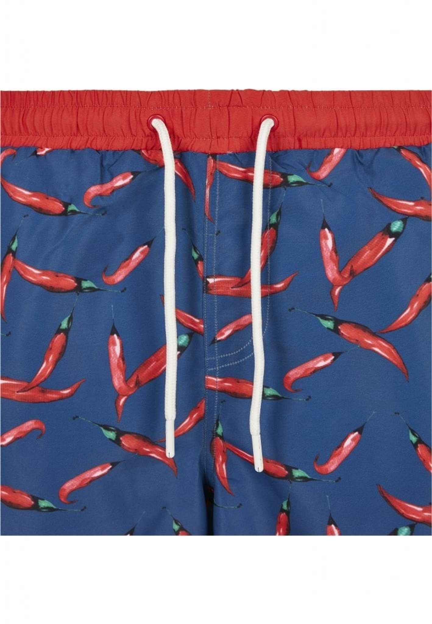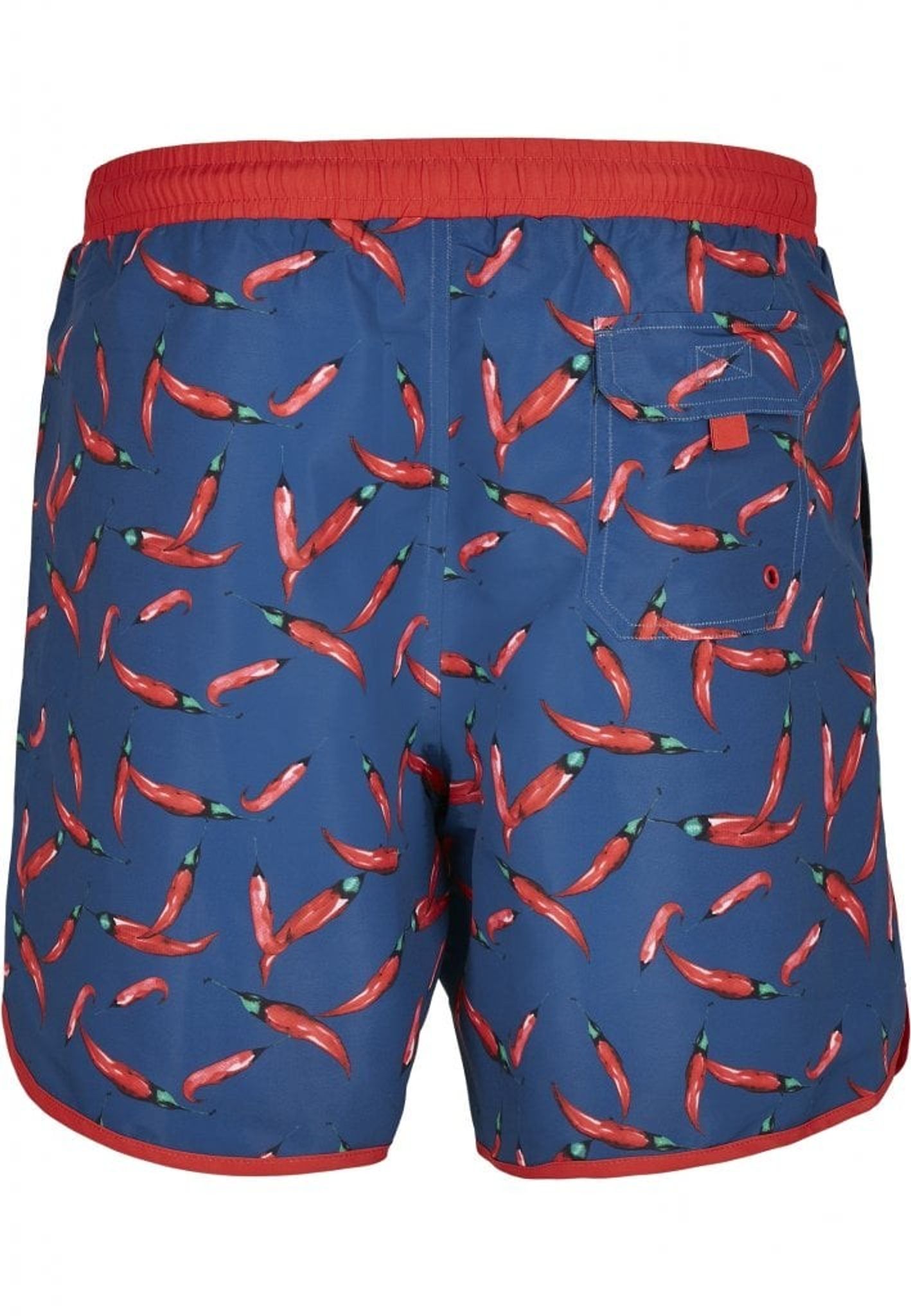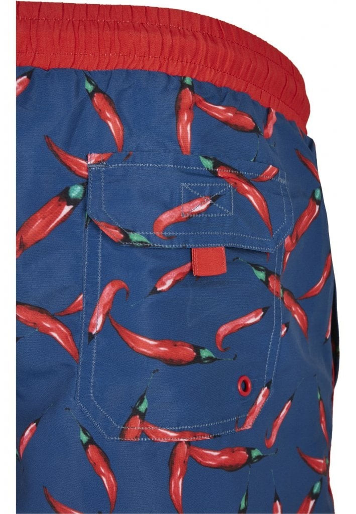 A pair of stylish and, above all, really hot swimsuits full of chili fruits on the dark blue fabric.