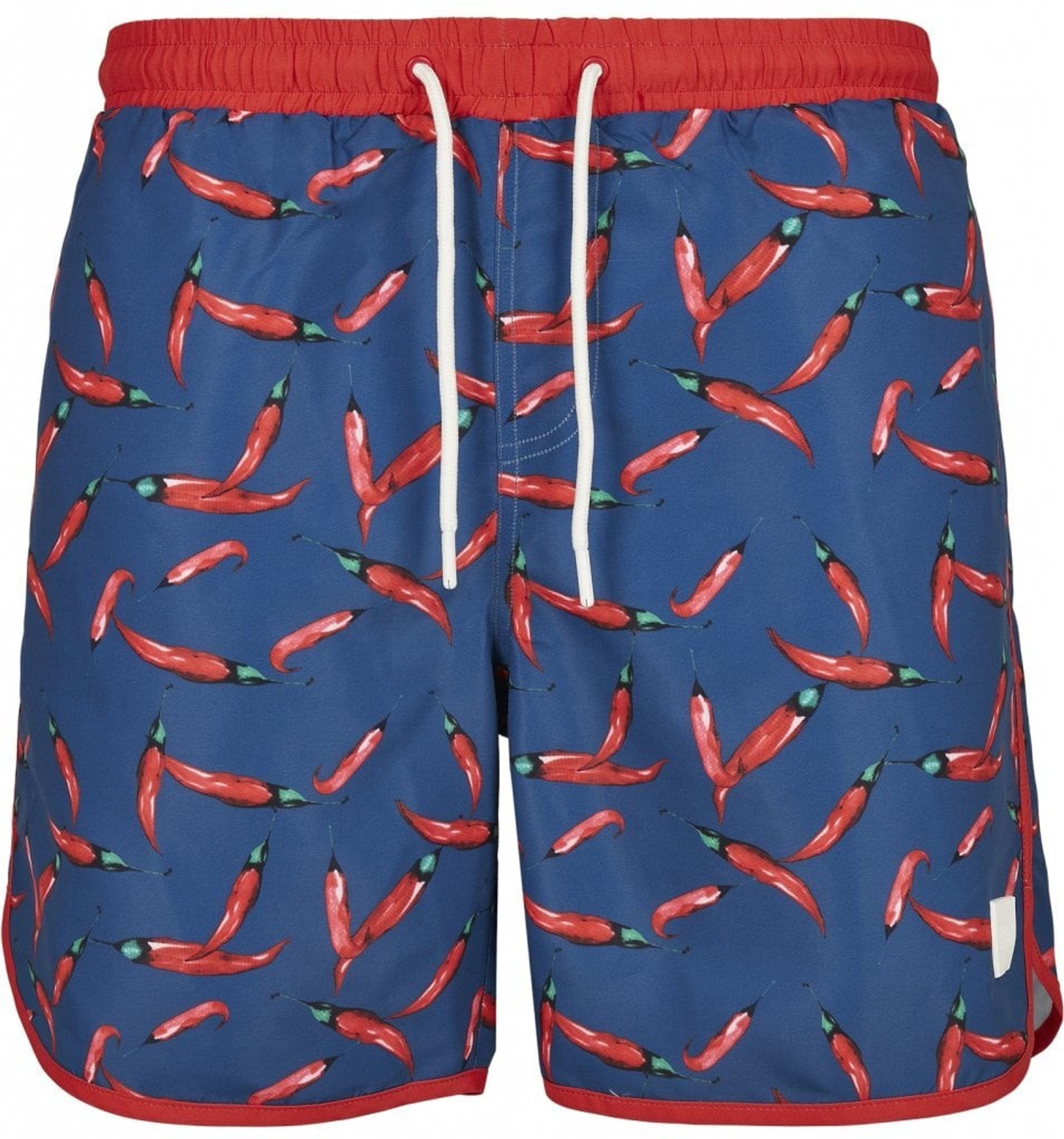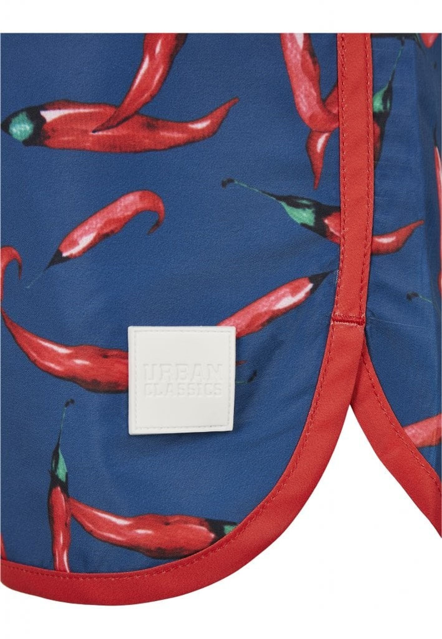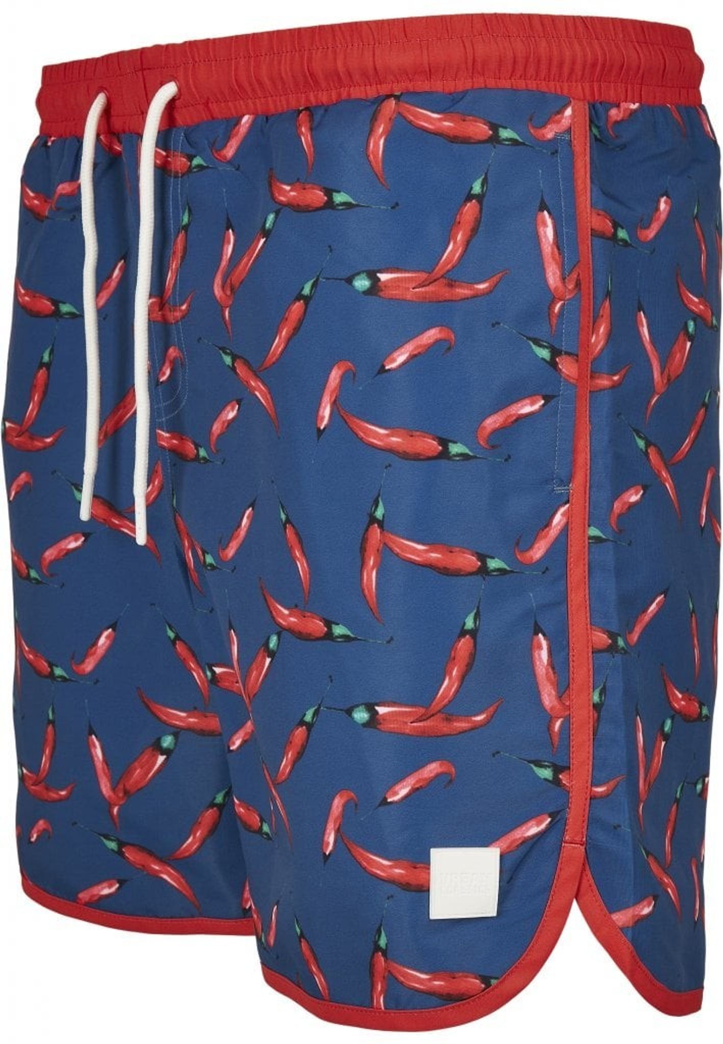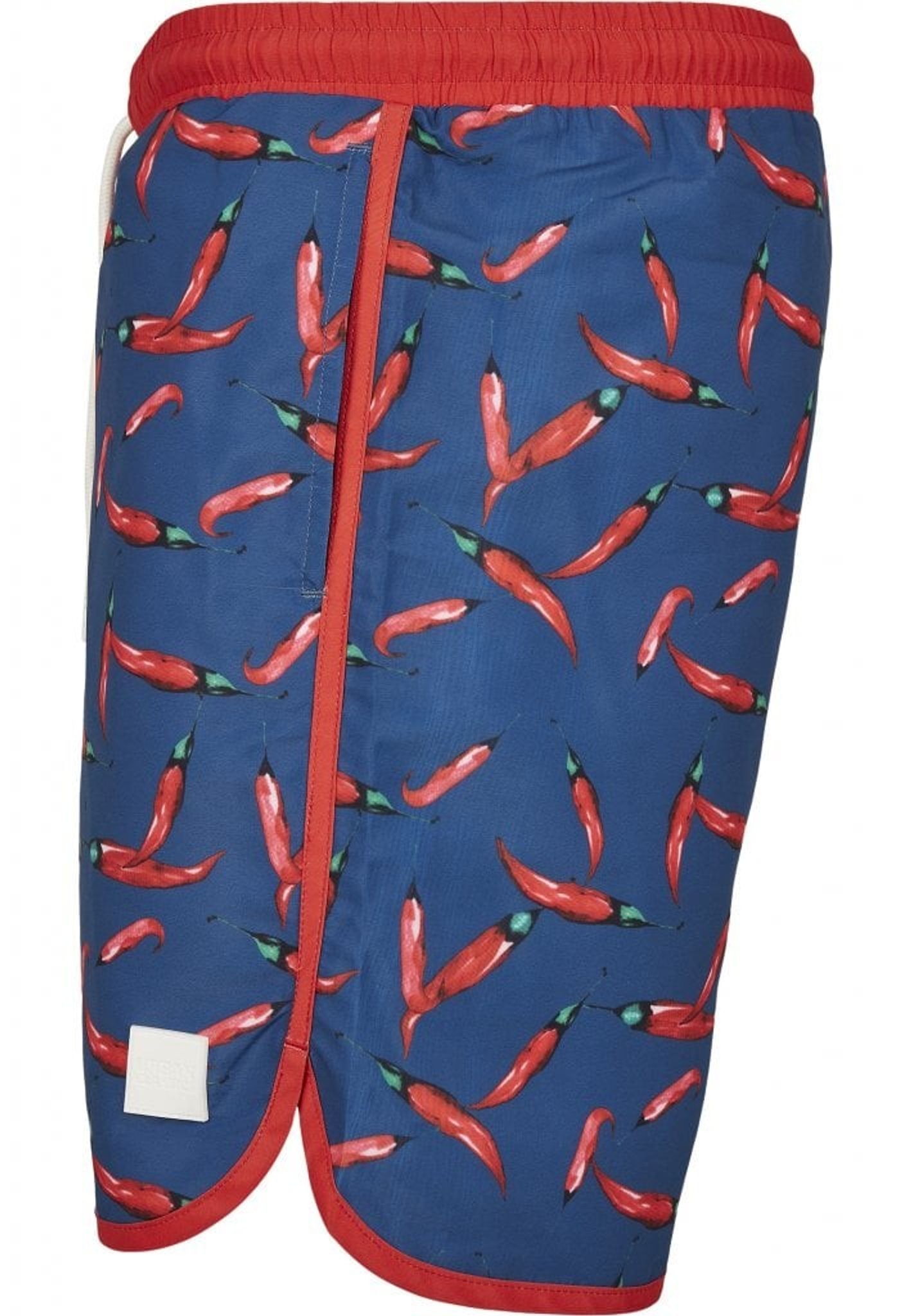 A pair of stylish and, above all, really hot swimsuits full of chili fruits on the dark blue fabric.