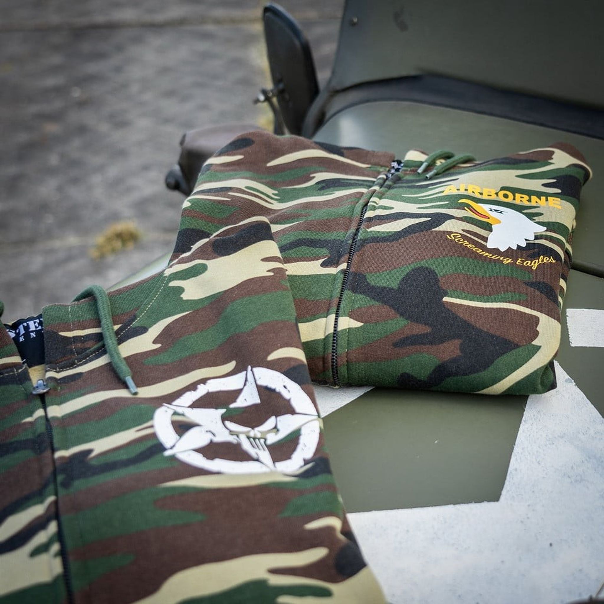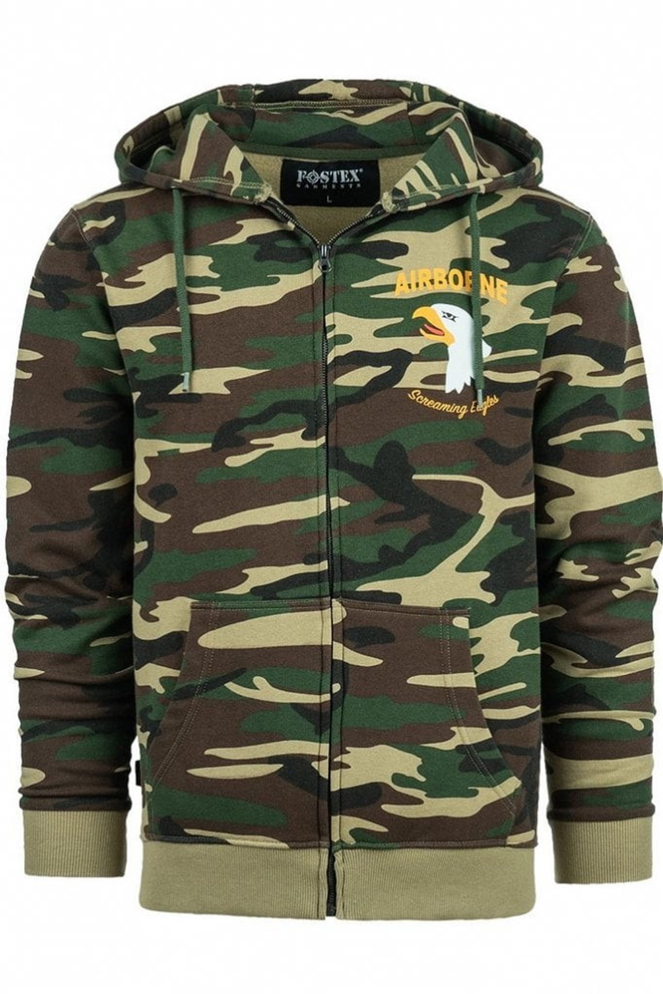 Denna hoodie i woodland camo är designad med AIRBORNE och en tryckt örn på bröstet. Den är tillverkad av en blandning av 60% bomull och 40% polyester, vilket ger en bekväm och slitstark känsla.