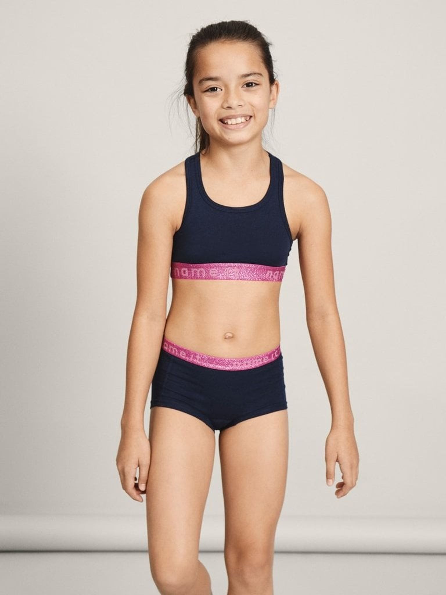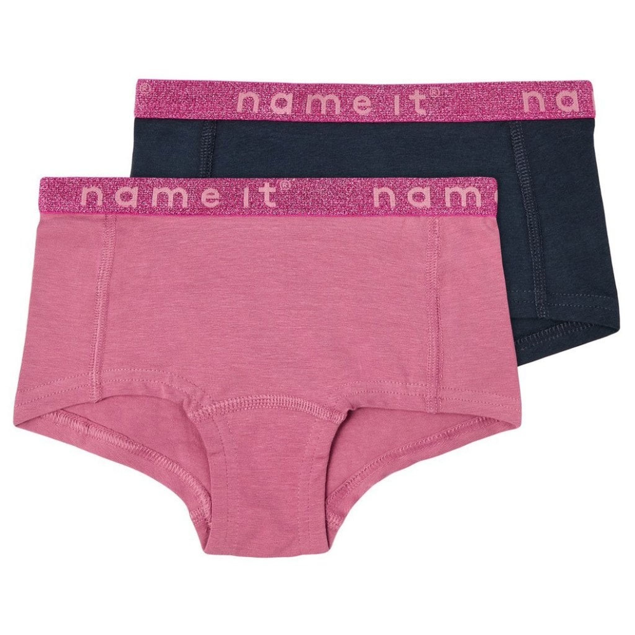 Ett par hipstertrosor med rosa glittrig elastisk midjeresår. Ena trosan är rosa tyg och andra är i svart tyg.