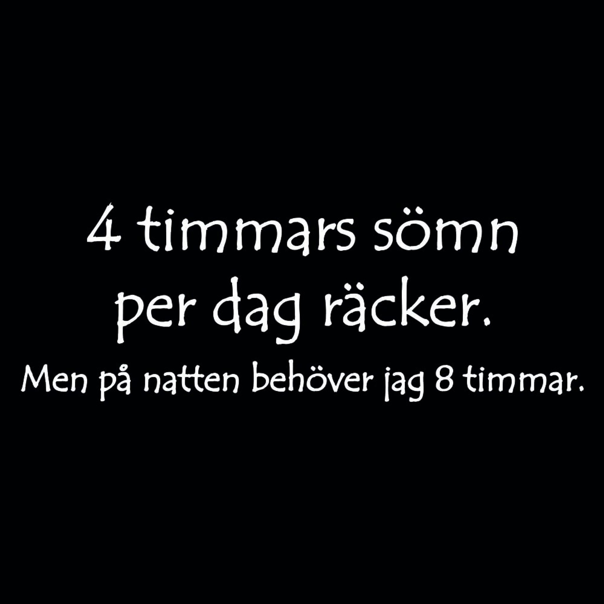 Introducerar "4 timmars sömn per dag räcker"-T-shirten, för den logiska akrobat som vet att dagen är till för korta blundar och natten för de riktiga djupdykningarna i drömmarnas värld. Texten "4 timmars sömn per dag räcker. Men på natten behöver jag 8 timmar." är en humoristisk hyllning till alla som försöker balansera behovet av att verka produktiva med deras äkta kärlek till sömn.