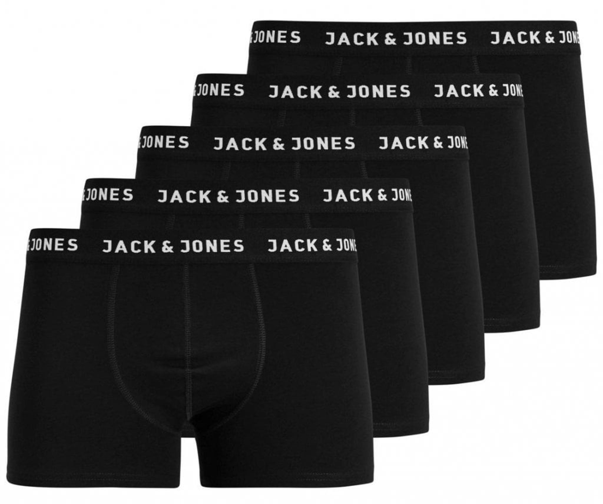 Ett 5 pack stilrena boxershorts i barnstorlekar från Jack & Jones som är helt svarta förutom den vita Jack & Jones loggan på det elastiska midjebandet.
