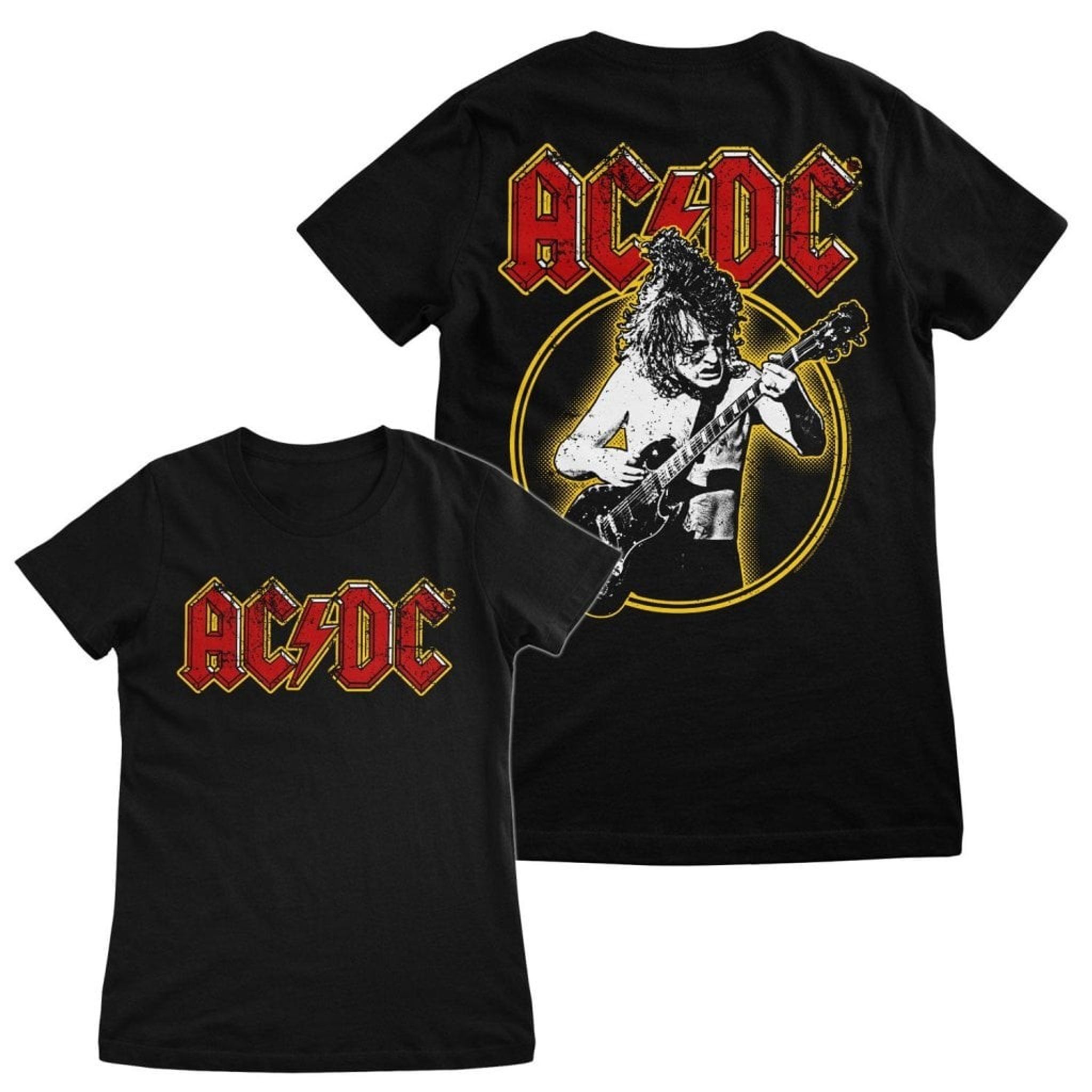 Men det är baksidan som verkligen stjäl showen. Här hittar vi en stor och livfull illustration av Angus Young i full swing med sin gitarr, fångad i ett ögonblick av ren energi. Det är nästan som att han är redo att hoppa ut ur t-shirten och dra igång en konsert direkt. En gul cirkel ramar in honom, vilket ger en extra touch av bländande glamour.