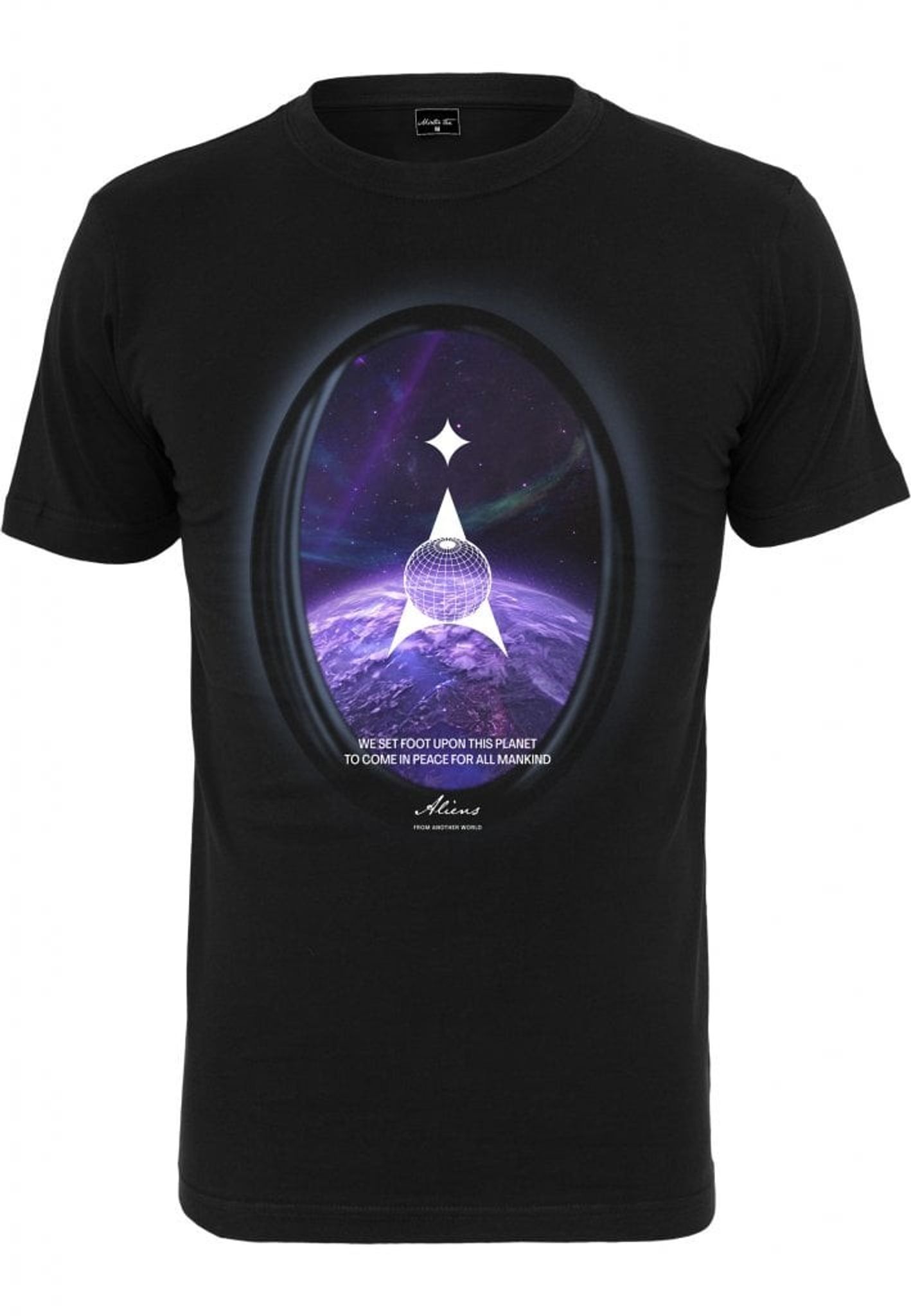Svart T-shirt med rymdtema. Text "We set foot upon this planet to come in peace for all mankind, Aliens, from another world".