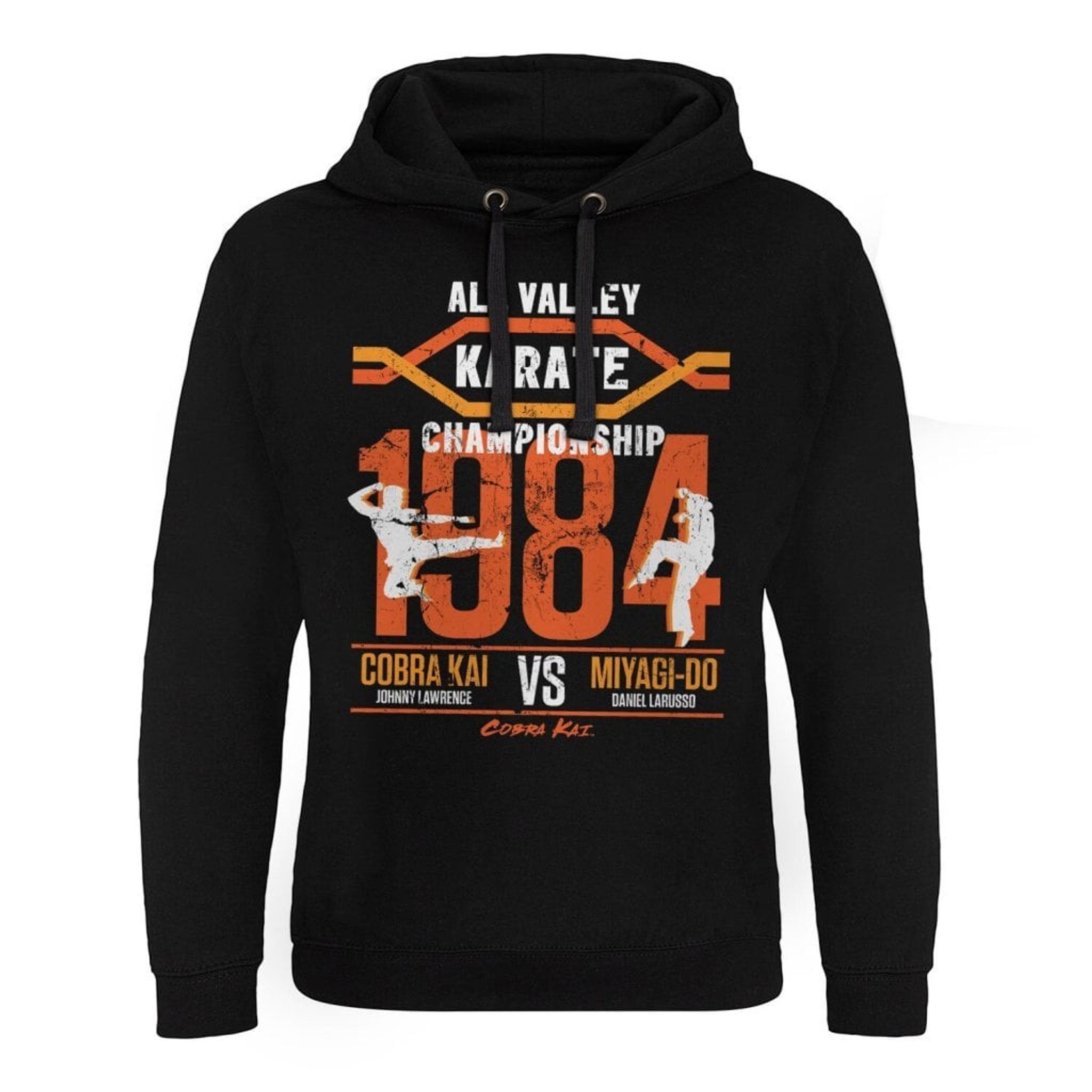 Låt mig presentera för er: All Valley Karate Championship Epic Hoodie! Denna hoodie är lika cool som en runda "Crane kicks"! Tillverkad av 80% bomull och 20% polyester, du kan vara säker på att den är lika bekväm som den är tuff. Märkt med den legendariska Cobra Kai och Karate Kid loggan, är denna hoodie officiellt licensierat merchandise. Du vet att du är i bra händer när du bär något som har godkänts av karatemästare!