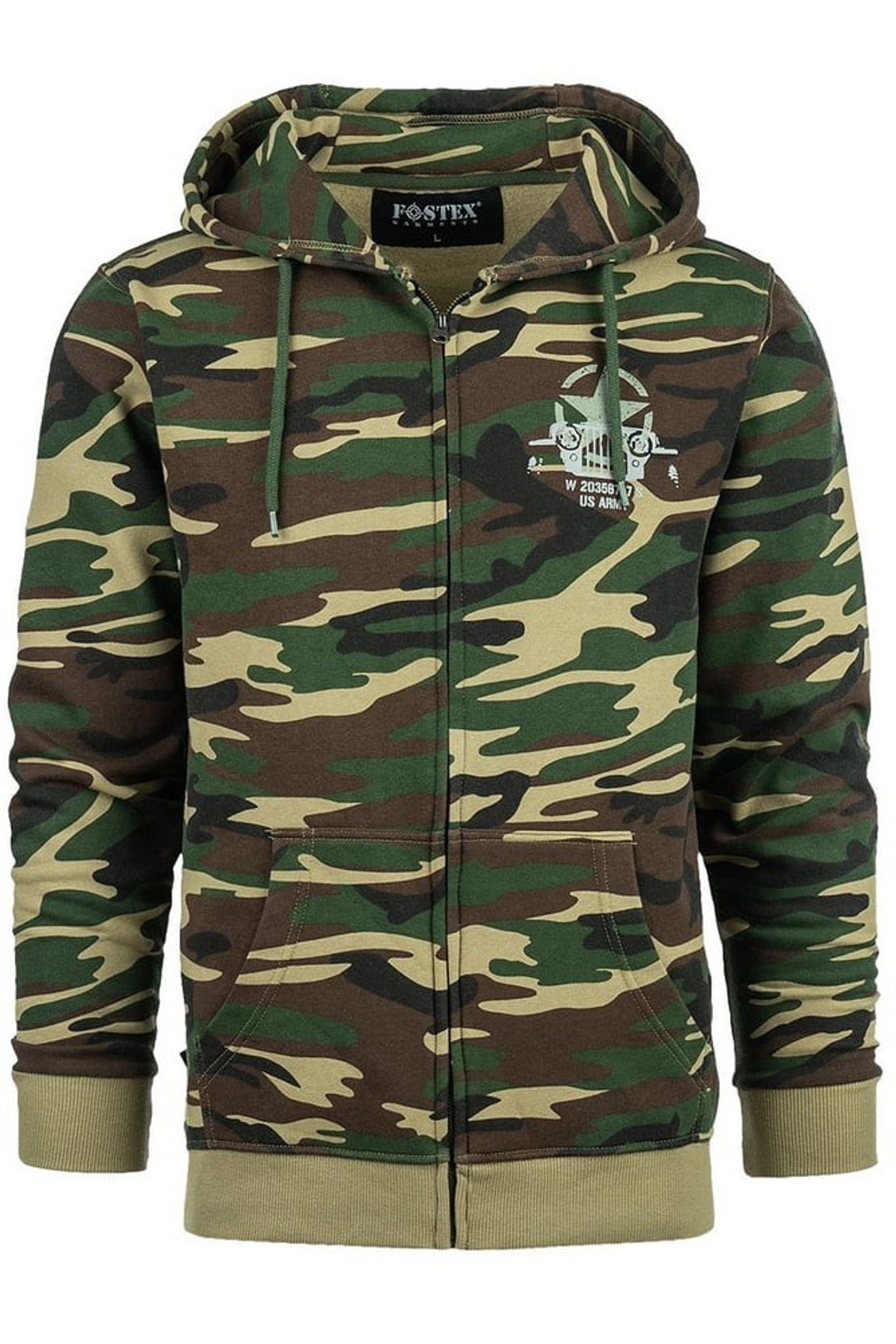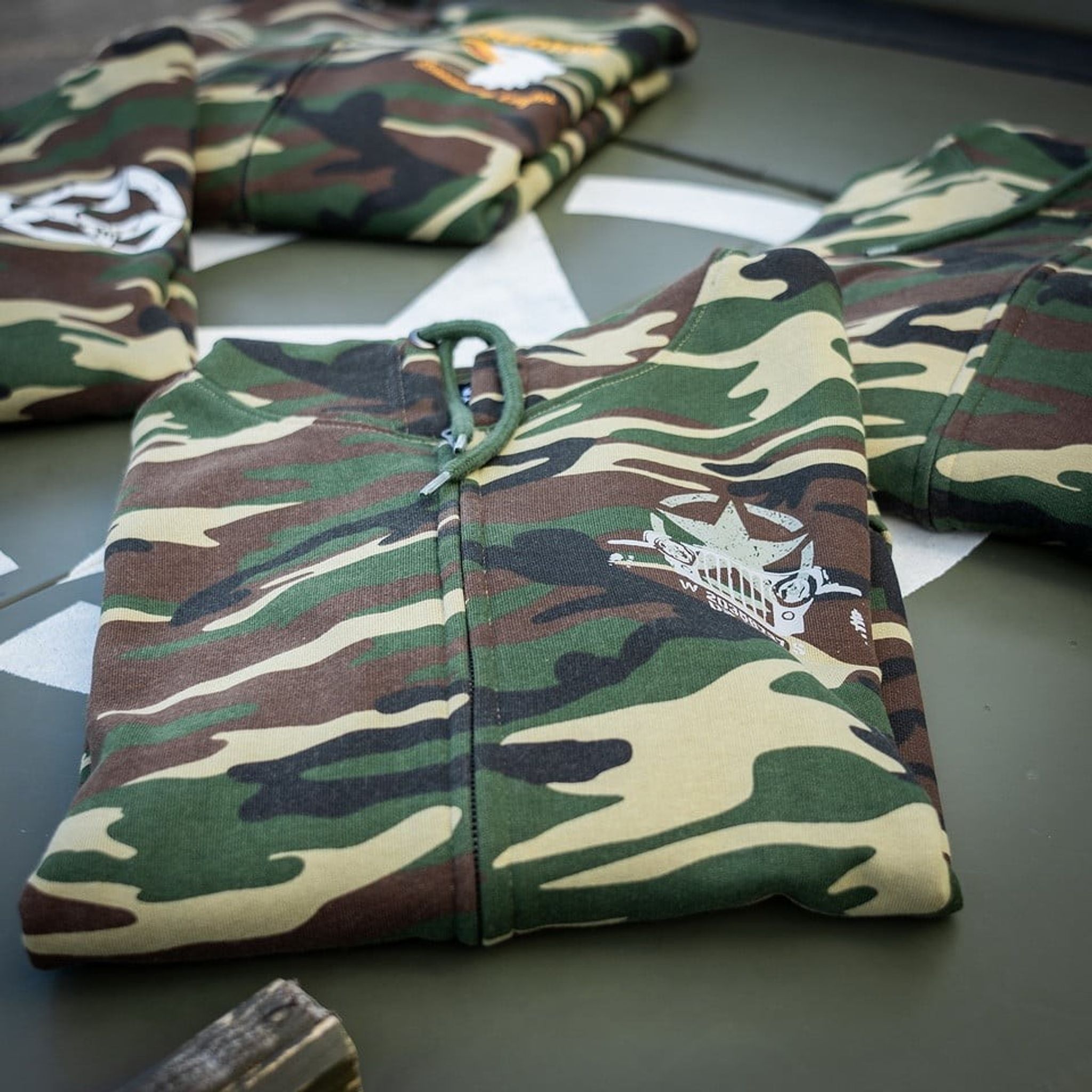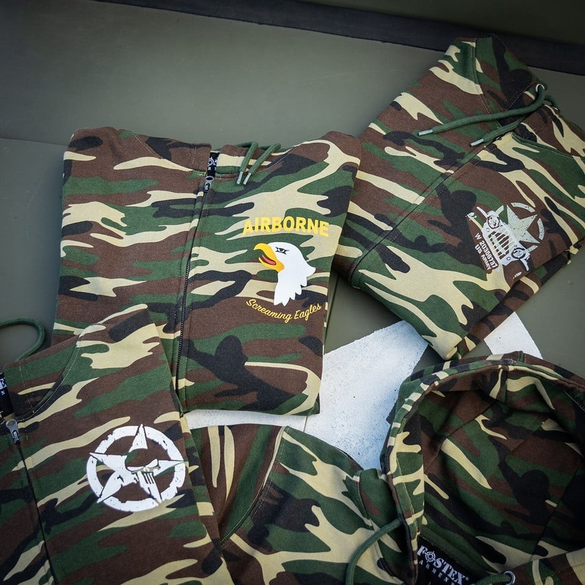 Denna zip-up hoodie i woodland camouflagemönster har en tryckt bild av en Allied Star bakom en Willy jeep på bröstet. Den är designad för att vara både stilren och funktionell, vilket gör den till ett utmärkt val för olika tillfällen.