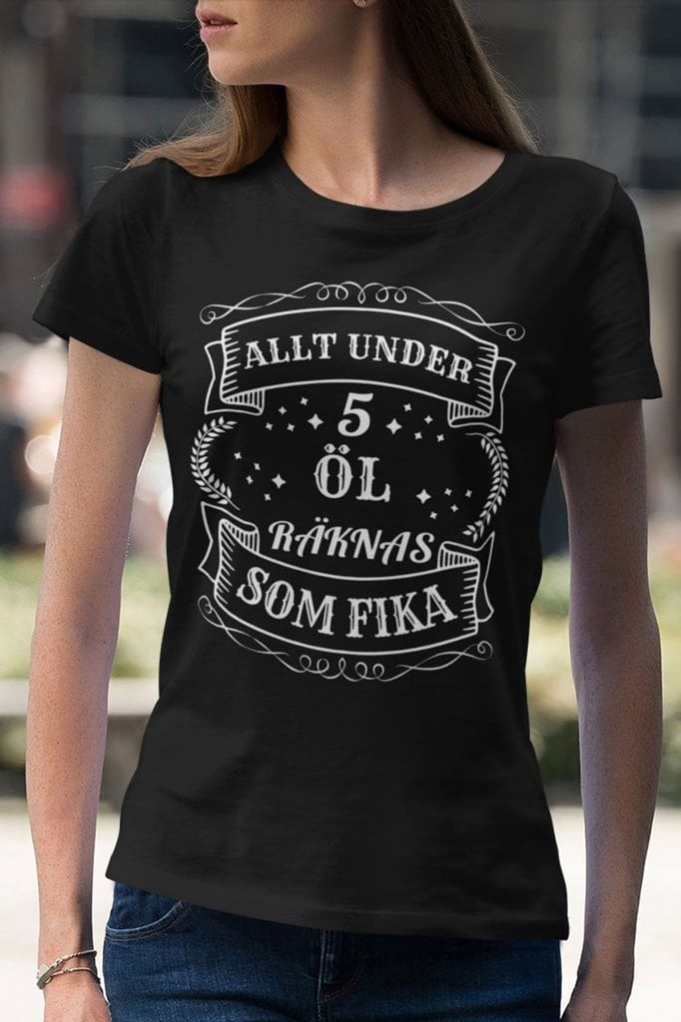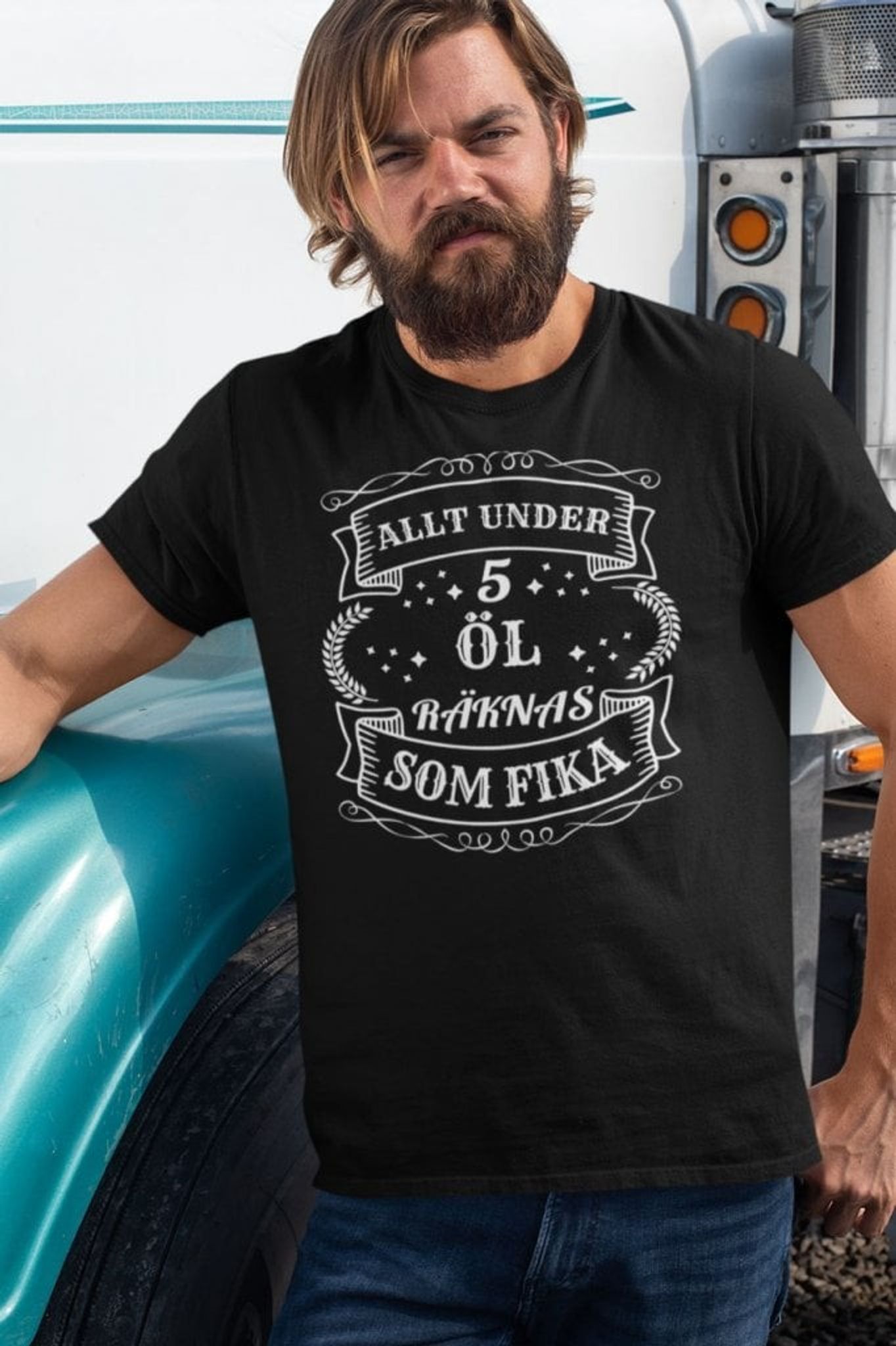 Upptäck vår humoristiska T-shirt som garanterat kommer att locka fram ett leende. Med det lekfulla trycket "Allt under 5 öl räknas som fika" är denna tröja perfekt för alla som uppskattar en god öl och en bra skratt.