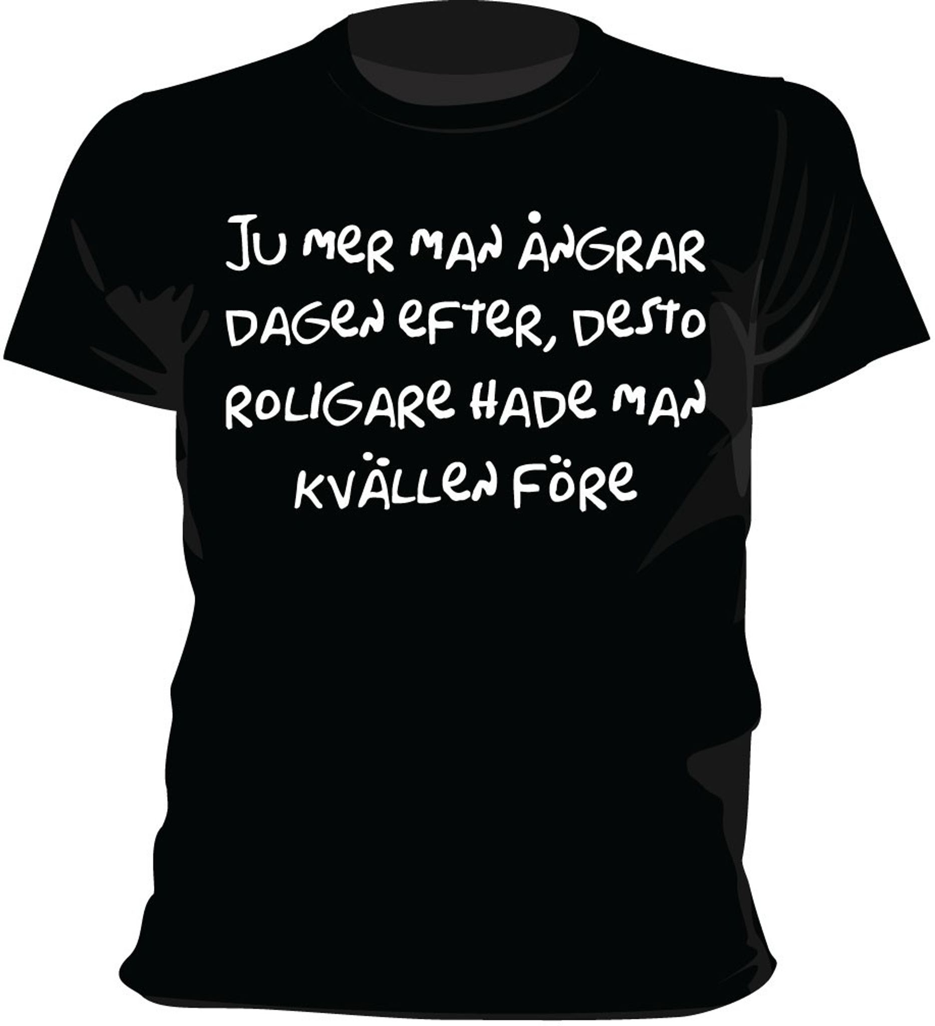 "Ju mer man ångrar dagen efter, desto roligare hade man kvällen före." Denna sköna T-shirt sammanfattar den oförglömliga kvällens anda på det mest ärliga och humoristiska sättet. Har du någonsin vaknat upp och tänkt "Oj, vad hände igår?" Då är detta tröjan för dig!