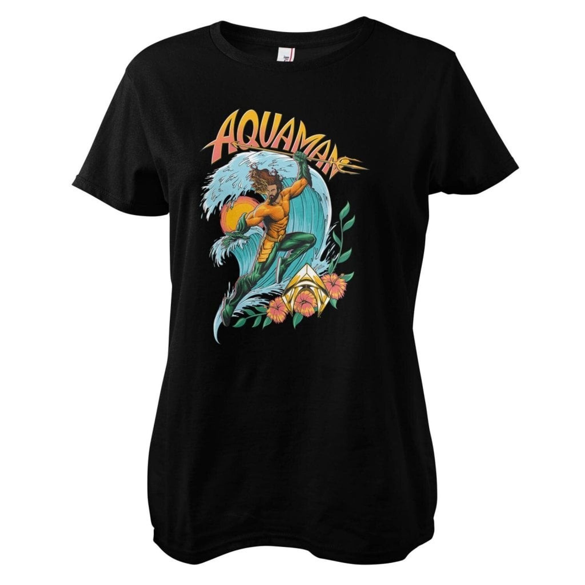 Behöver du en båt när du har muskler och en trident? Aquaman Surf Style Girly Tee ger dig den ultimata känslan av att erövra haven med styrka och stil. Den ikoniska karaktären är klädd i gult och grönt, redo att slåss mot havets faror med sin muskulösa fysik och trident i handen. Bakom honom strålar en geometrisk bakgrund, som ramar in honom som en superhjälte version av en Oscar-statyn. "AQUAMAN" lyser i neonljuset från en undervattensstad och står skrivet under honom, som en påminnelse om hans oceaniska kraft.