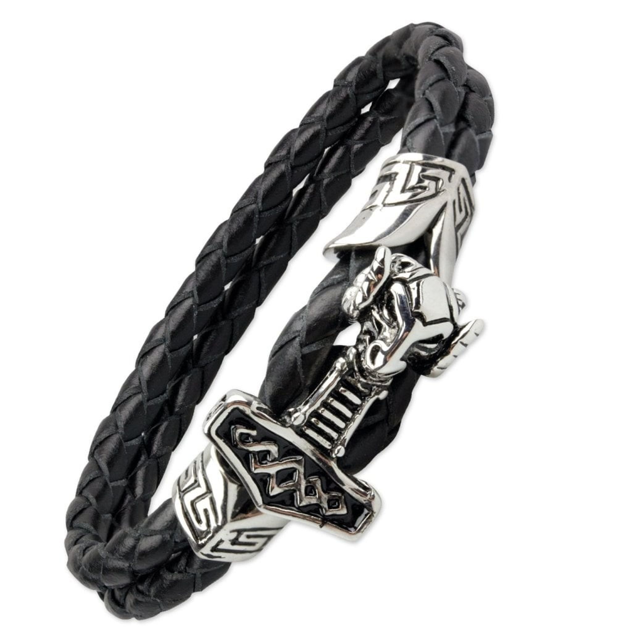Armband i läder och rostfrittstål. Där Thors hammare är i rostfritt stål och länken i läder.