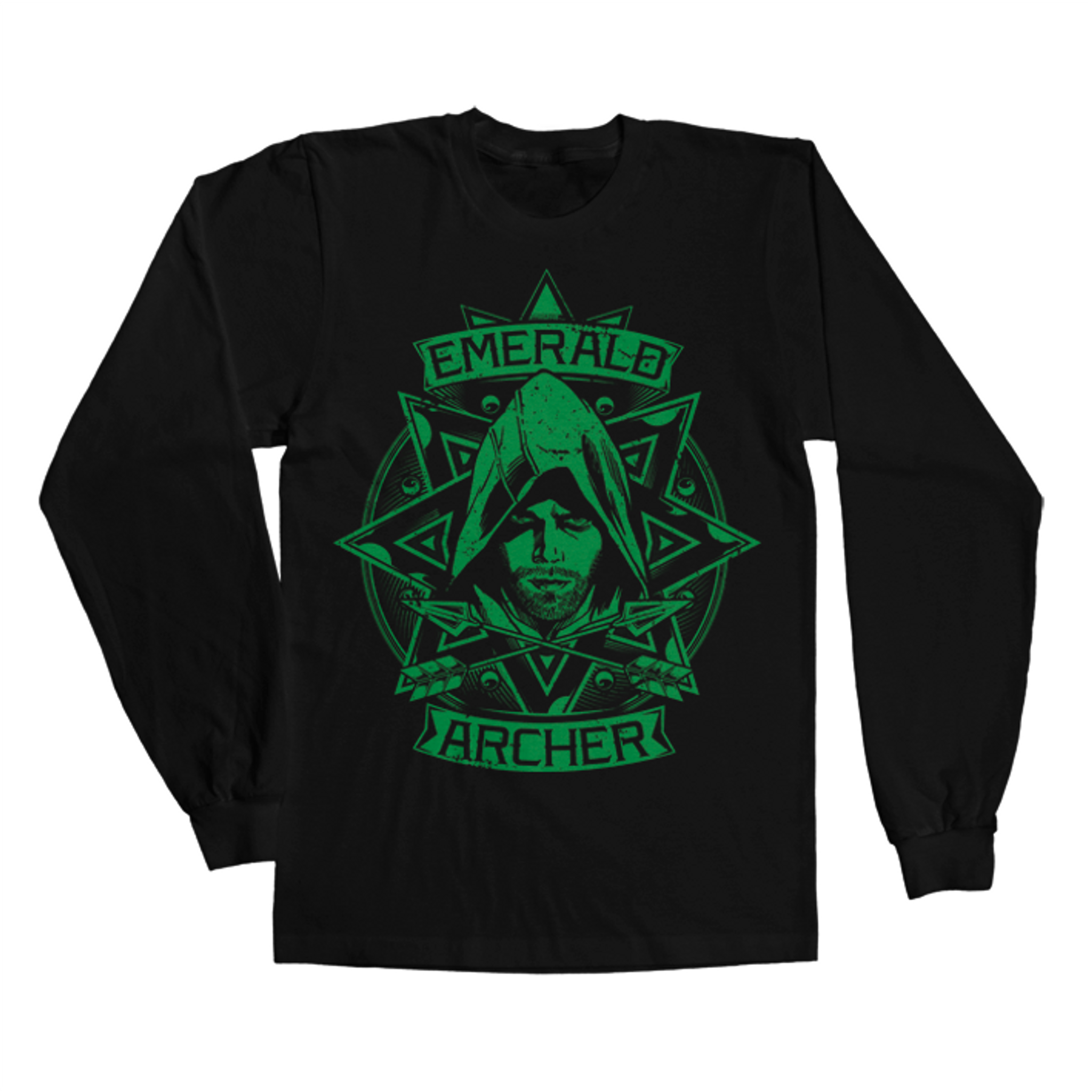 Arrow - Emerald Archer Long Sleeve Tee är en hyllning till en ikonisk karaktär som inte bara är en skicklig bågskytt, utan också en mystisk och stilig hjälte. Det geometriska mönstret och den gröna färgen ger en känsla av mystik och exklusivitet, samtidigt som de korslagda pilar och bågar antyder att han är mer än bara en bågskytt. Med en överdimensionerad smaragd som pryder hans ansikte visar denna t-shirt att han är en juvel bland superhjältarna. "EMERALD ARCHER" är inte bara en titel, utan ett varumärke för stilfull vigilantism.