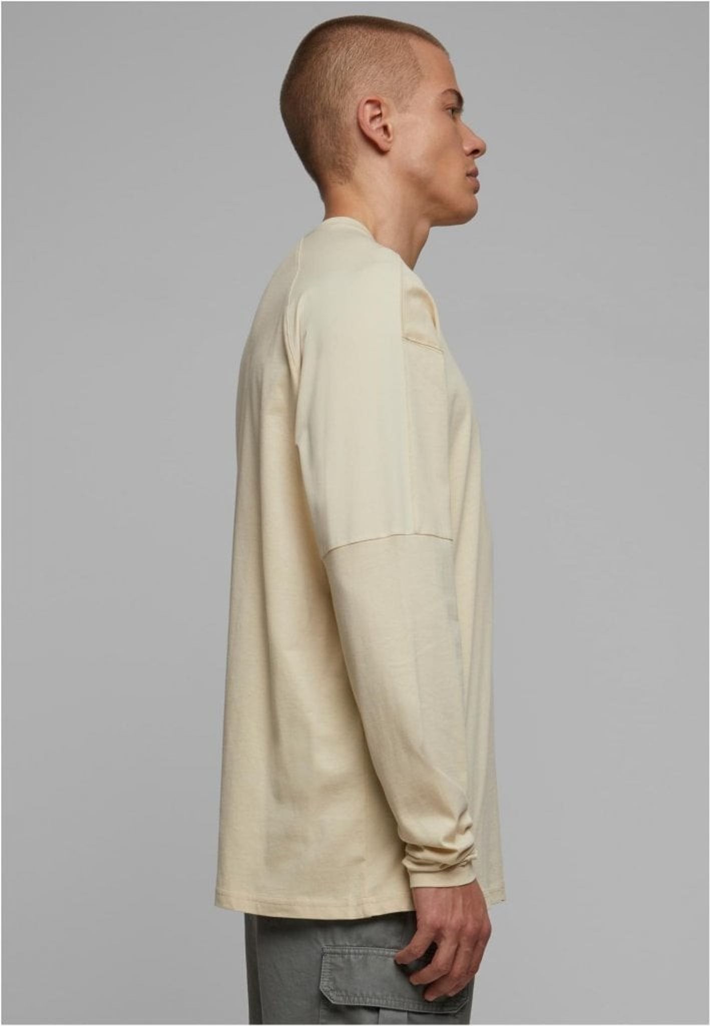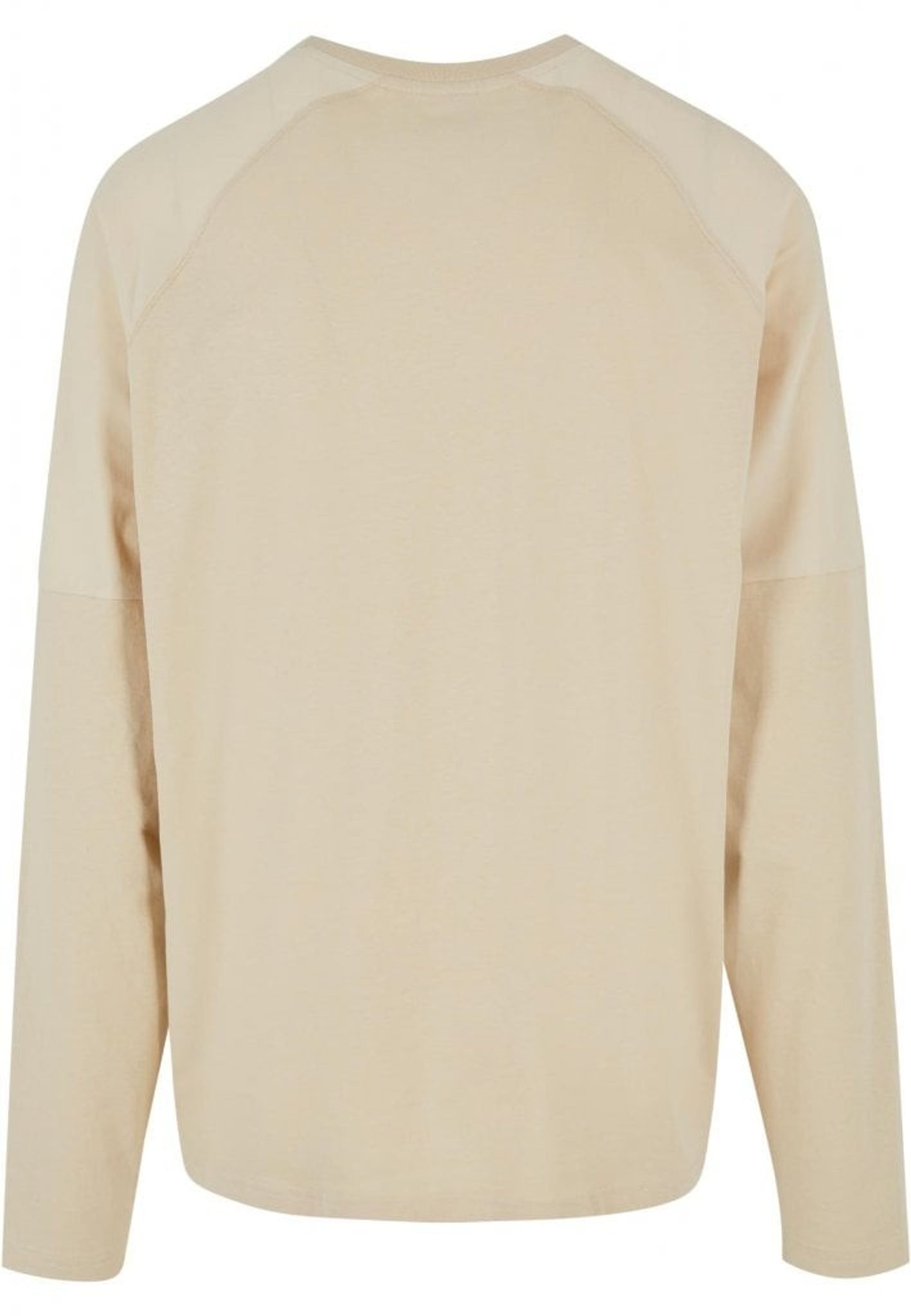 Den långärmade herrtröjan har en raglanformad rygg. En speciell egenskap är axlarna och baksidan av ärmarna som består av slät nylon, vilket bildar en intressant kontrast med den använda bomullen.