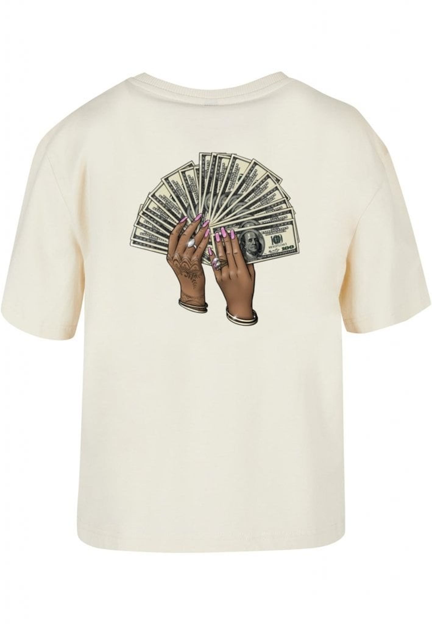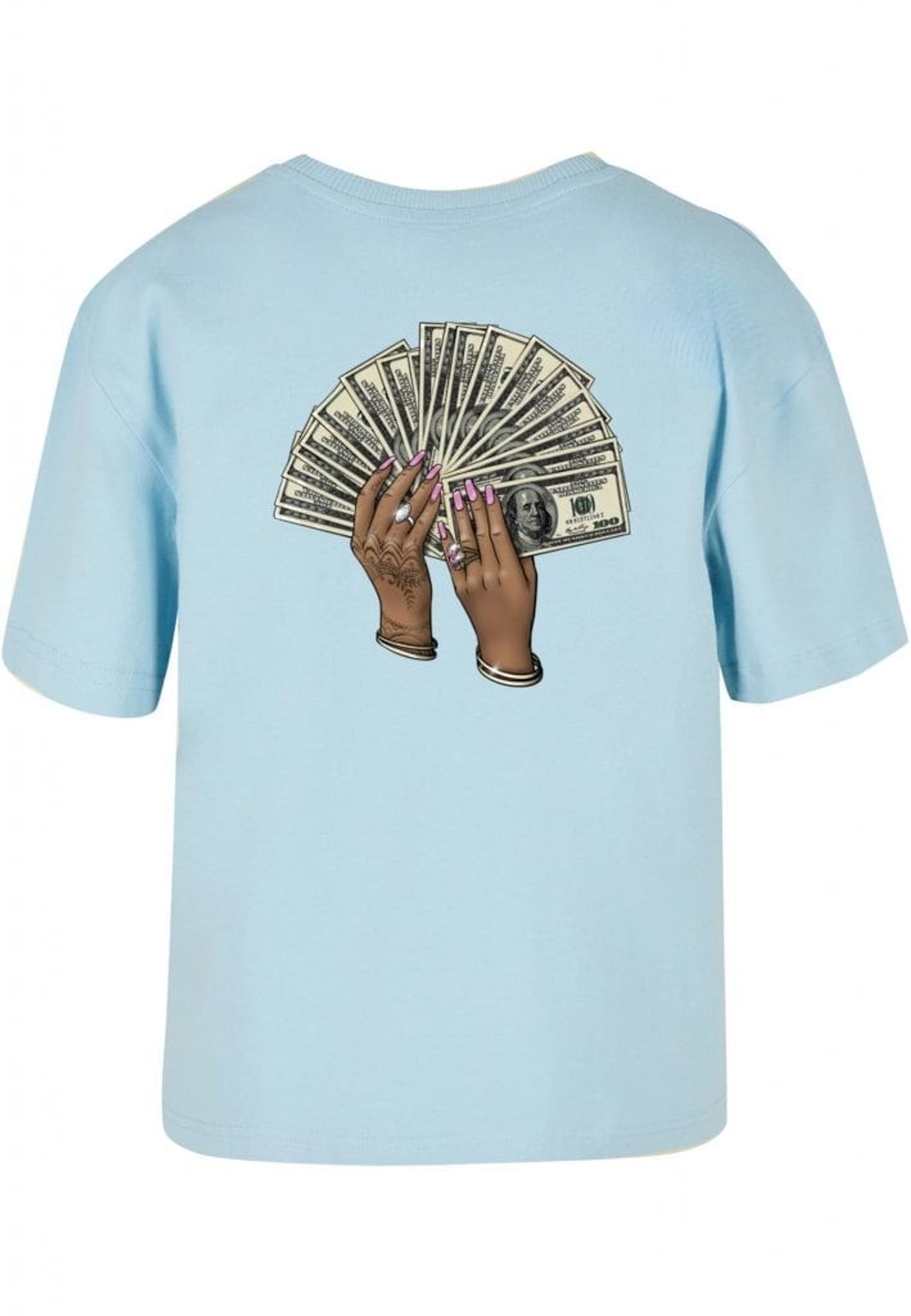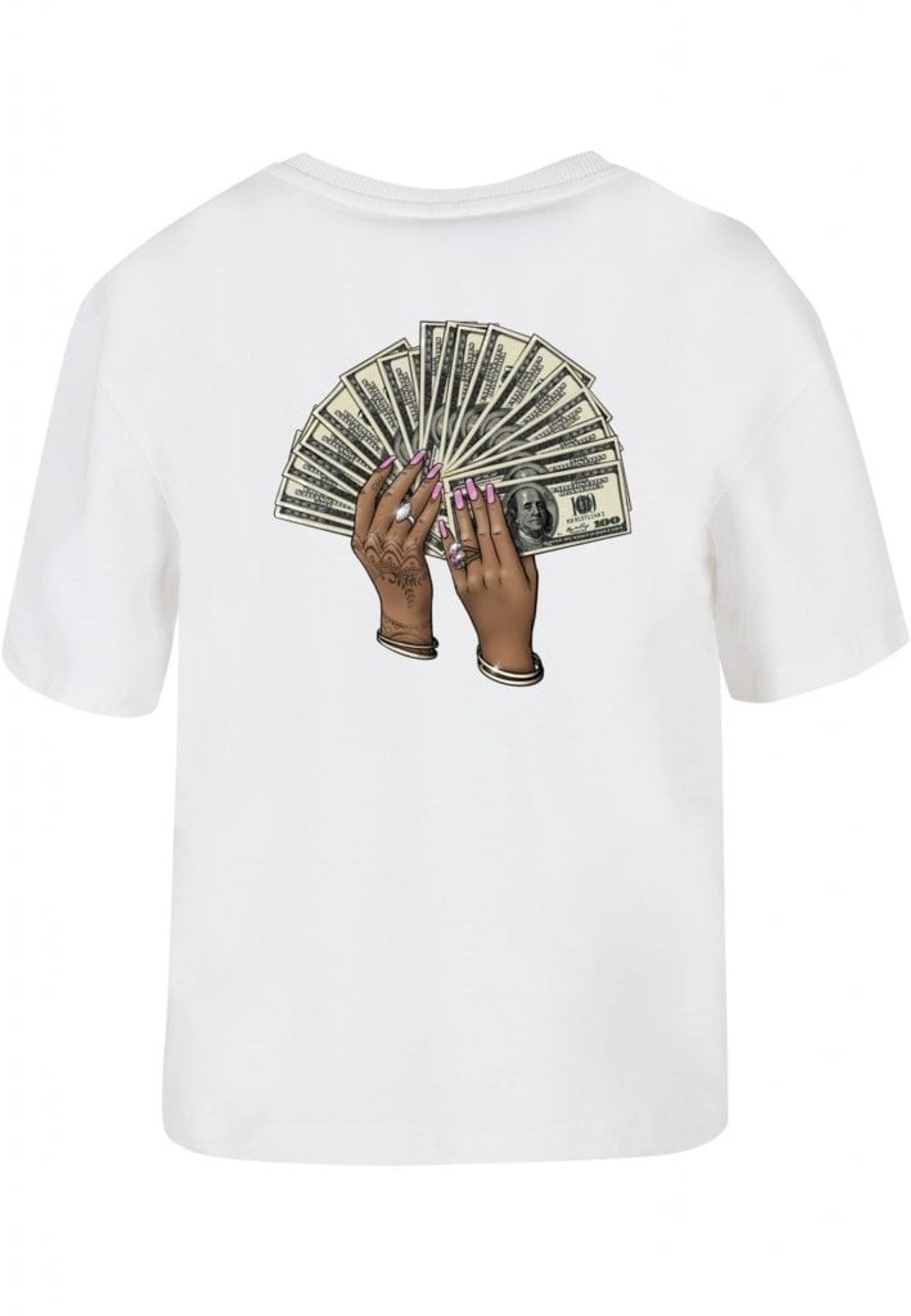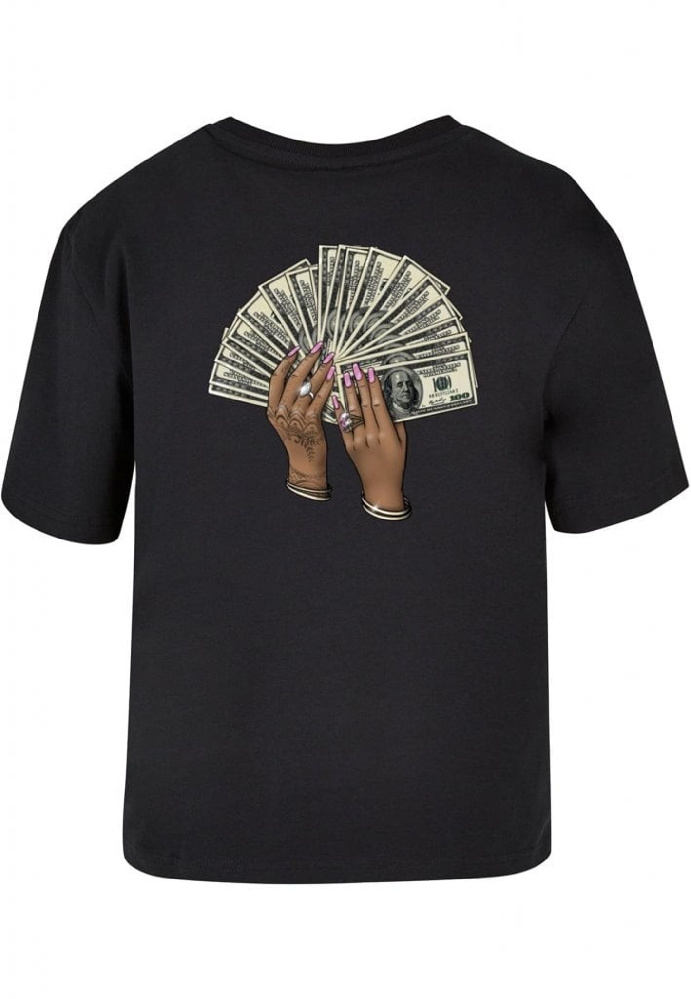 Plagget med motivet av två händer som håller en solfjäder av hundradollarsedlar är en riktig showstopper! Händerna är så detaljerat tecknade att du nästan kan känna rytmen av musiken. Med rosa nagellack, smycken och hennatatueringar är det en riktig bling-bling fest på ryggen!