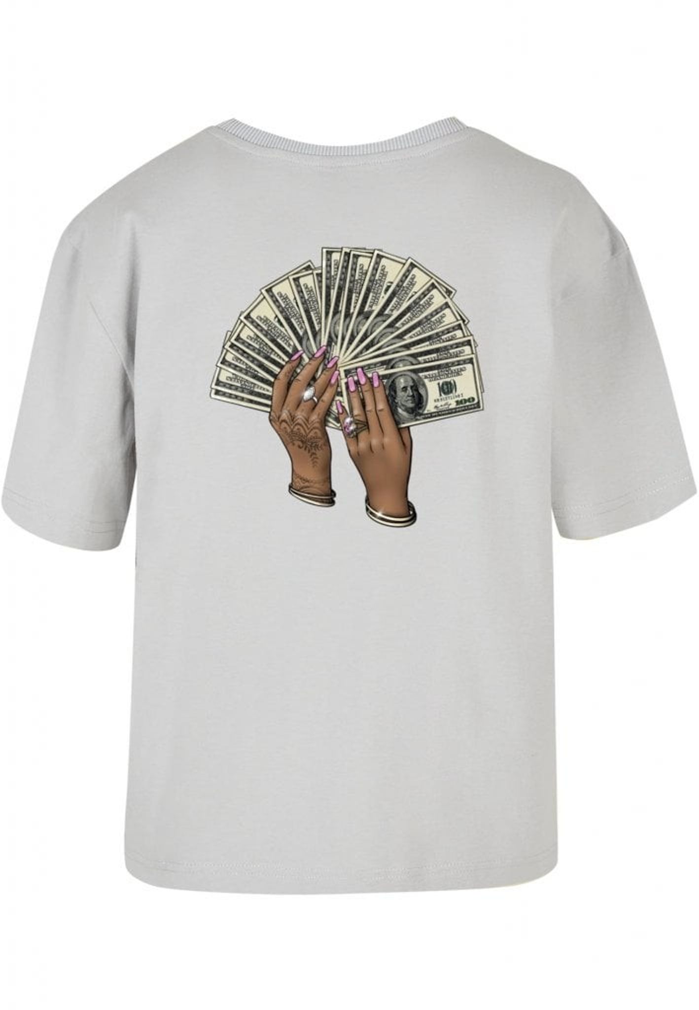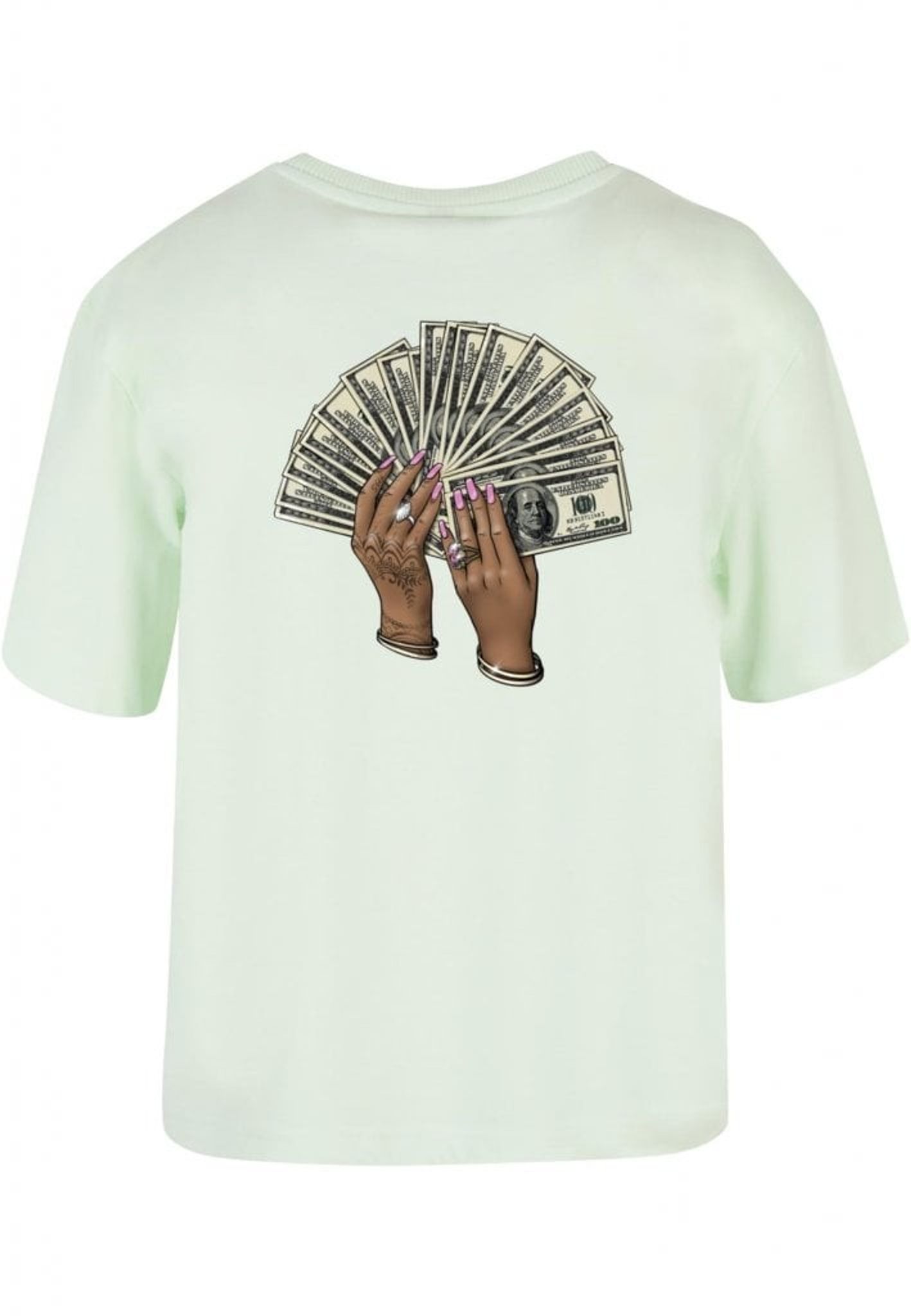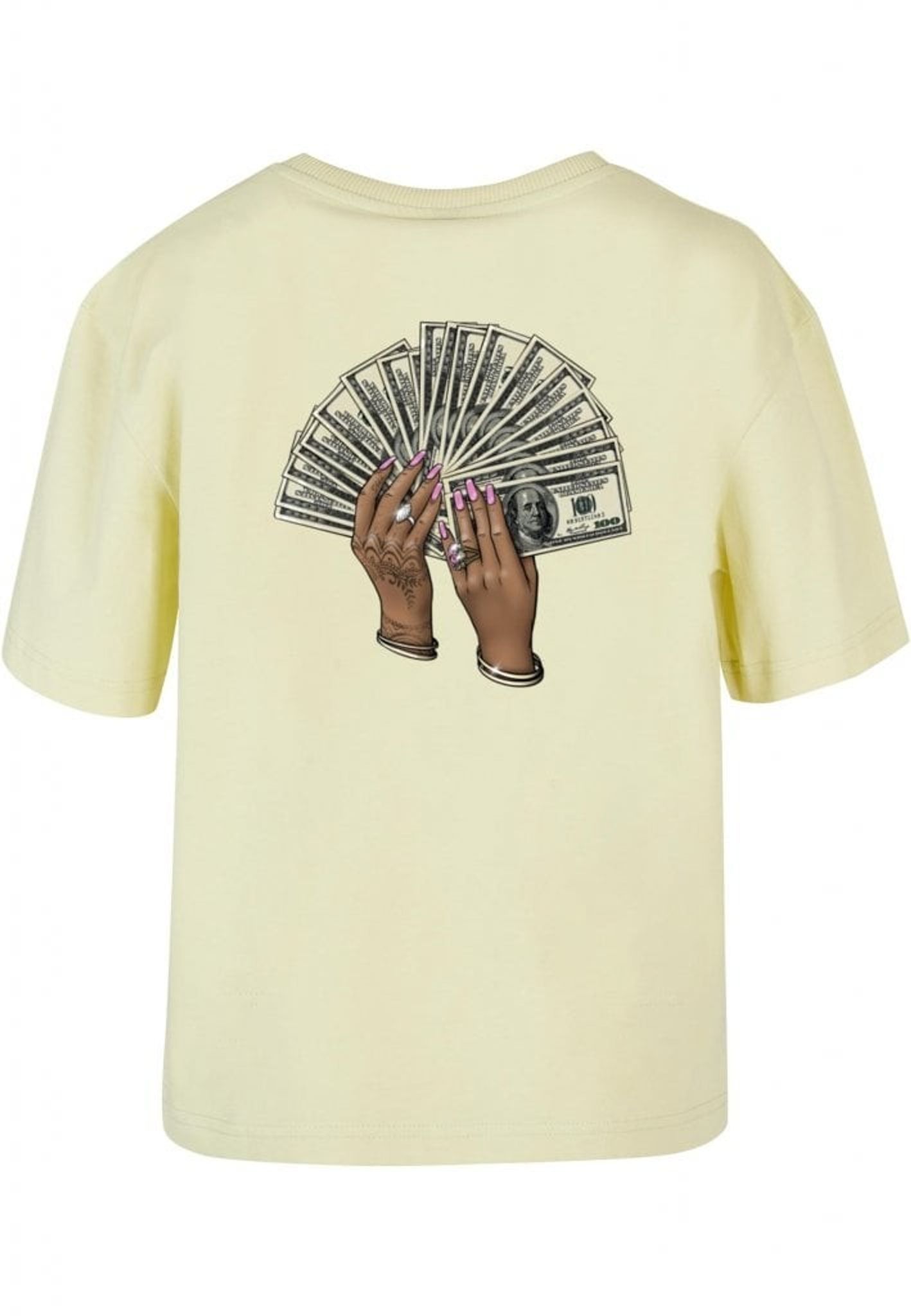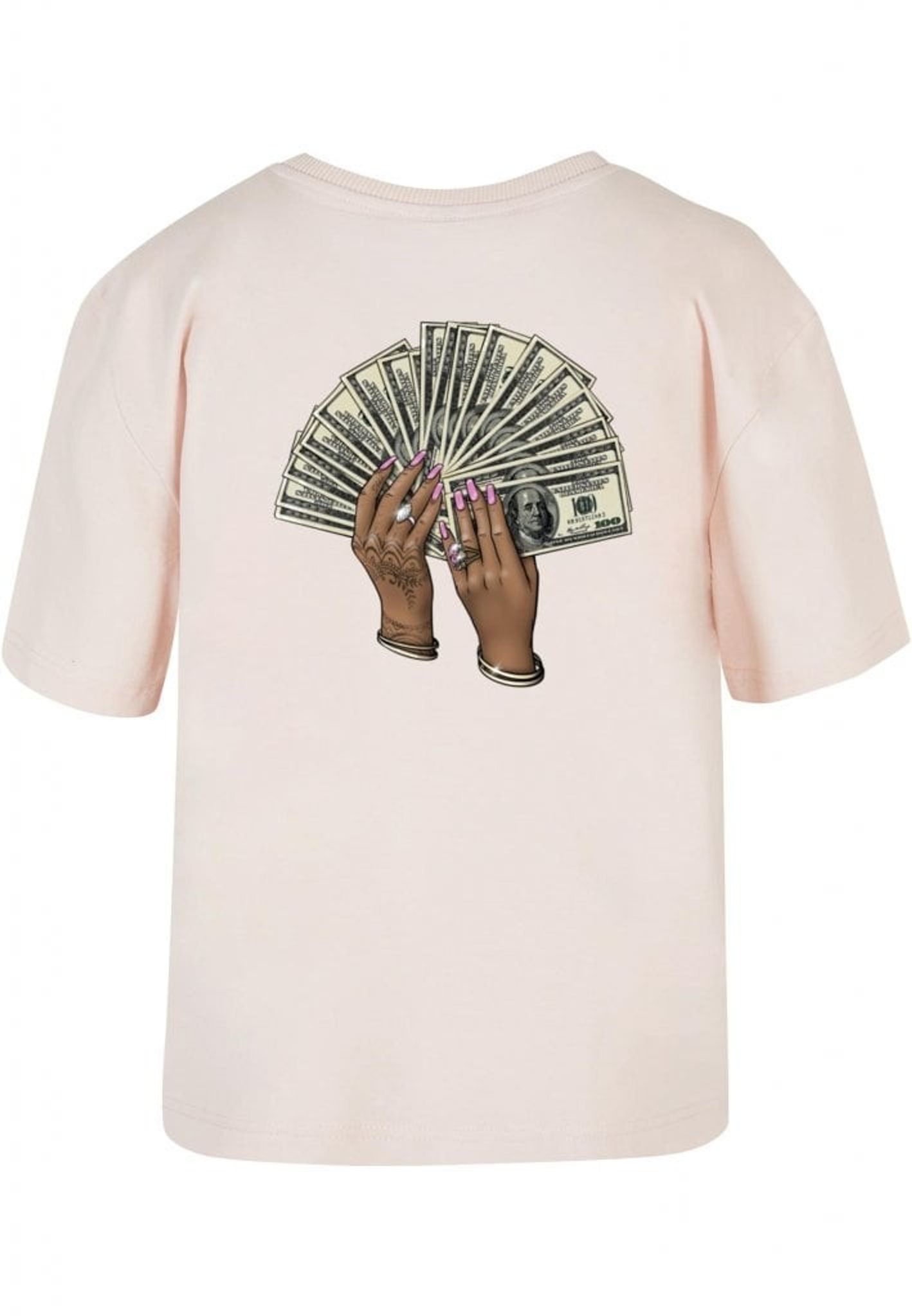 Plagget med motivet av två händer som håller en solfjäder av hundradollarsedlar är en riktig showstopper! Händerna är så detaljerat tecknade att du nästan kan känna rytmen av musiken. Med rosa nagellack, smycken och hennatatueringar är det en riktig bling-bling fest på ryggen!