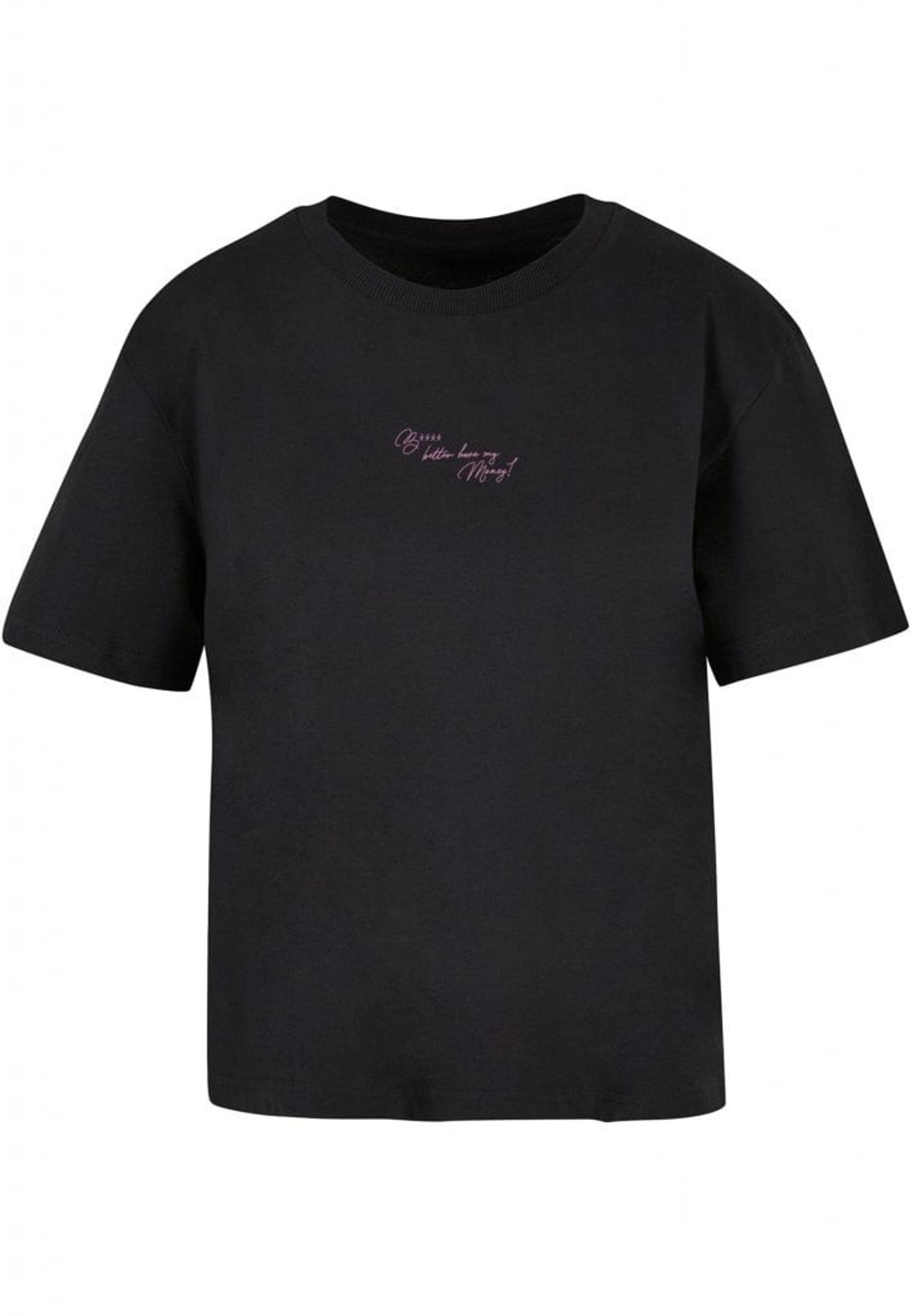 På framsidan av plagget hittar vi den ikoniska texten "B**** better have my Money!" skriven i en sassy rosa handstil. Placerad över bröstet, ger denna enkel och elegant design en touch av girl power till din outfit. Kontrasten mot den svarta bakgrunden gör verkligen att texten poppar!