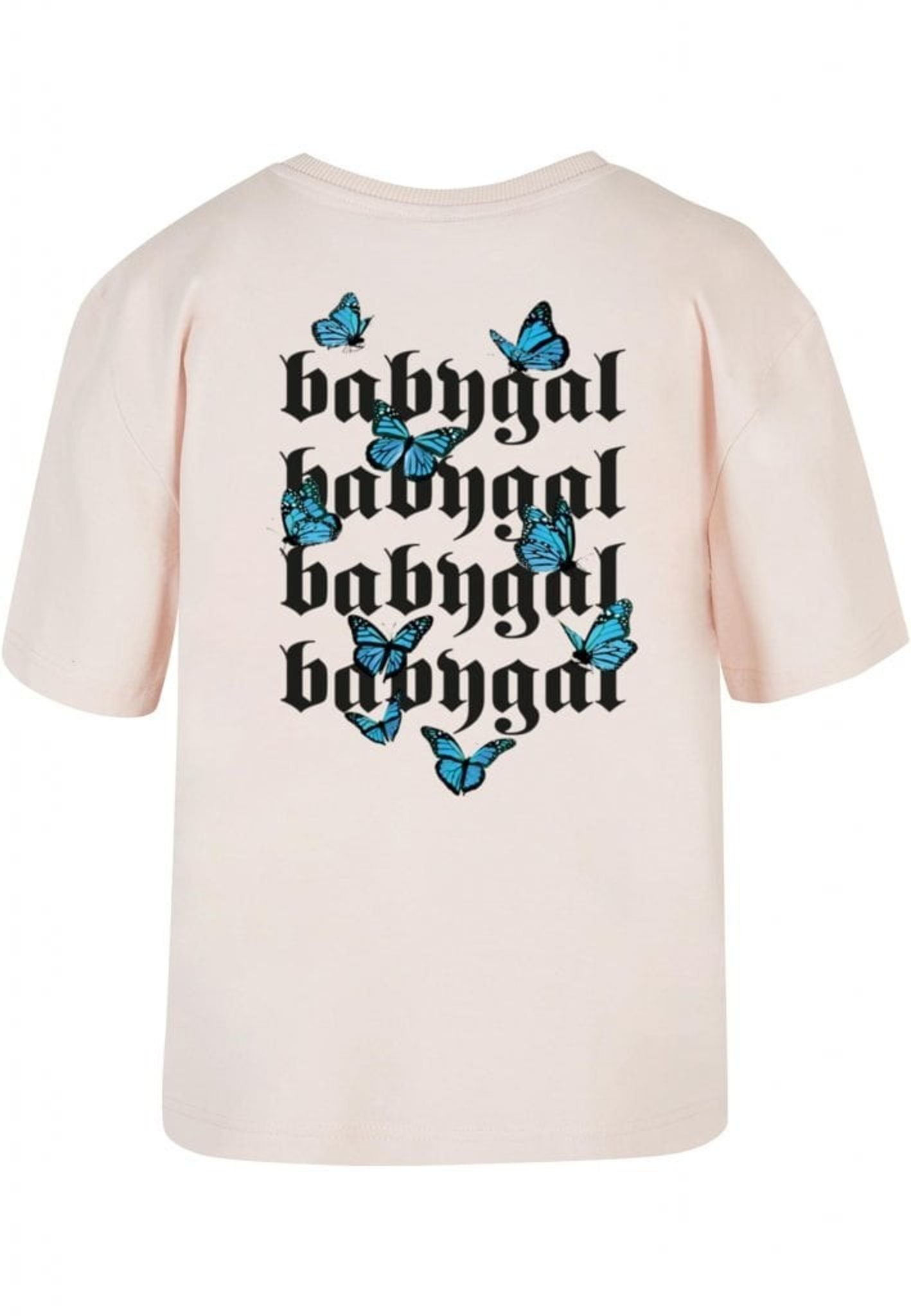 Har du någonsin drömt om att vara en riktig babygal? Nu kan du göra det med detta fantastiska plagg! Motivet på plagget visar ordet "babygal" skrivet fyra gånger i vertikal riktning, med ett gotiskt typsnitt i vit färg. Och låt oss inte glömma de blå fjärilarna som flyger runt texten, vilket verkligen ger designen en levande och dynamisk känsla.