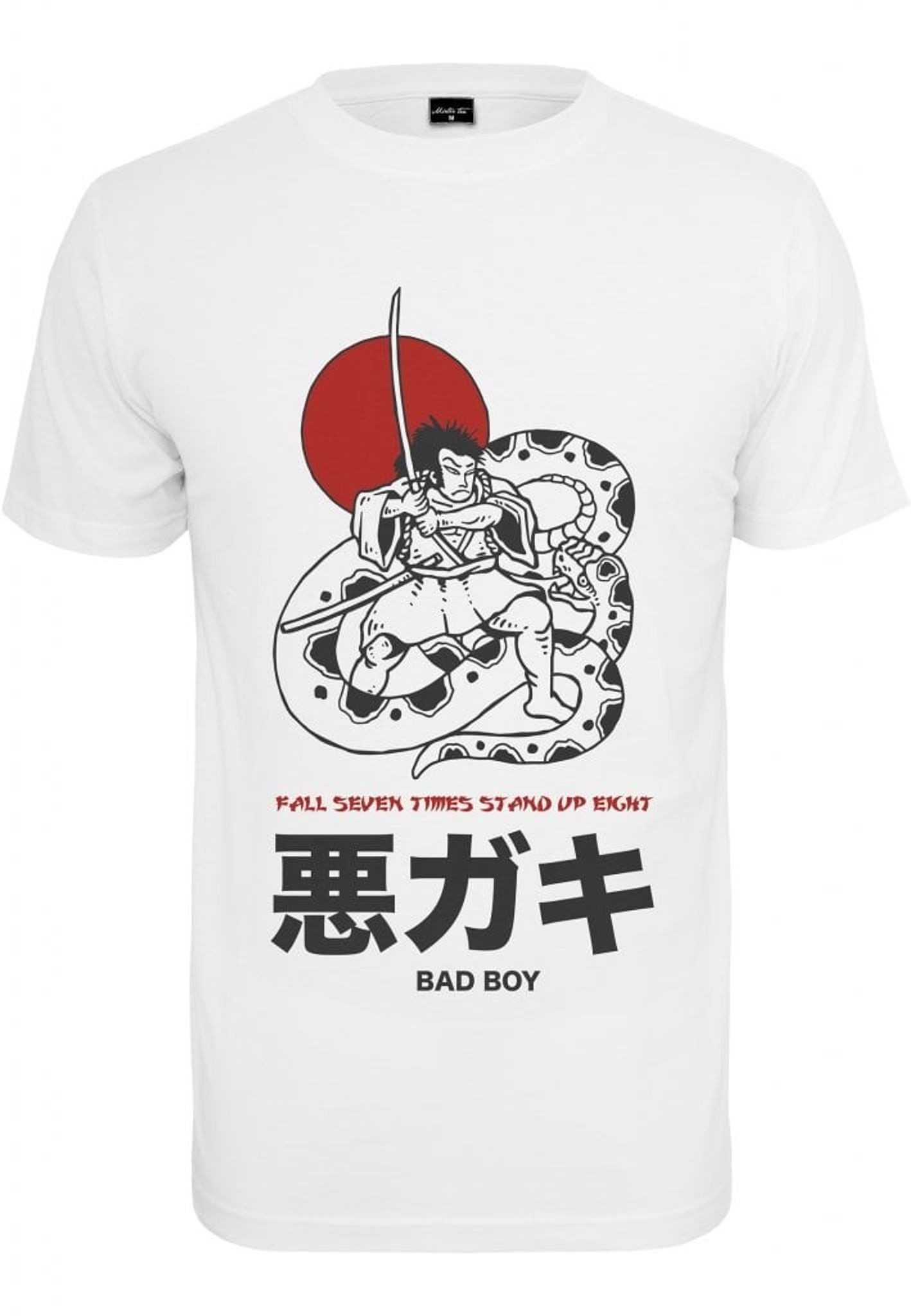 Framsidan av denna vita tee presenterar en dynamisk illustration av en samuraj i stridshållning, framhävd mot en solnedgångsröd cirkel, som symboliserar Japans flagga. Under illustrationen står det inspirerande citatet "Fall Seven Times Stand Up Eight" tillsammans med japanska tecken som betyder "Bad Boy".