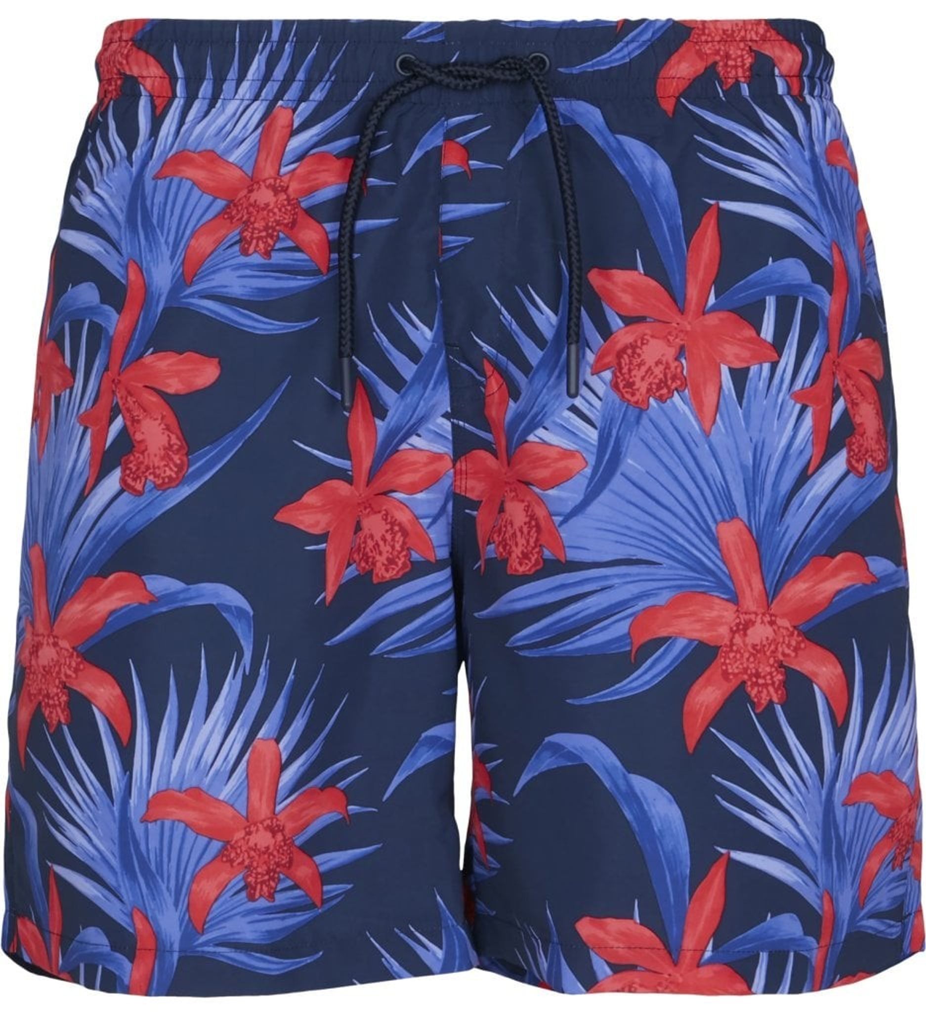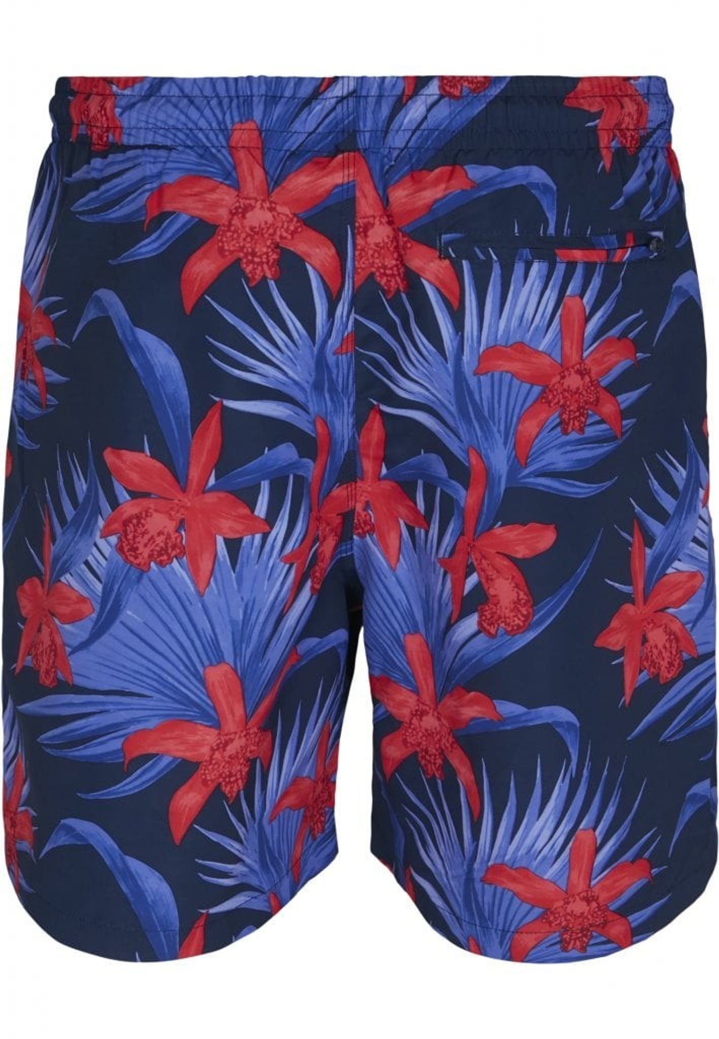 Ett par mörkblå badshorts med blommor i rött och ljusare blå nyans.