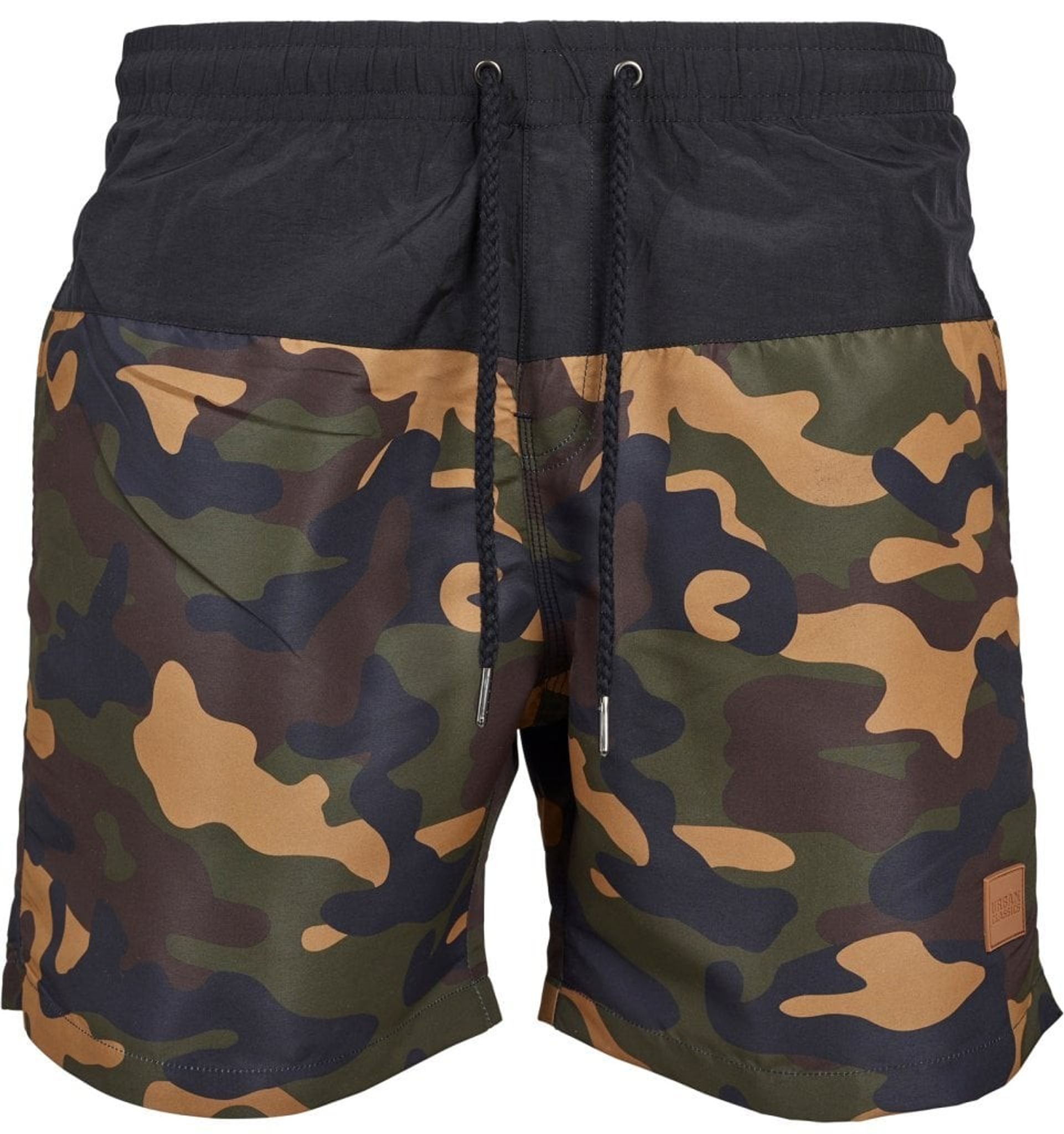 Ett par riktigt sköna badshorts i två olika tyger där den ena delen är svart och den andra delen bryter till ett läckert woodcamo-mönster.