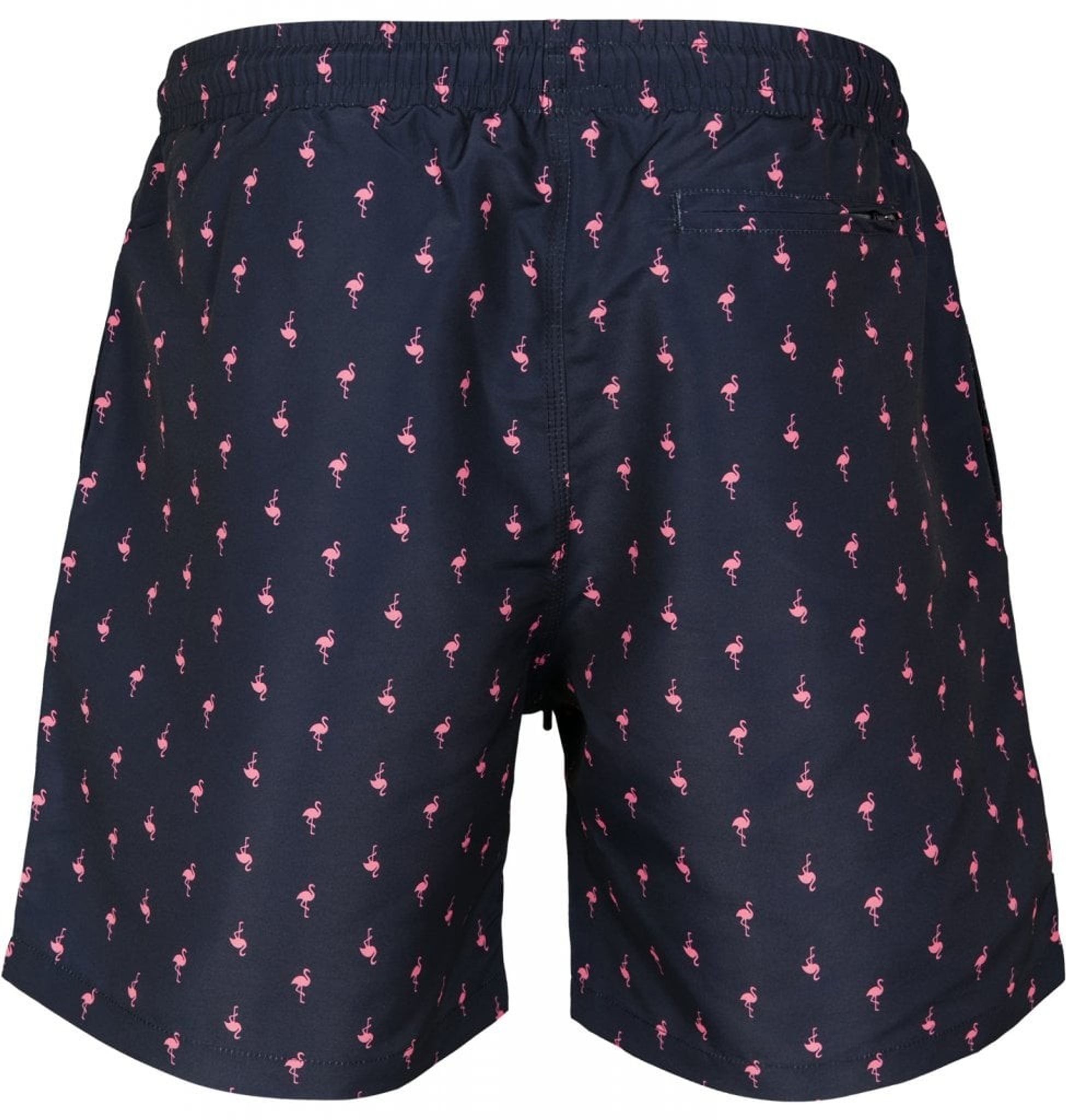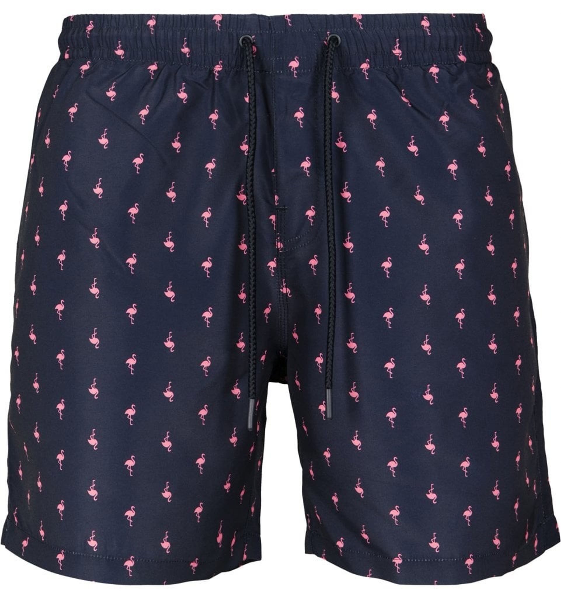 Ett par riktigt fräcka och trendiga marinblå badshorts med rosa flamingos i rader runtom. Det krävs en riktig man för att bära dessa urläckra badshorts med flamingos.