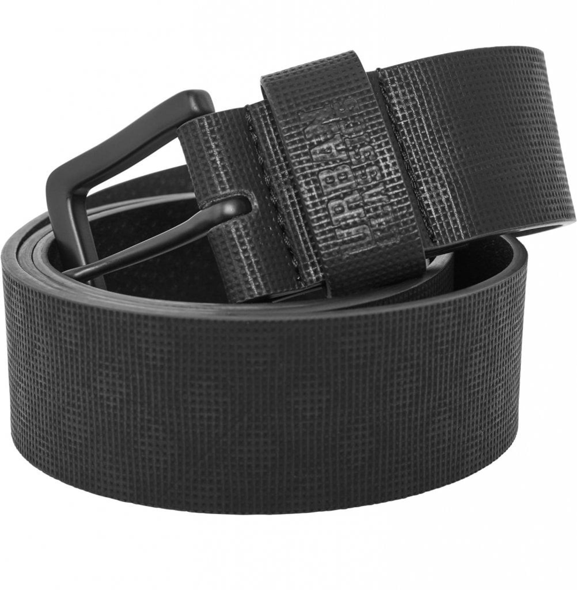 Ett svart snyggt bälte i konstläder med ett rutmönster över hela bältet.