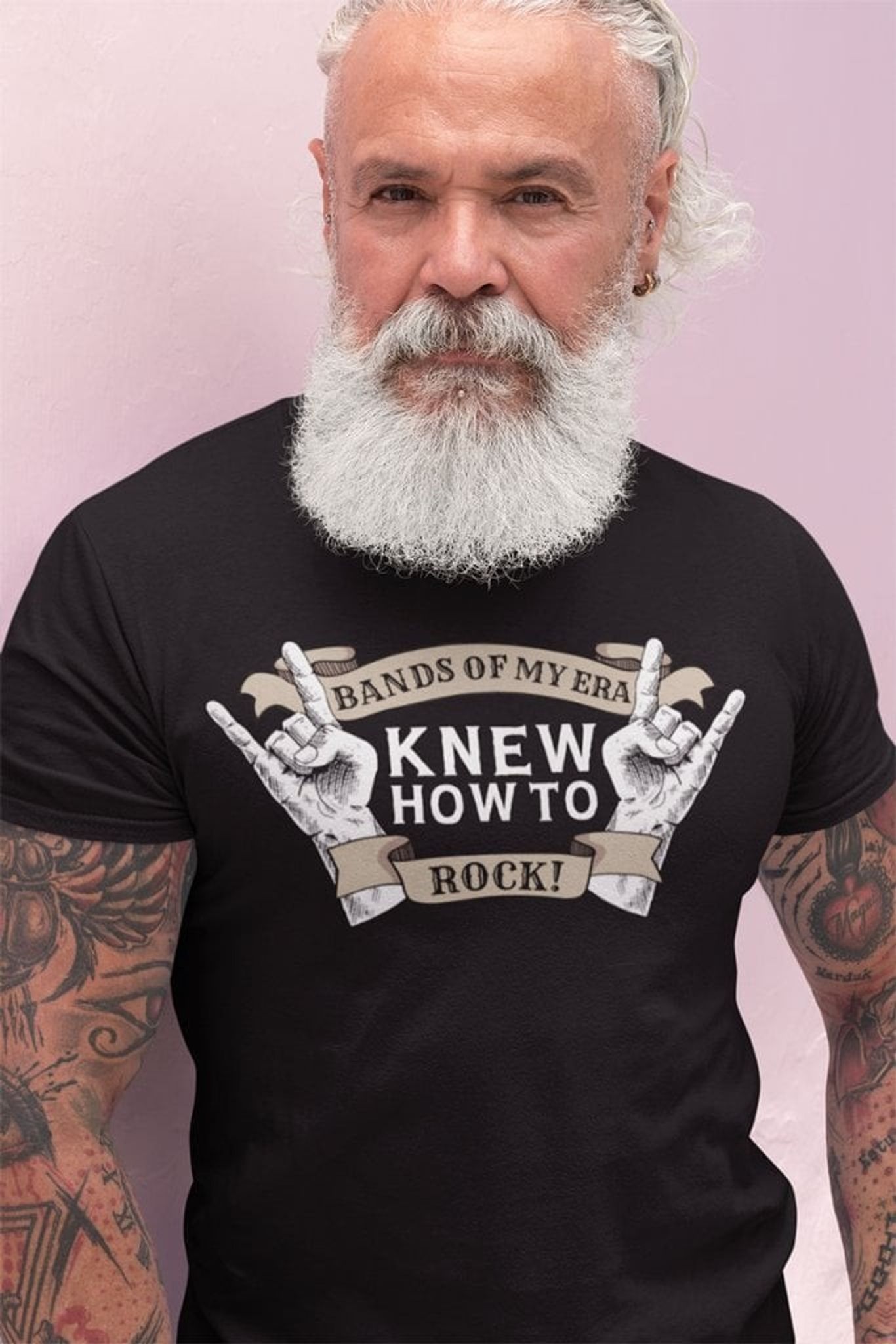En skön T-shirt med tryck över hela bröstet. Trycket har texten "Bands of my era knew how to rock!" och denna text kombineras med två bandaroller och "rockhänder".