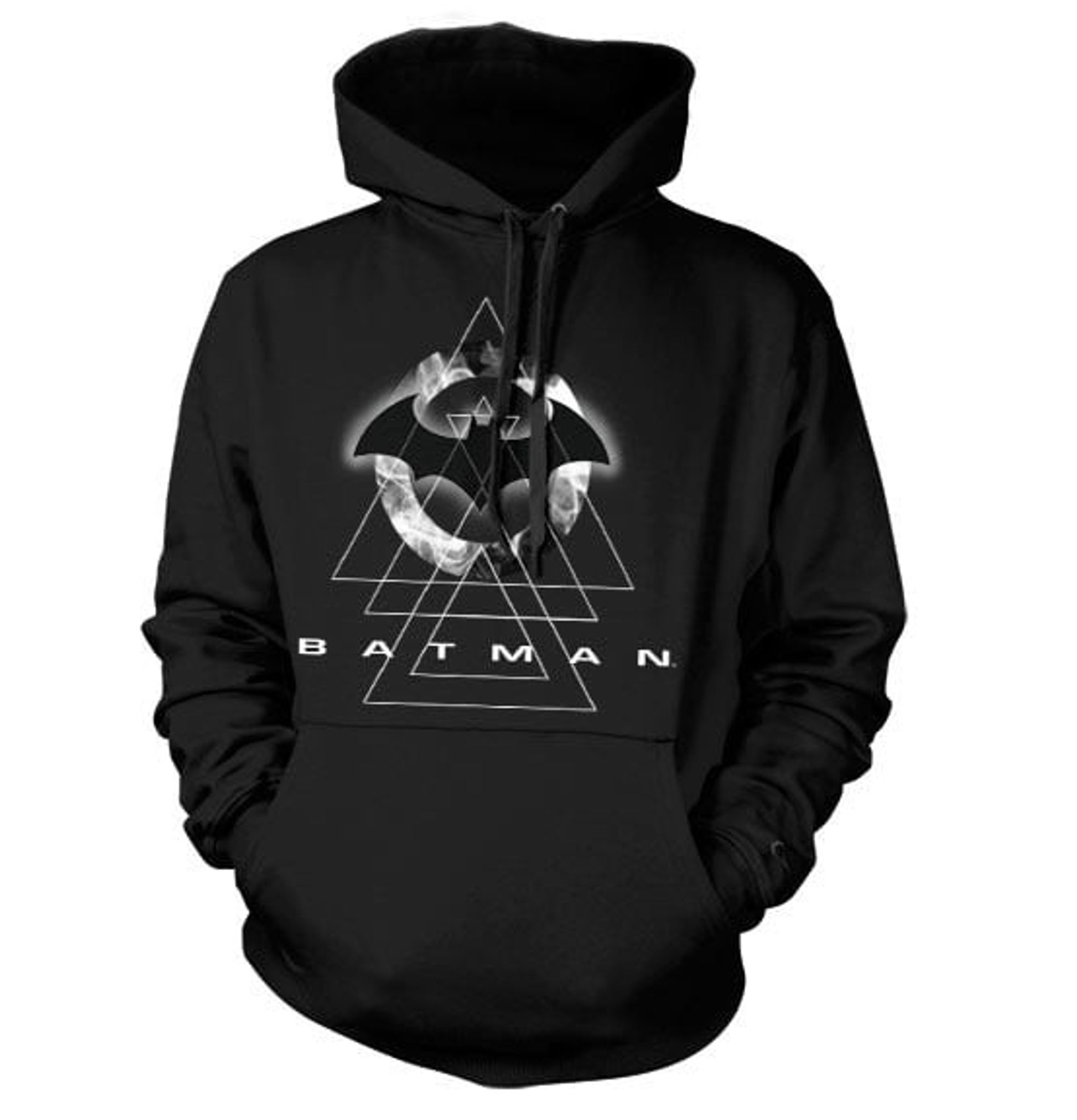 En mystisk fladdermus virvlar i en geometrisk dimension, inbäddad i en rökliknande virvel och vilandes i en triangel - en tolkning av Batmans ikoniska logotyp. Med kraftfulla bokstäver står "BATMAN" nedanför, som om det vore en neonskylt i Gotham Citys skyline. Denna mystiska huvtröja är en påminnelse om hjältens kärlek till sina leksaker och det faktum att man aldrig bör blanda sin tvätt med hans - den svarta färgen är omöjlig att få bort. En perfekt present för alla Batman-fans. "I am vengeance, I am the night, I am Batman."
