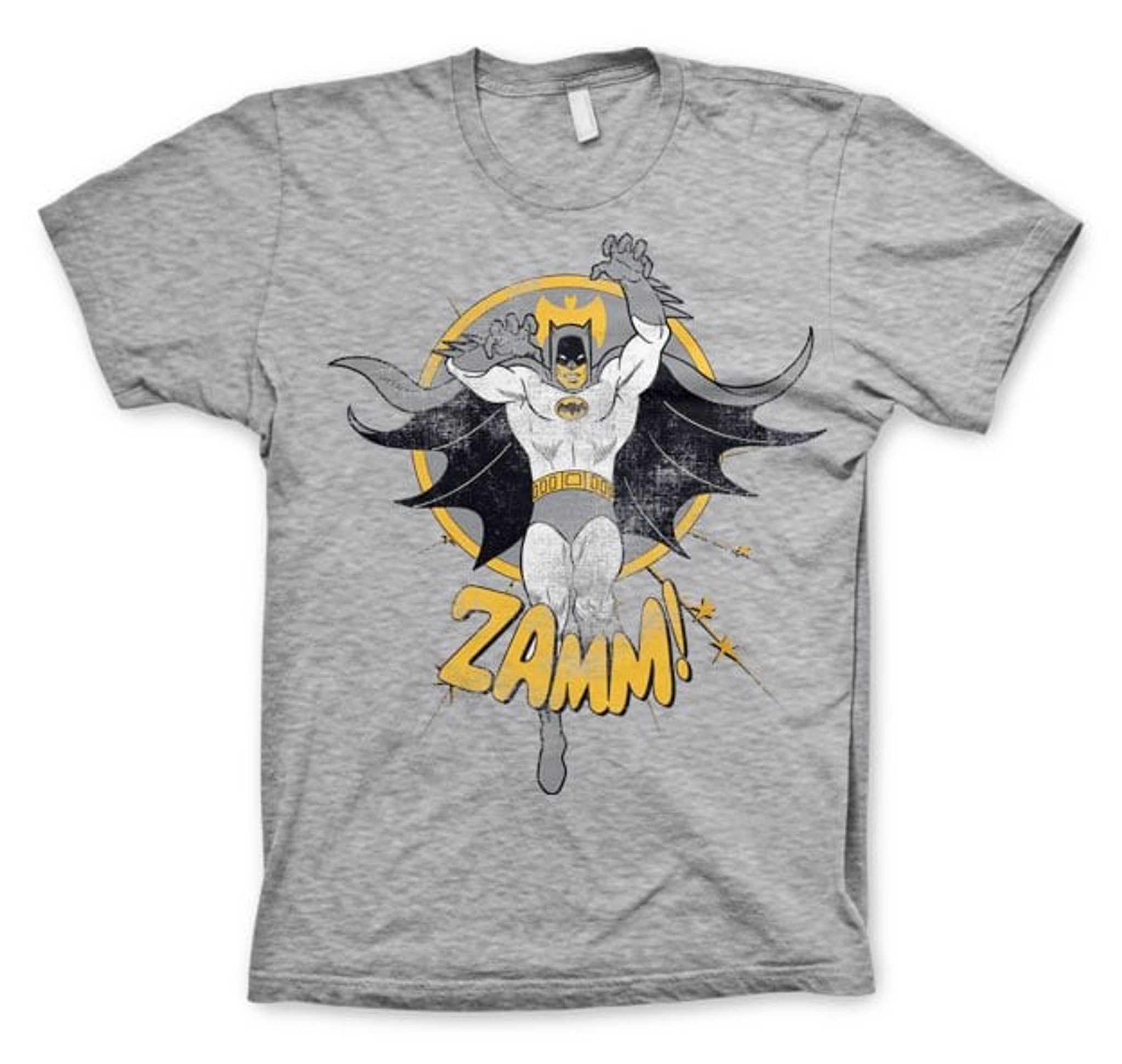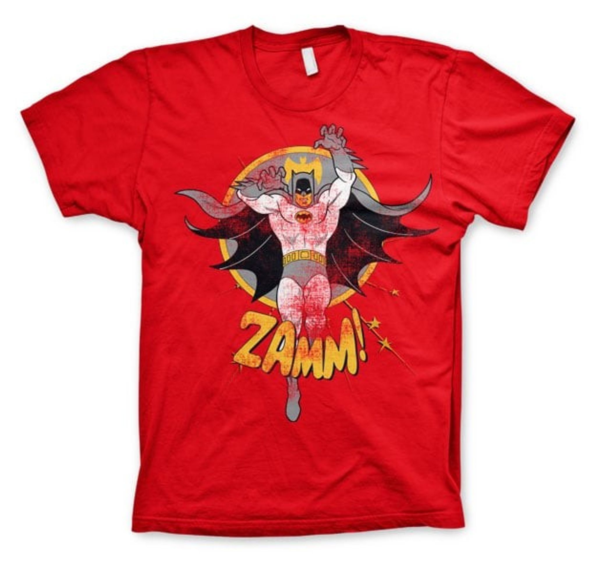 Detta Batman Zamm! T-shirt motivet är en hyllning till den ikoniska superhjälten och signalerar en nostalgisk återgång till serietidningarnas gyllene era. Med orden "ZAMM!" som en påminnelse om en tid då brottsbekämpning var enklare och män bar masker utan ironi.