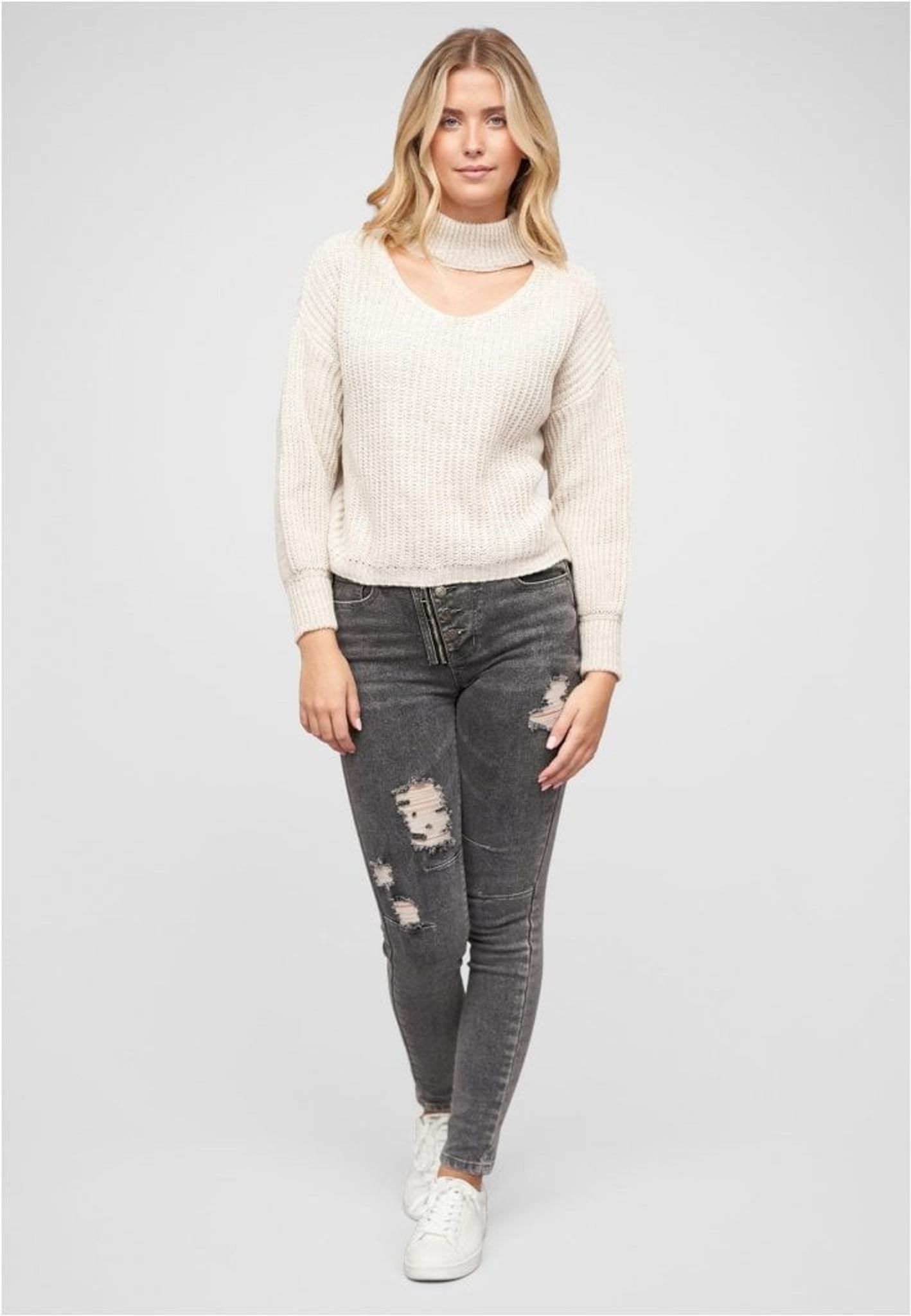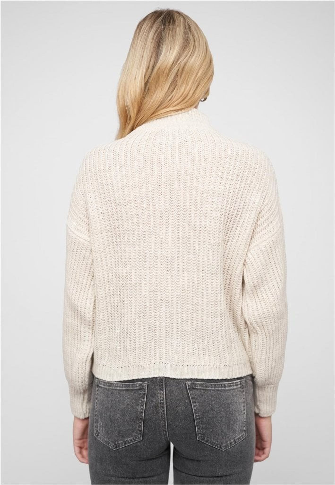Upptäck vår eleganta beige pullover med ståkrage och V-ringning. Den är tillverkad av 100% akryl, vilket ger en mjuk och behaglig känsla mot huden.