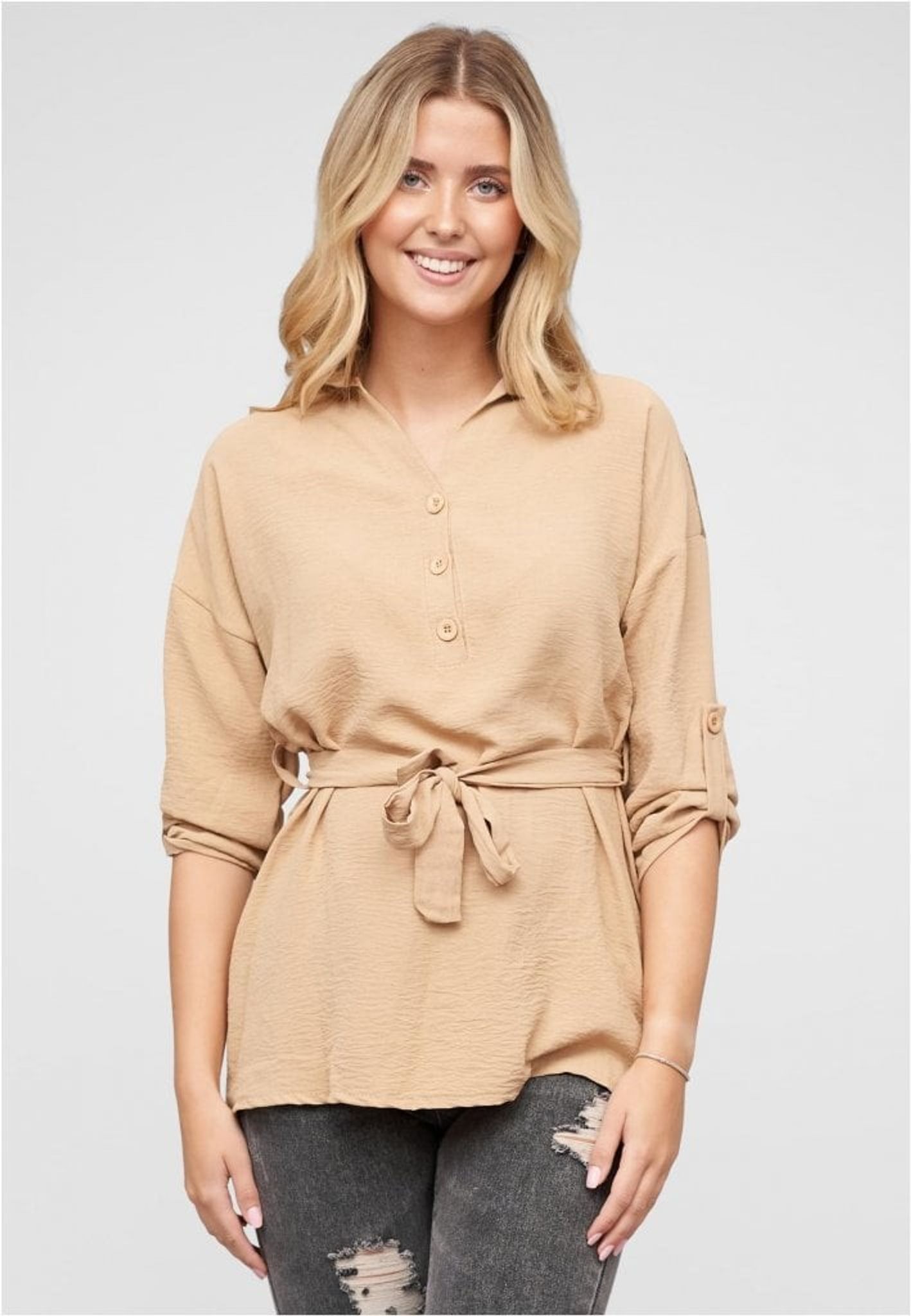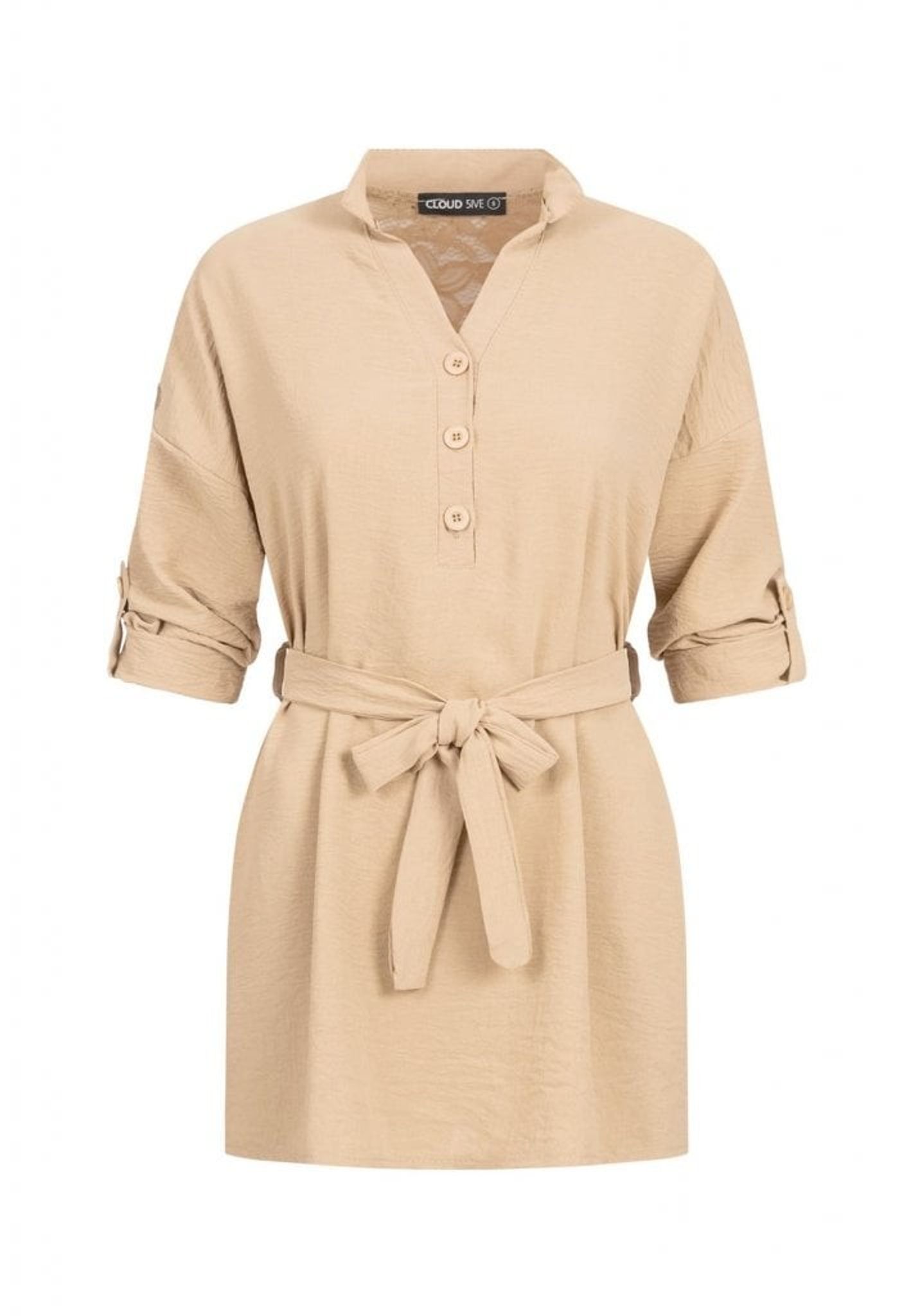 Upptäck vår eleganta beige tunika med knytmidja, perfekt för både vardag och fest. Denna tunika är tillverkad av 100% polyester, vilket ger en skön och lätt känsla. Det stiliga bindedetaljen i midjan framhäver din figur och ger en feminin siluett.