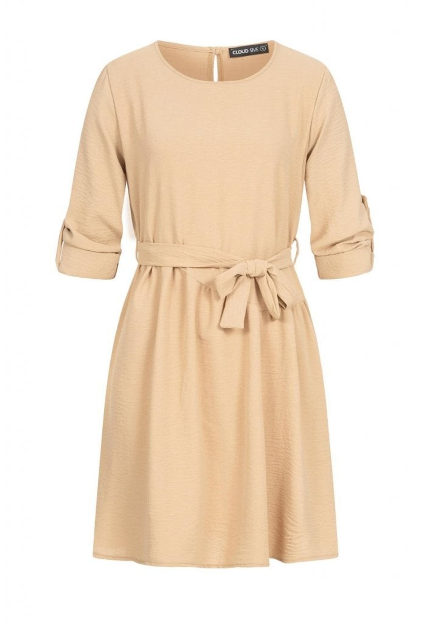 Upptäck den eleganta Beige Turn-Up Klänningen från Cloud5ive. Denna klänning är tillverkad i högkvalitativ polyester som ger en mjuk och bekväm känsla.