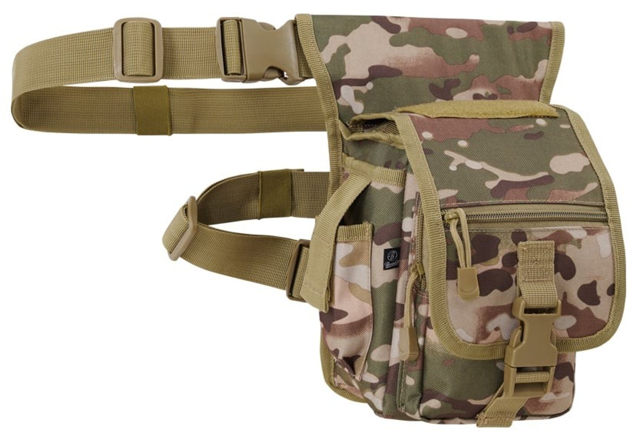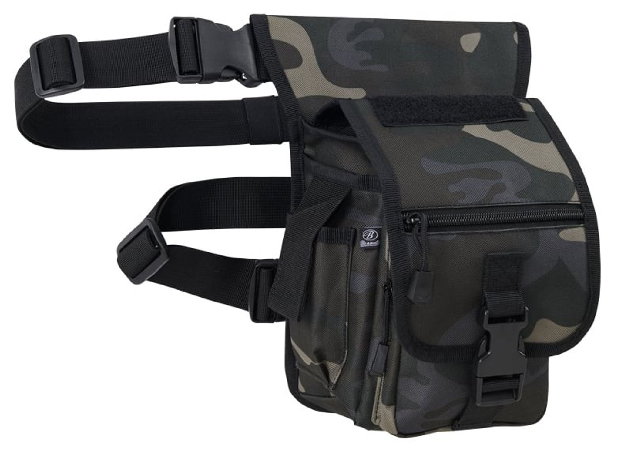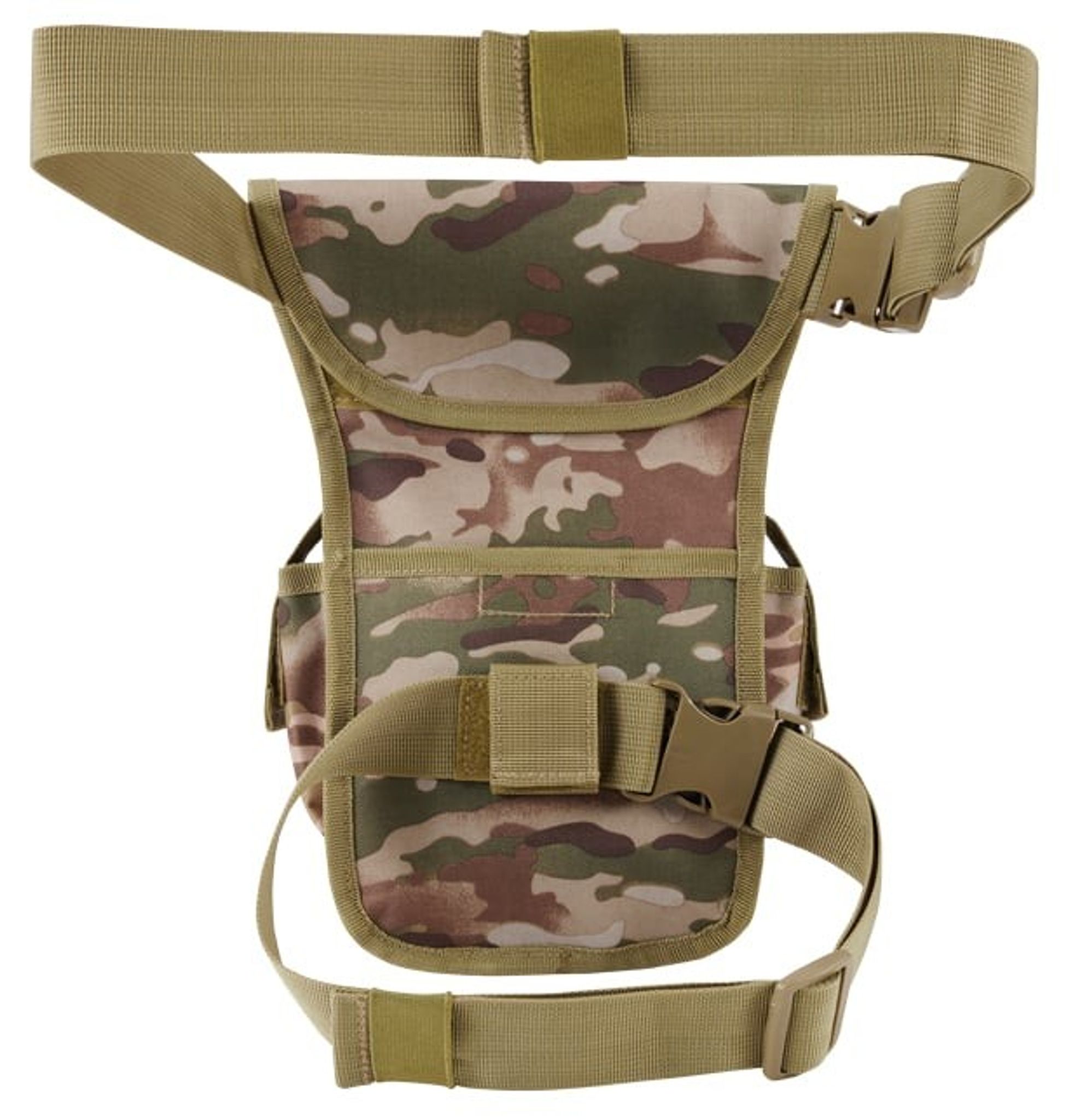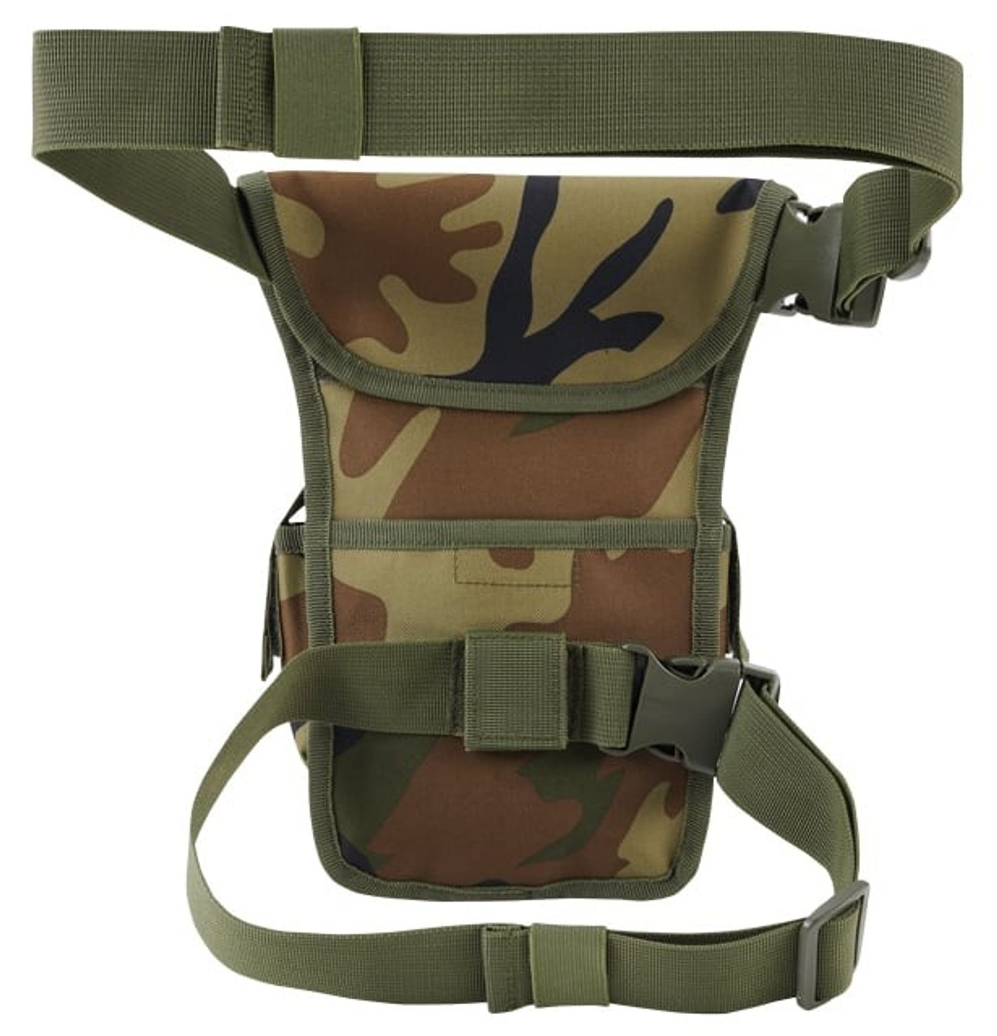 En praktisk benväska i kamouflagemönster. Väskan fäster du runt midjan och ena benet med remmar. Väskan har två sidofack, stort huvudfack, fack på baksidan, två mindre fack framtill samt ett fack ovanpå locket.