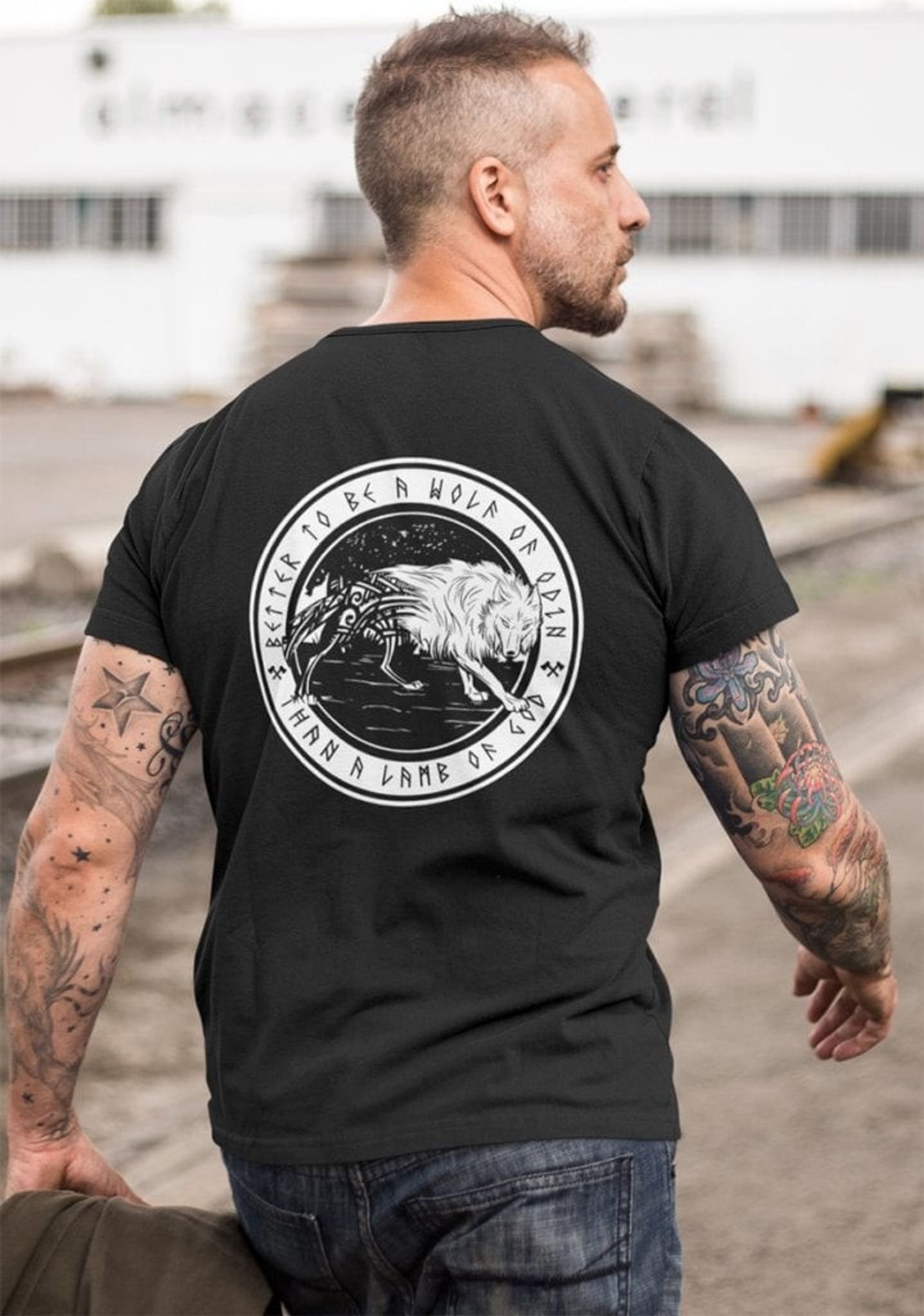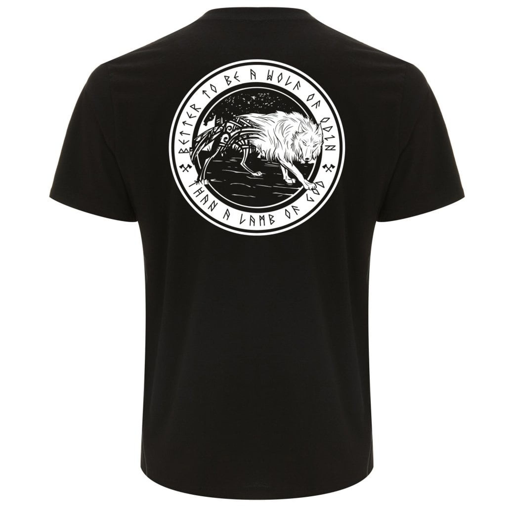 En snygg T-shirt från Insomnia clothing med en varg tryckt i en cirkel med texten "Better to be a wolf of Odin, than a lamb of God".