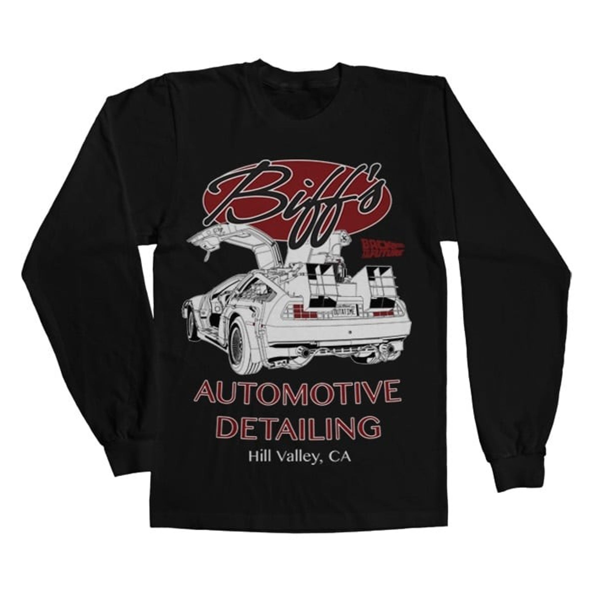 Det nostalgiska motivet på Biff's Automotive Detailing Long Sleeve Tee tar oss tillbaka till den ikoniska DeLorean från filmen Back to the Future. Detaljerat avbildas den legendariska bilen med tidscirkulationsutrustning och den ikoniska "OUTATIME" registreringsskylten.