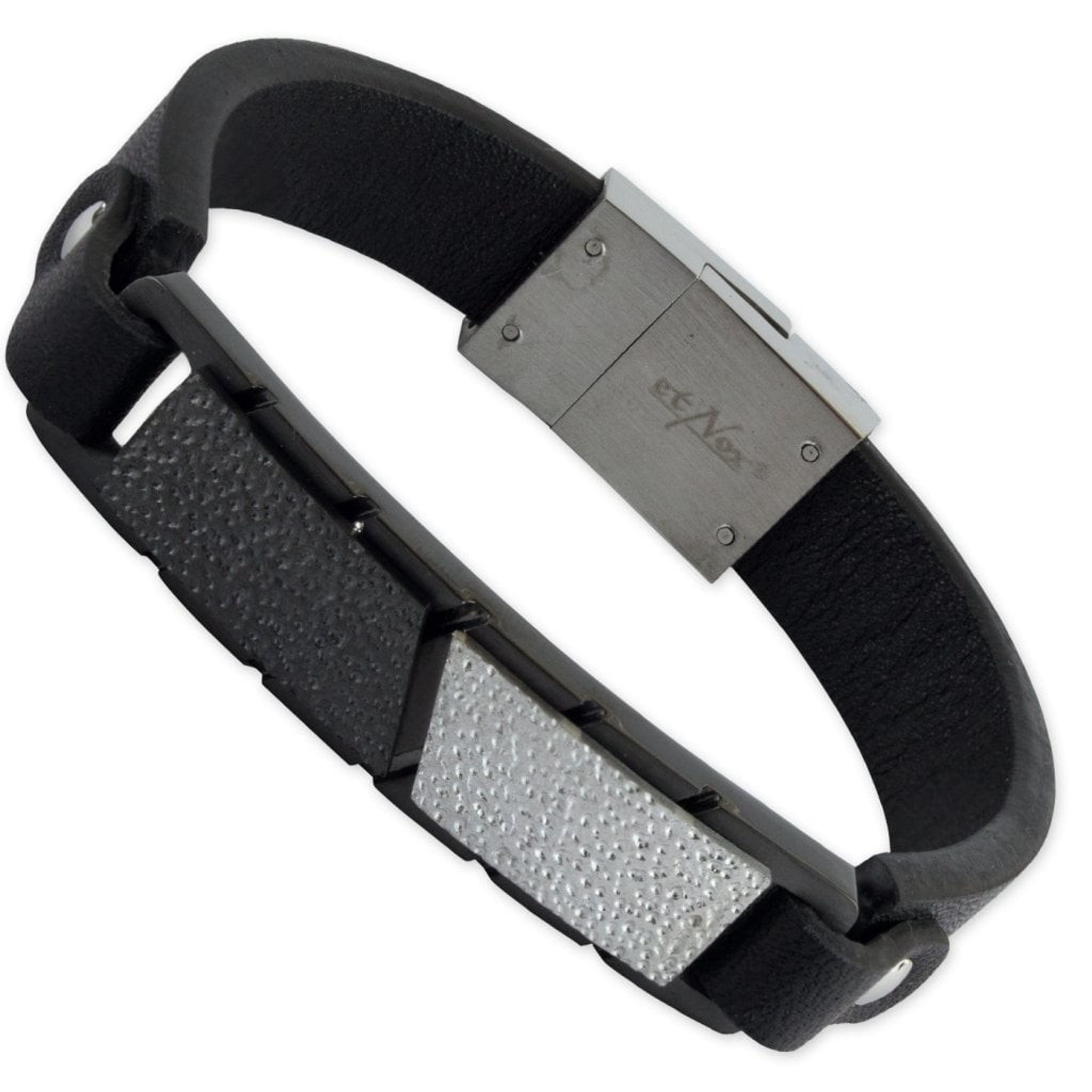 Ett stilfullt läderamband med två brickor i rostfritt stål där den ena brickan är svart och den andra brickan är vit.