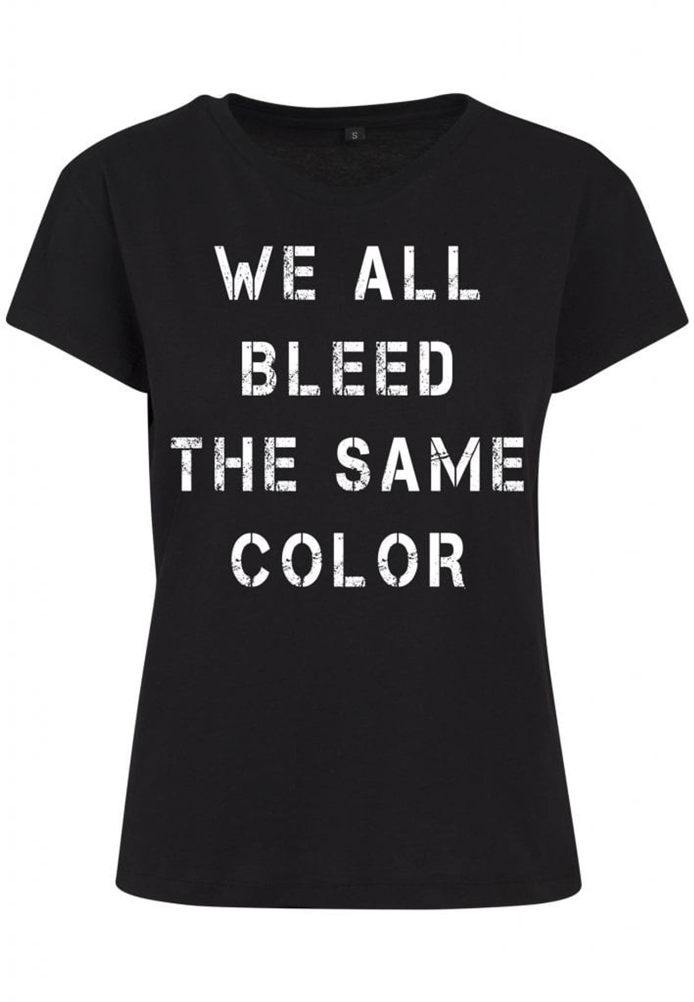Denna svarta t-shirt för damer är inte bara ett plagg, det är ett budskap om att vi alla är lika. Med texten "WE ALL BLEED THE SAME COLOR" framför säger den att vi alla är människor, oavsett hur vi ser ut.
