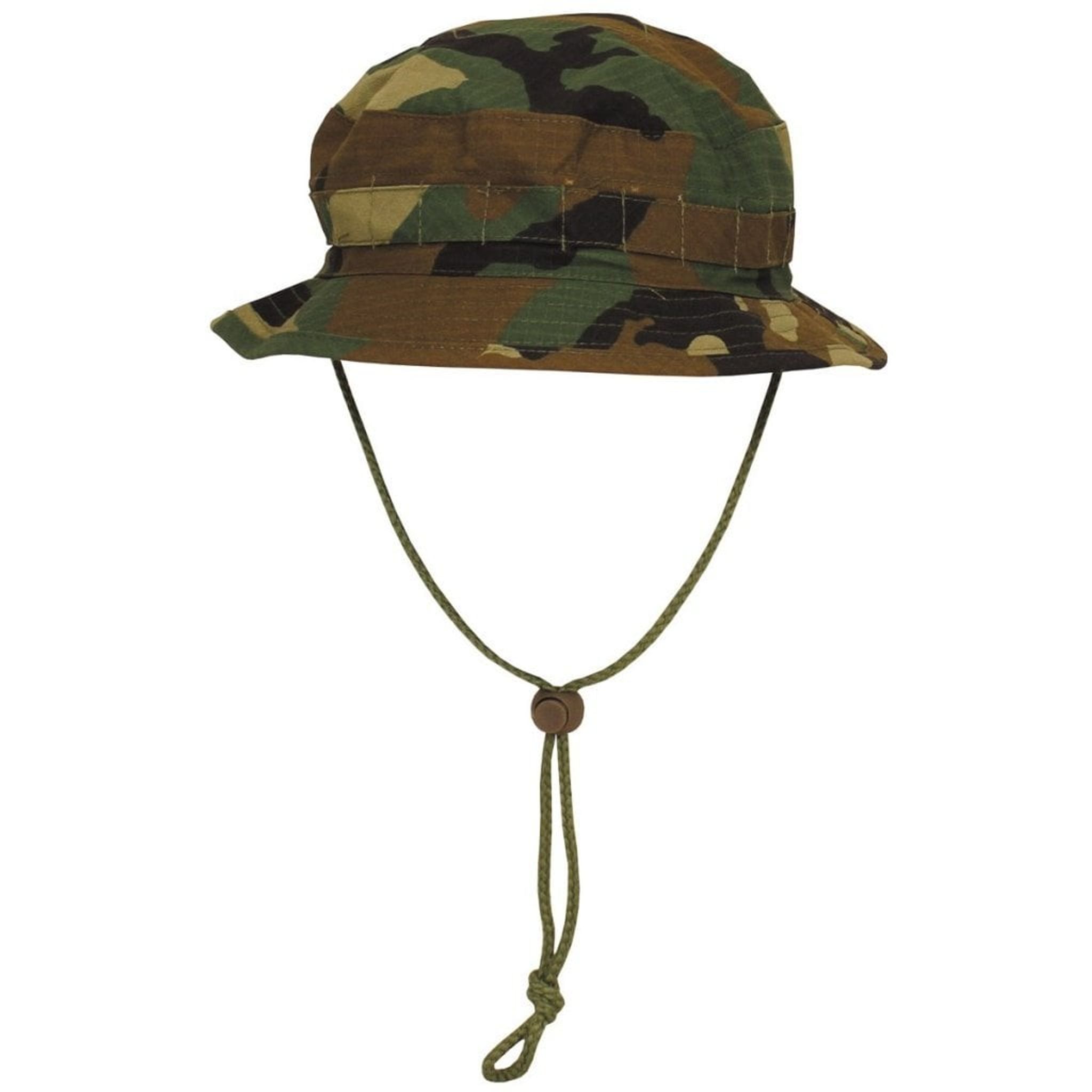 Tyghatt med rund form och ett klassiskt woodland-kamouflage.