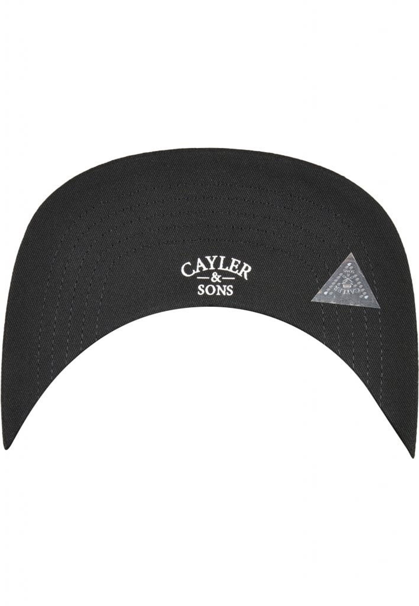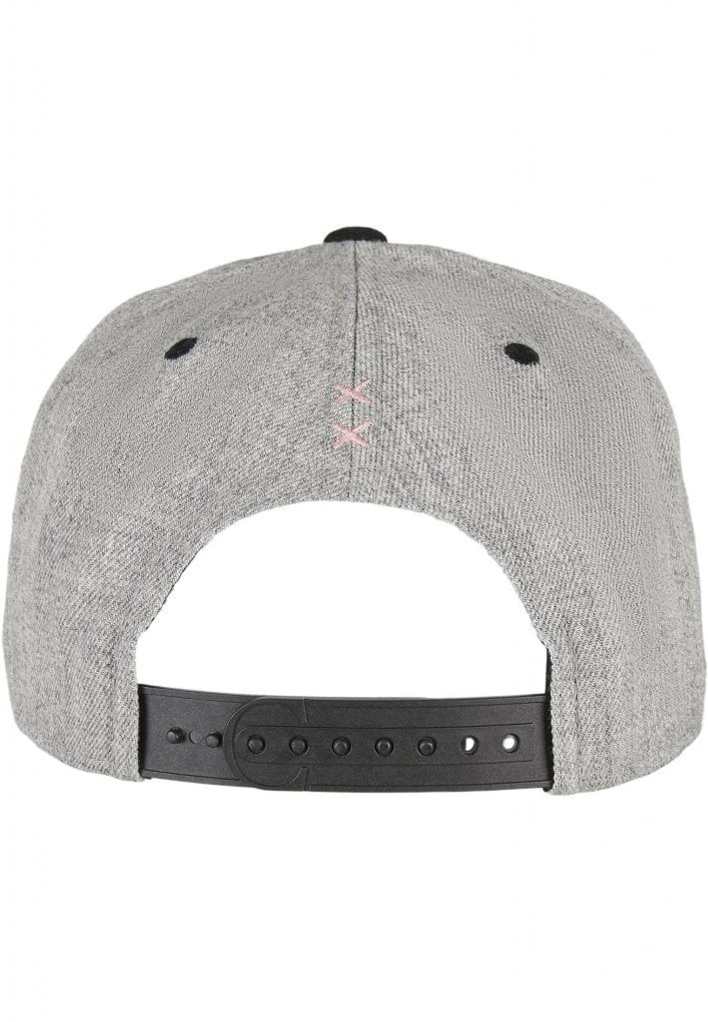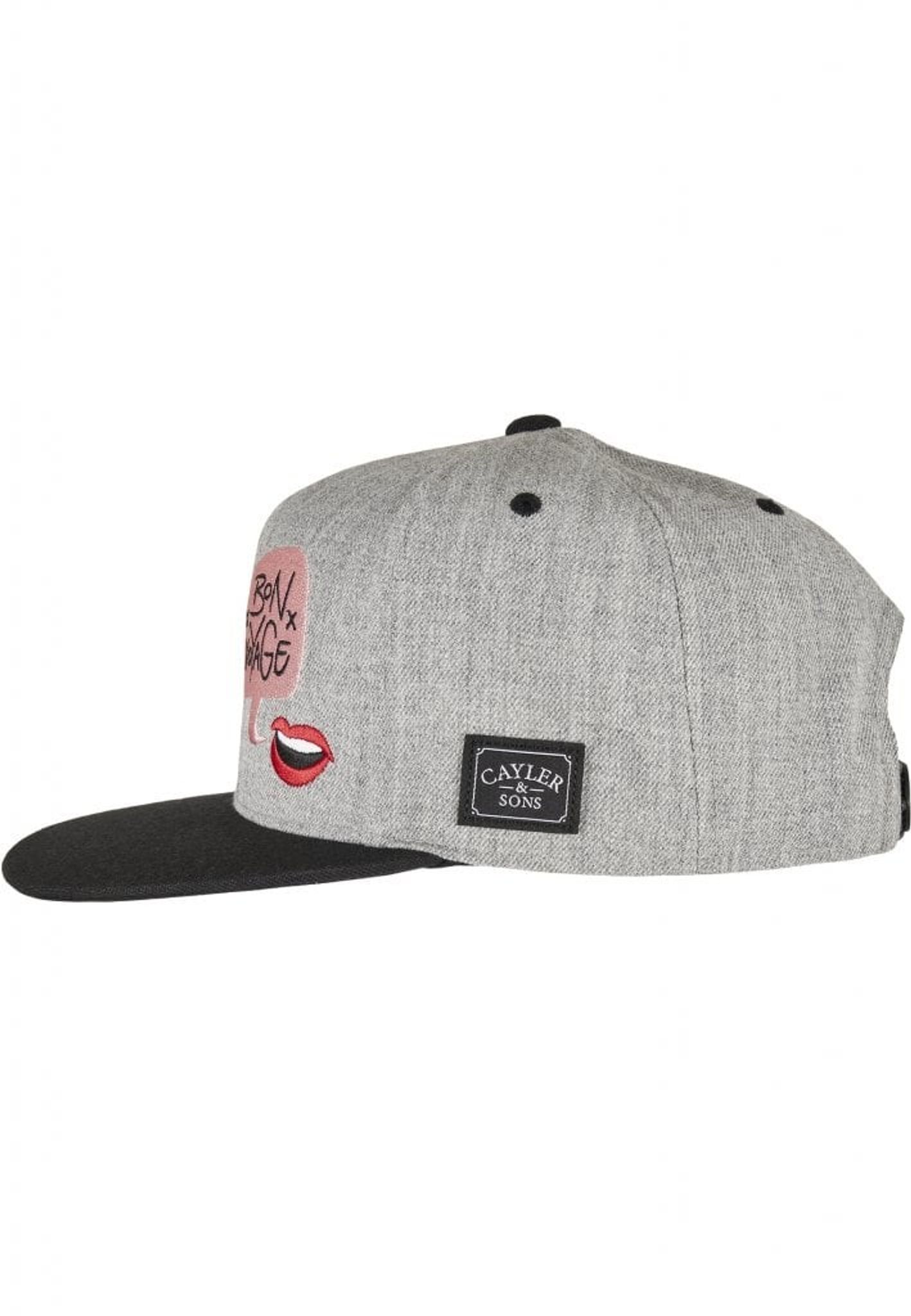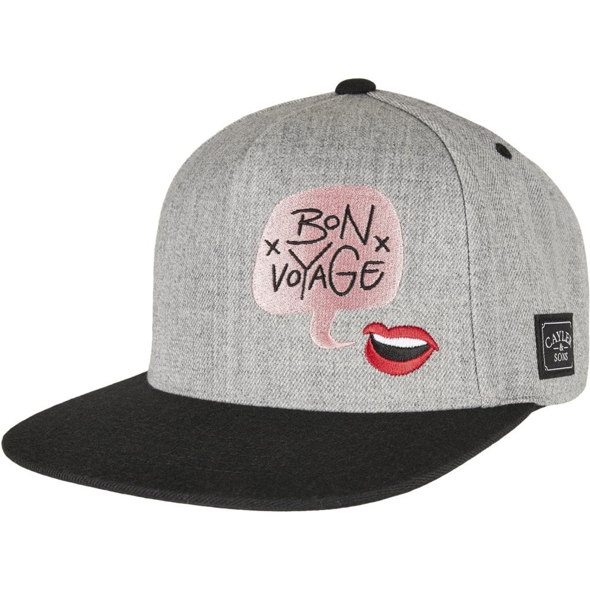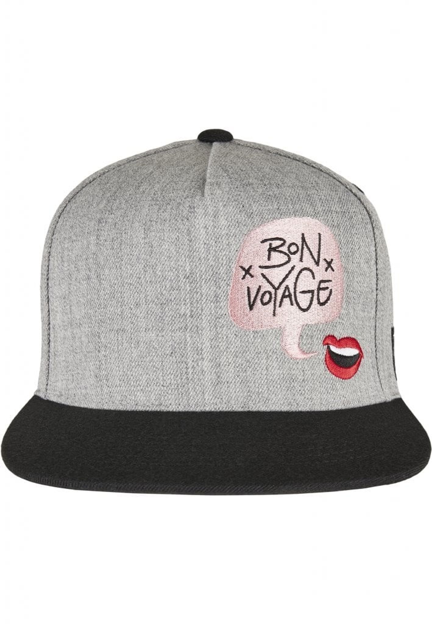 En snapback-keps i grå och svarta nyanser. En pratbubbla med "Bon Voyage" som på franska betyder "Trevlig resa" tillsammans med en mun med öppnade läppar.