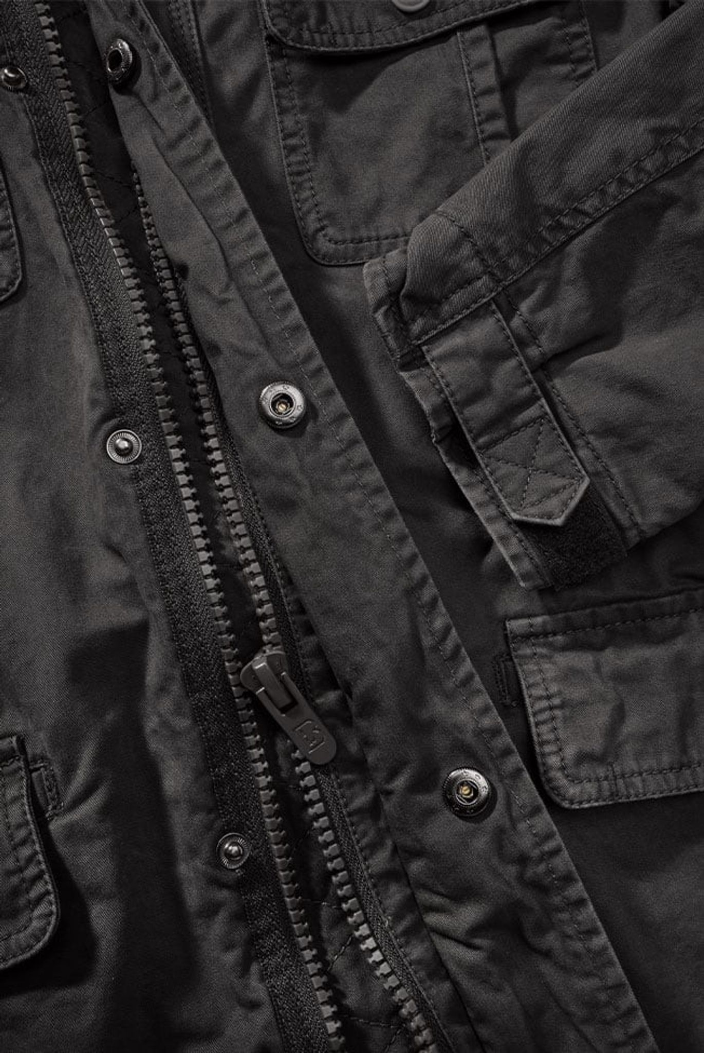 Jackan har muddar med kardborreband på ärmsluten.