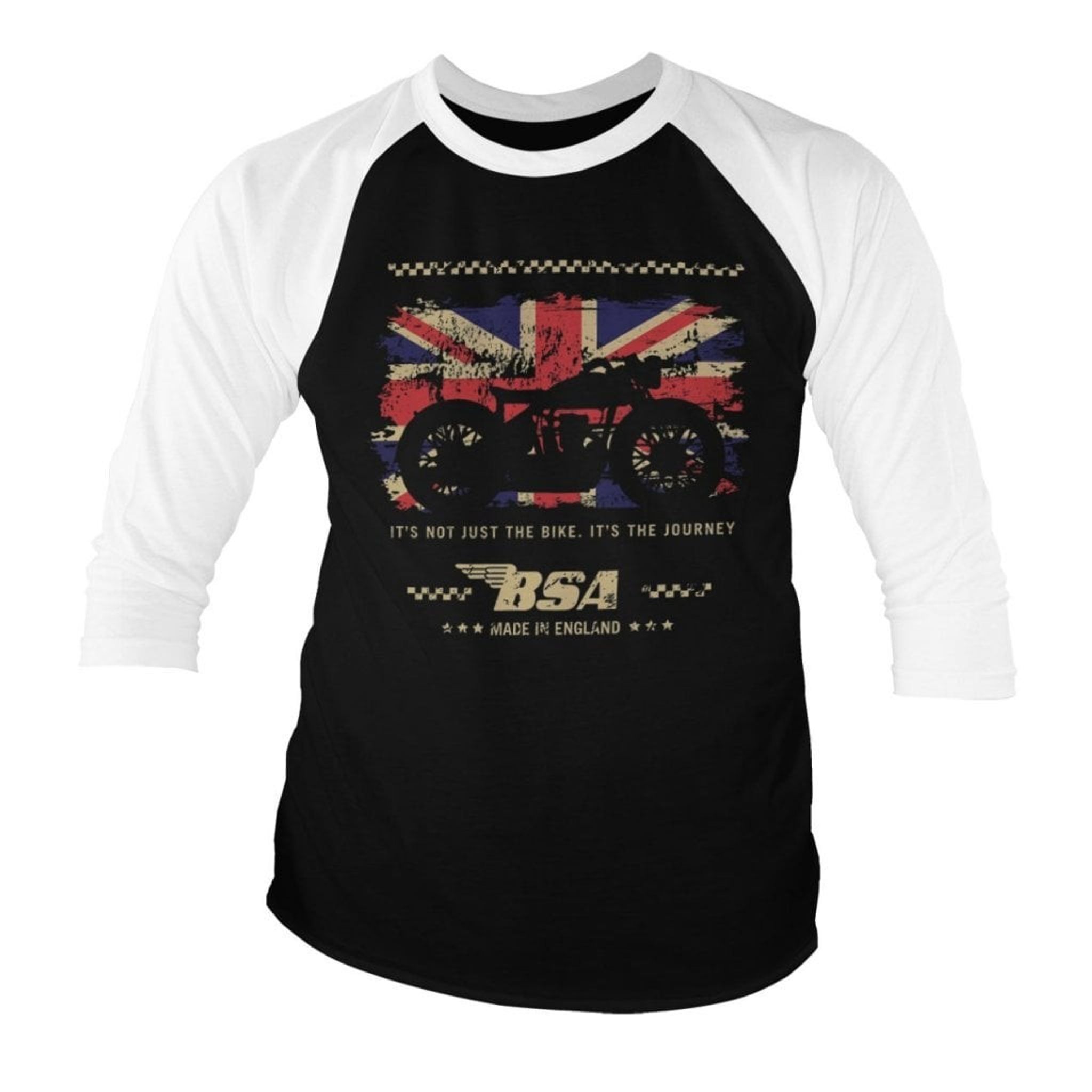 Om du älskar att känna vinden i håret när du kör runt på din motorcykel, då är den här baseballtröjan med 3/4 långa ärmar perfekt för dig! Med en kaxig siluett av en motorcykel mot en grungy Union Jack-bakgrund är detta plagget ett måste för varje äventyrlig själ.