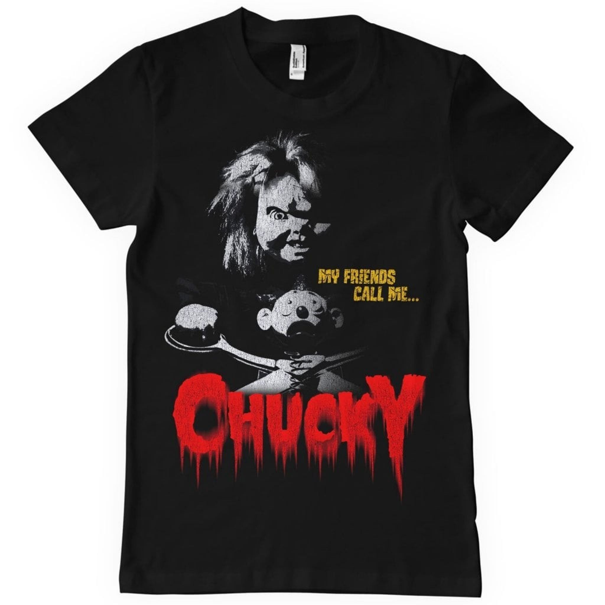 En T-shirt med stort motiv med texten "My friends call me... Chucky" tillsammans med en otäck bild på den lilla skräckdockan.