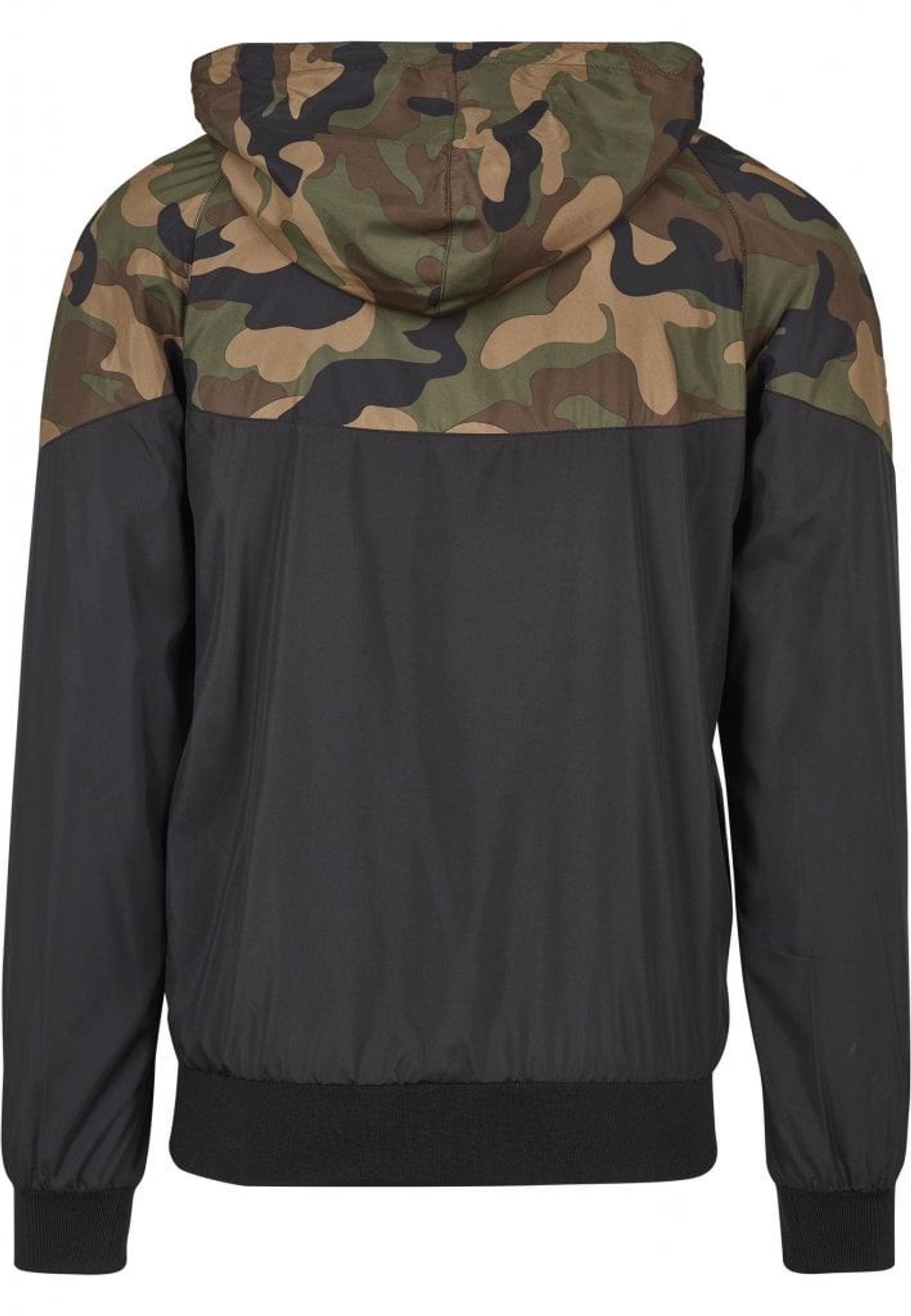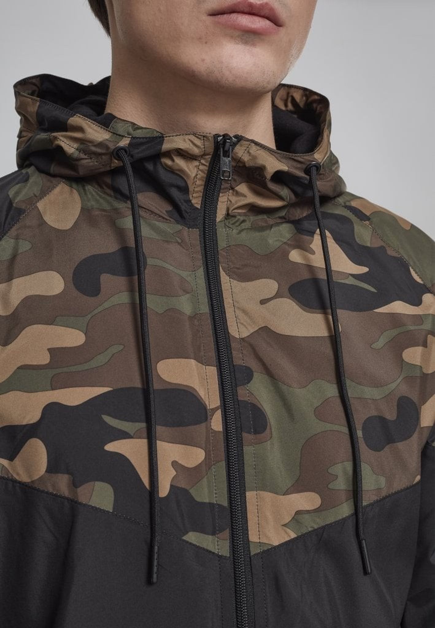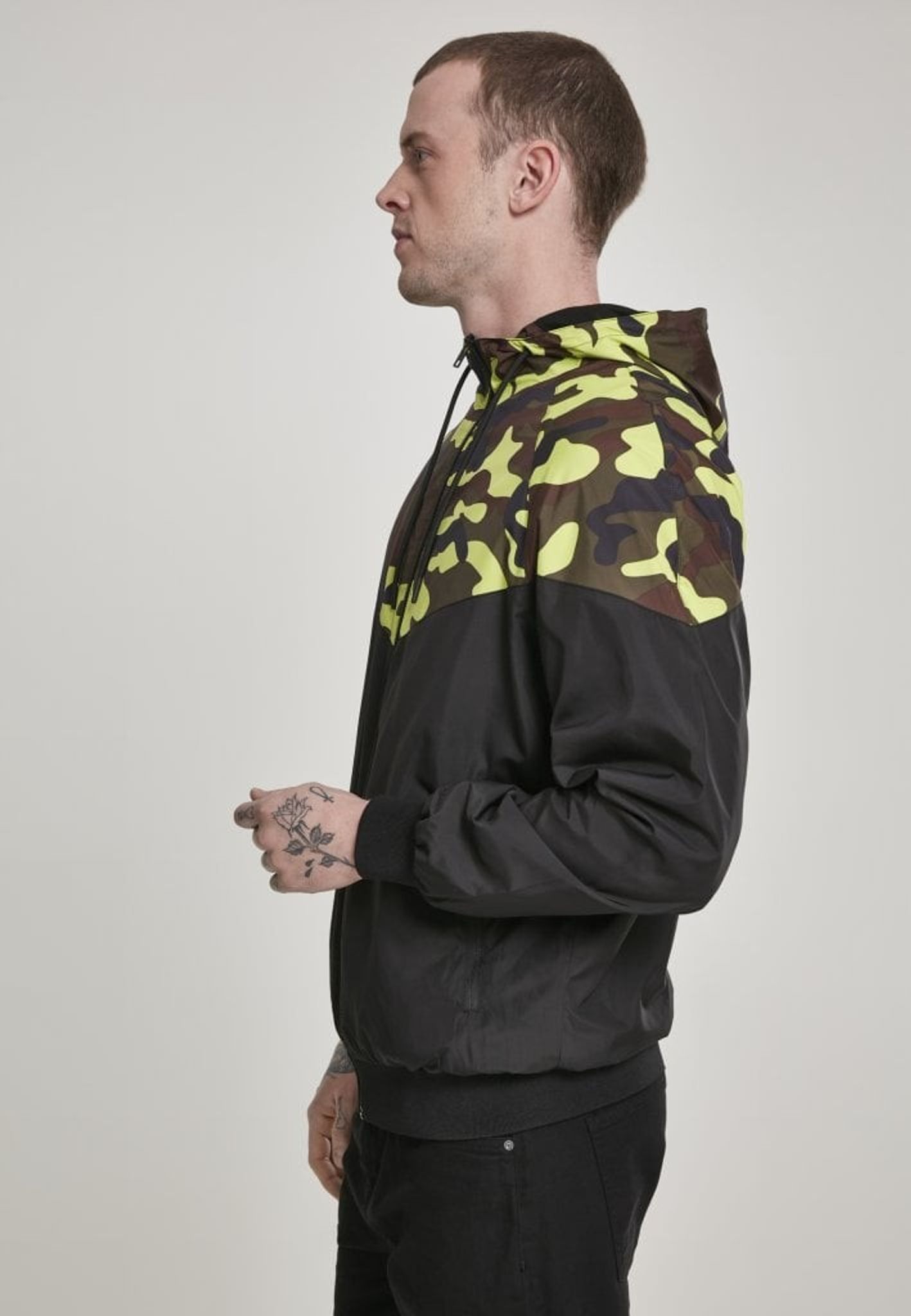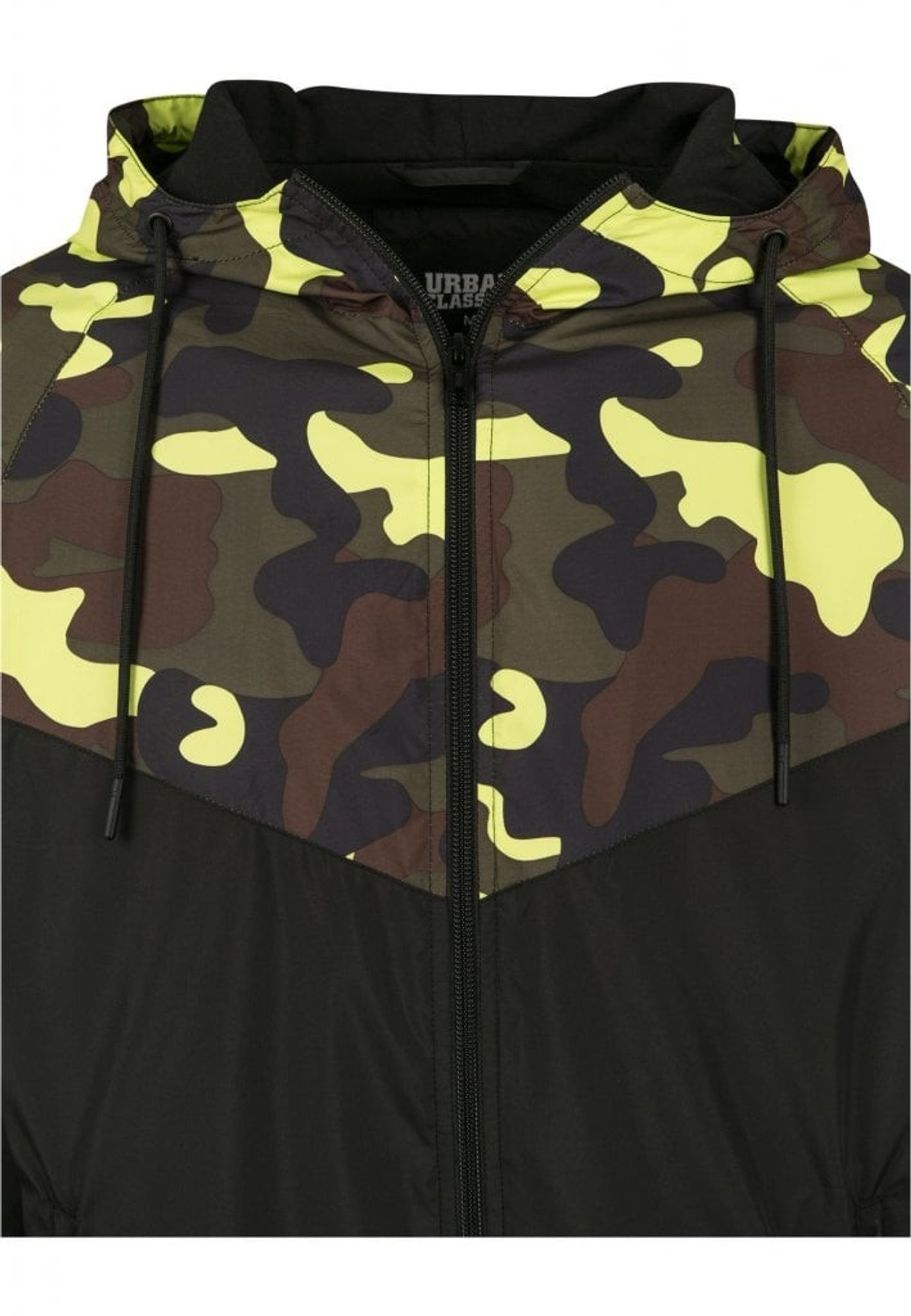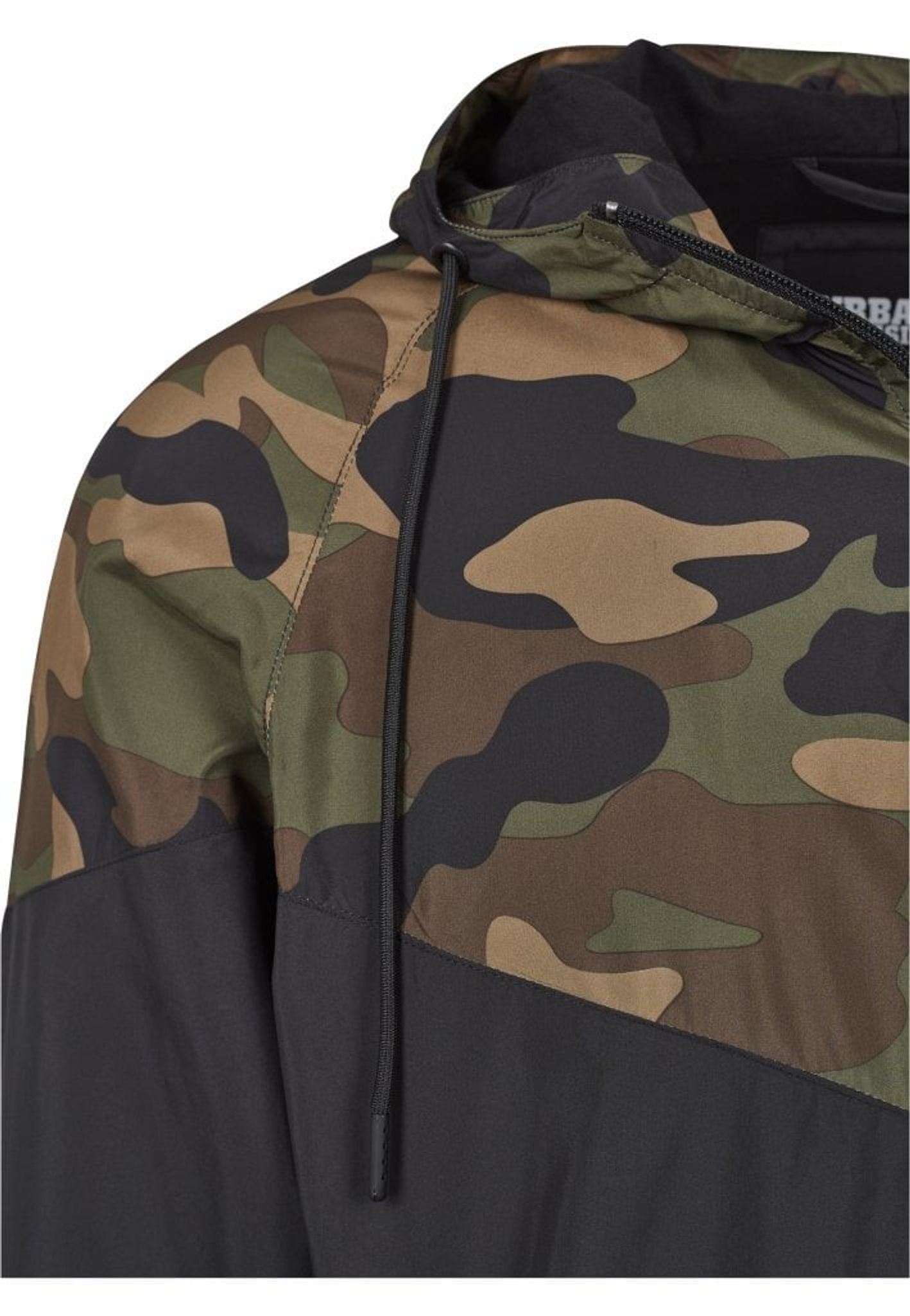 En vindjacka med en överdel som går i kamouflagemönster och en nederdel i svart tyg.
