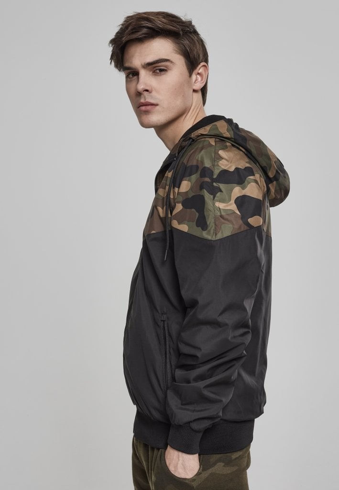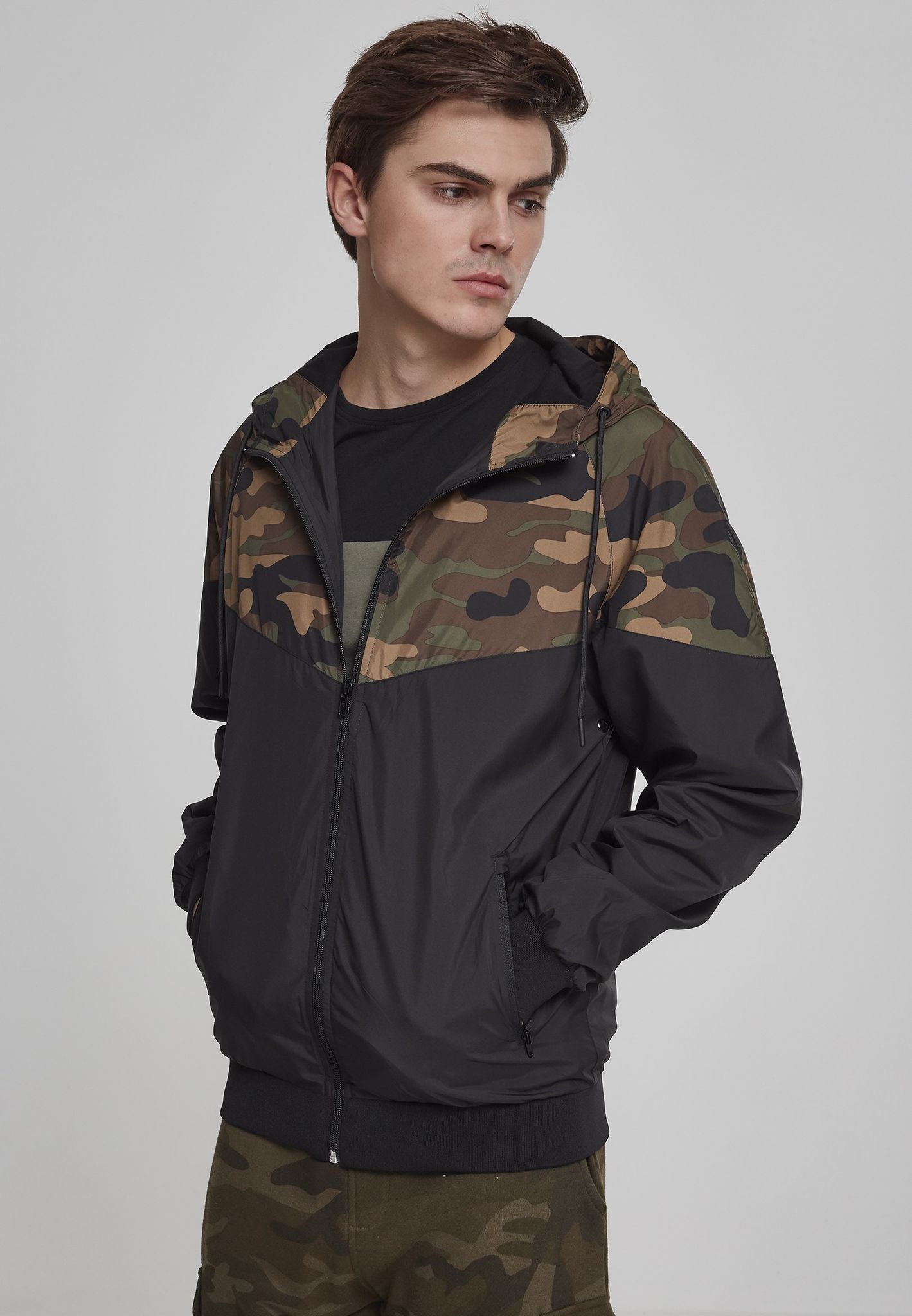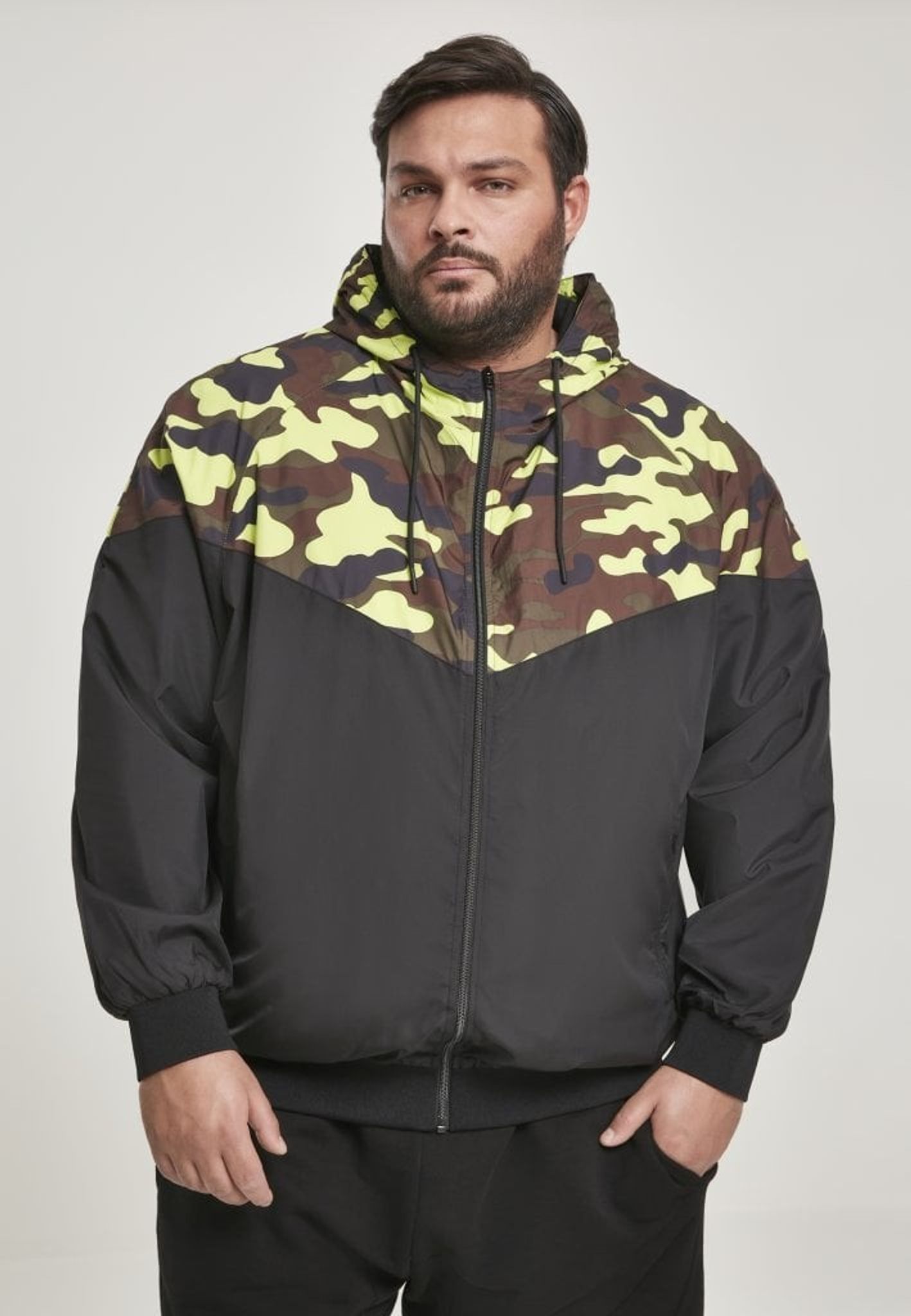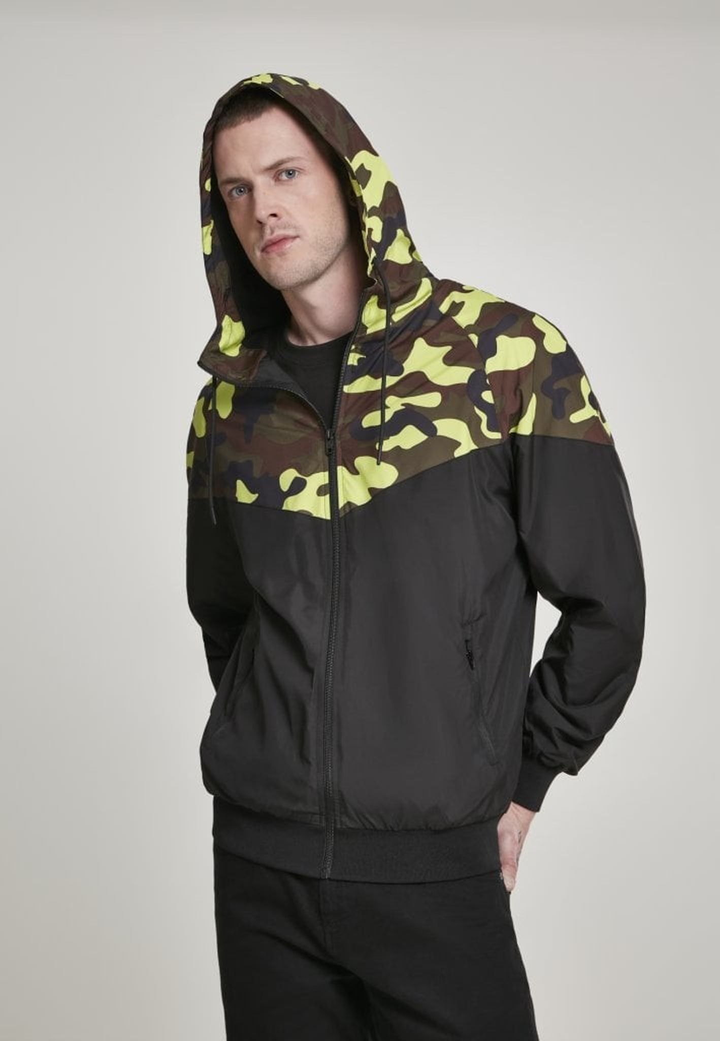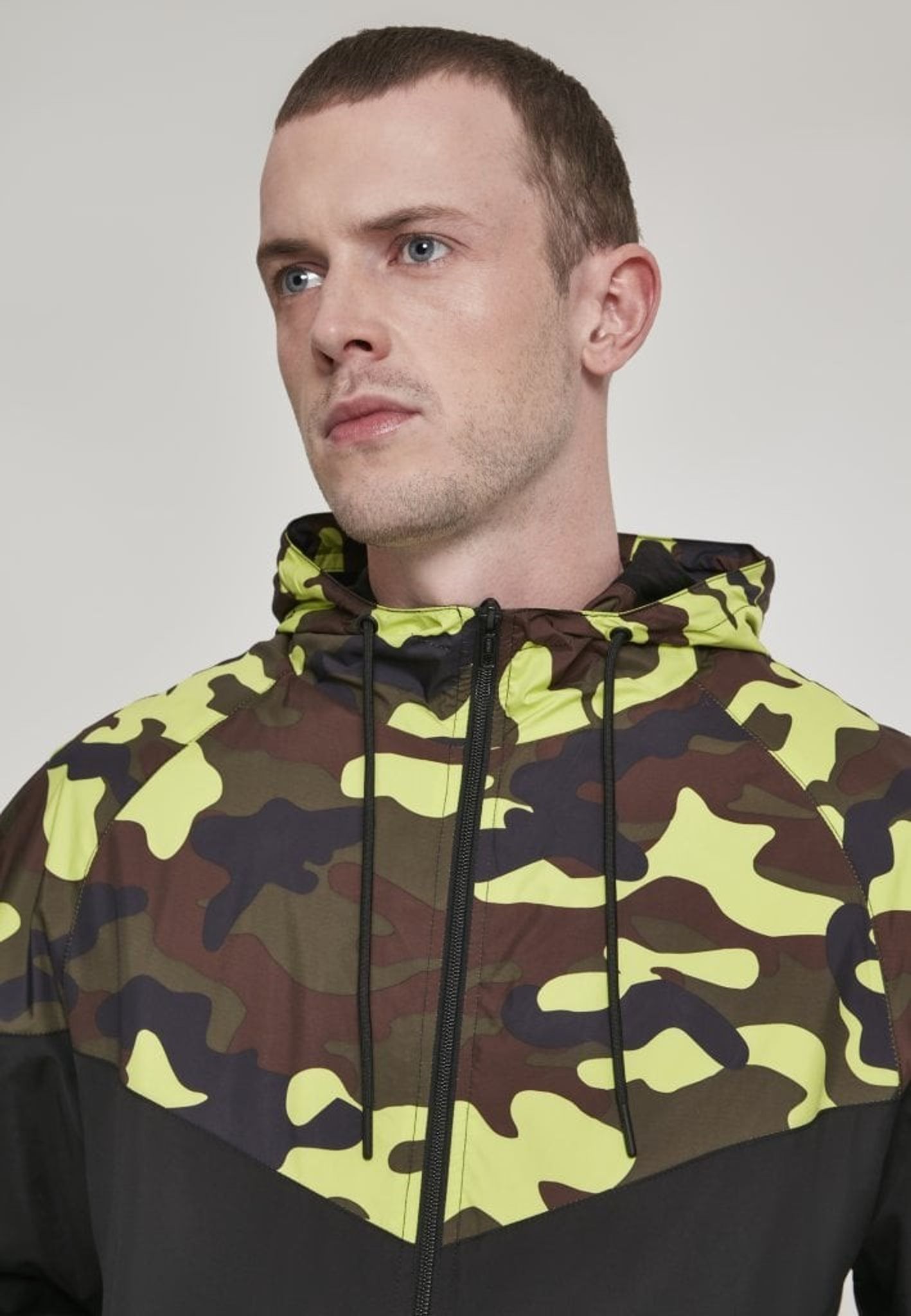 En vindjacka med en överdel som går i kamouflagemönster och en nederdel i svart tyg.