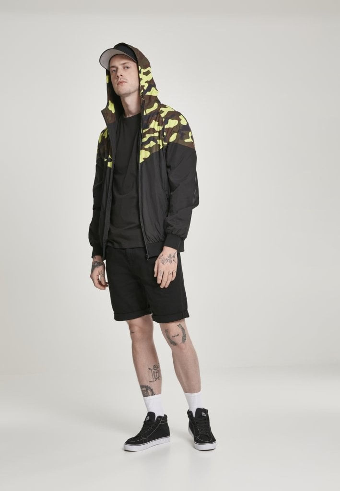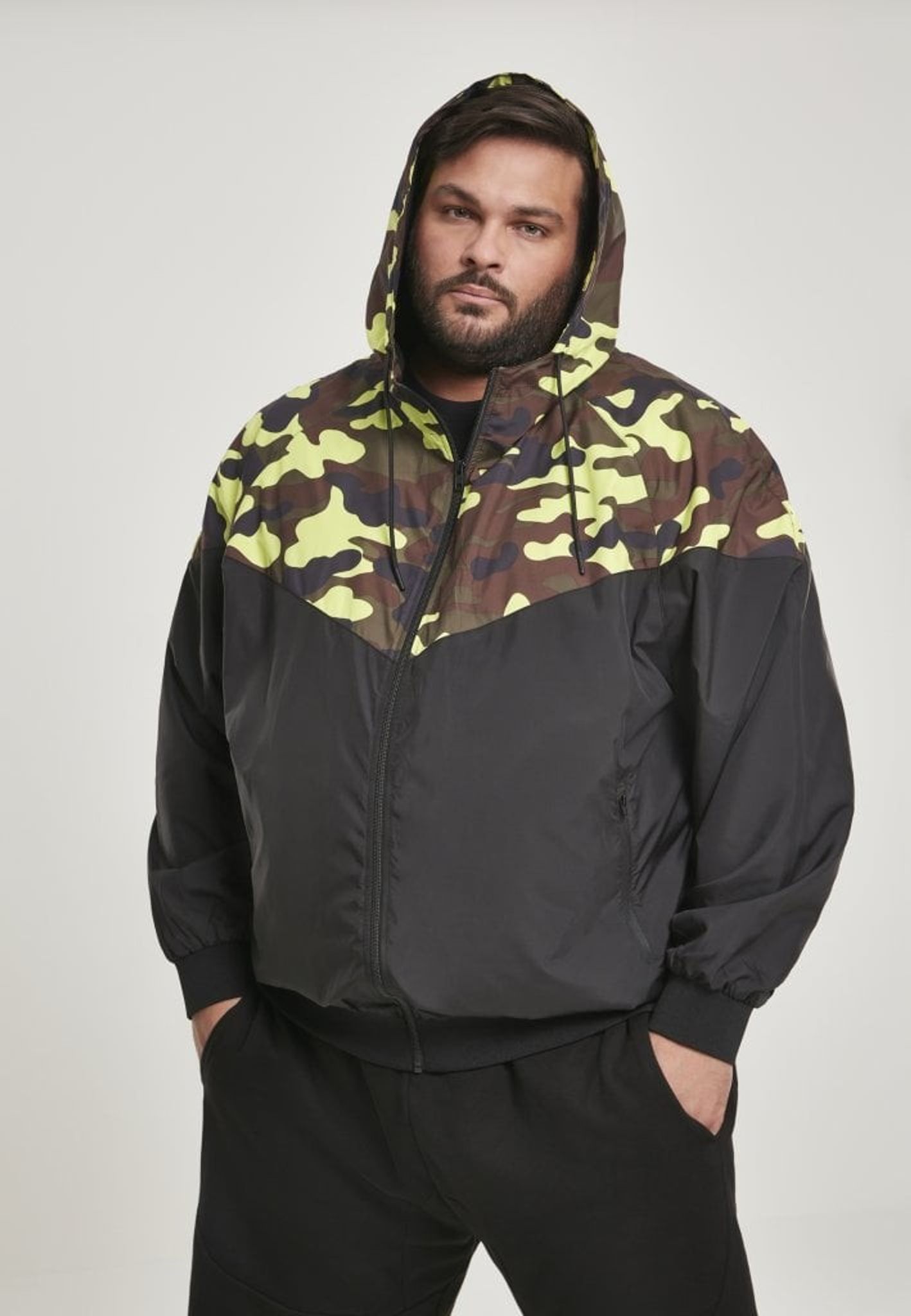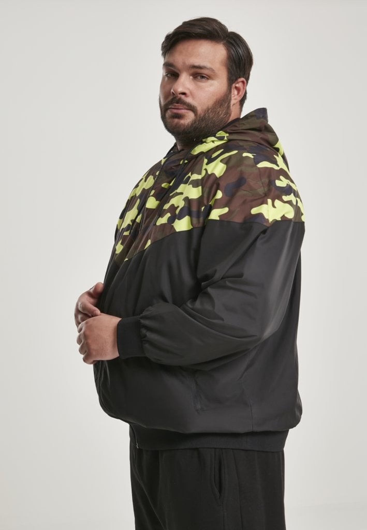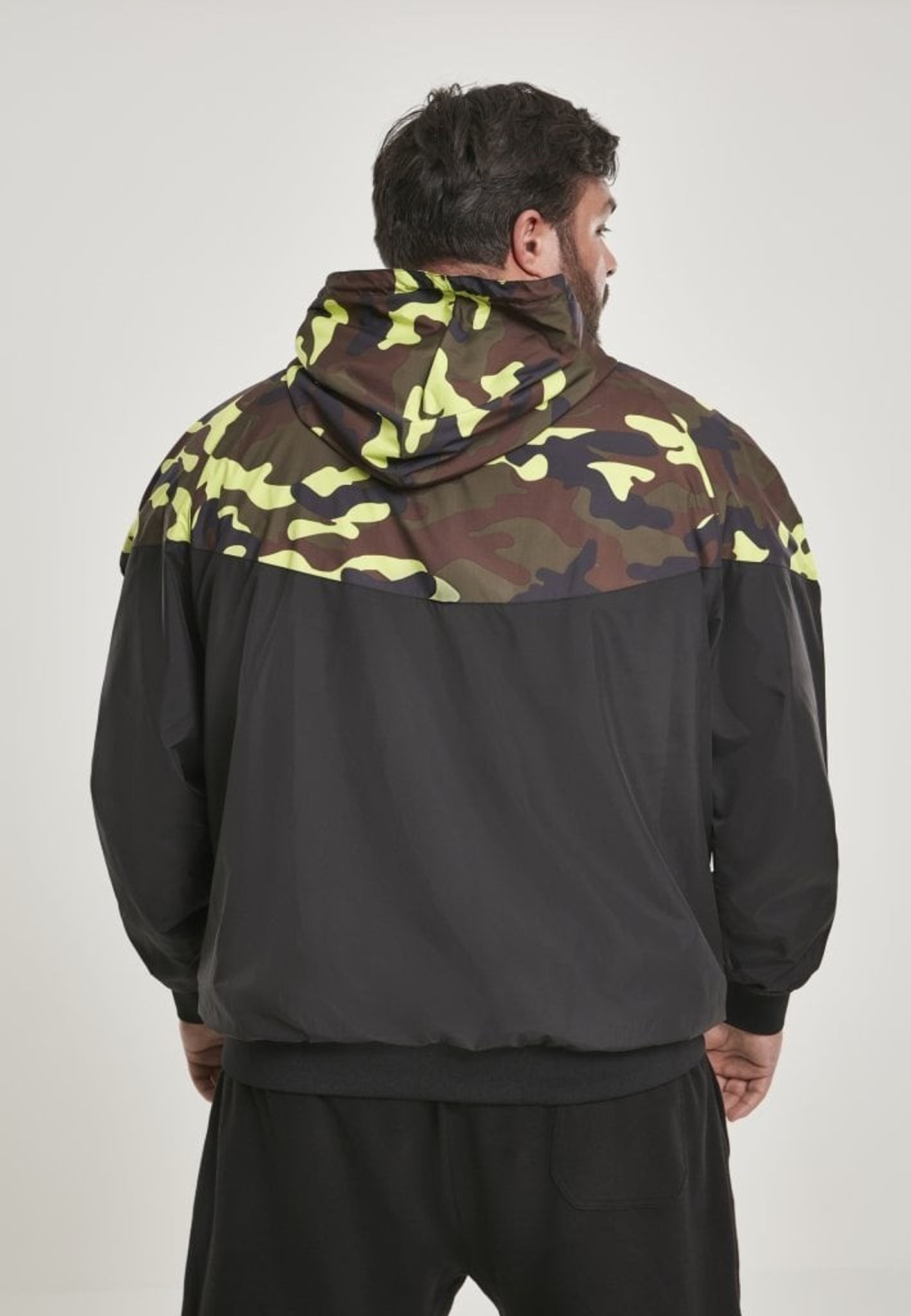 En vindjacka med en överdel som går i kamouflagemönster och en nederdel i svart tyg.