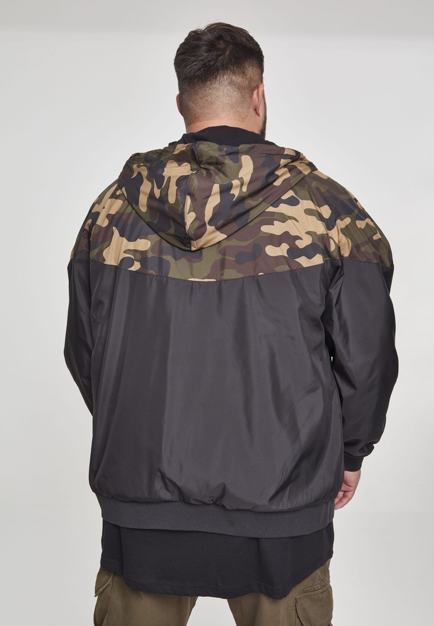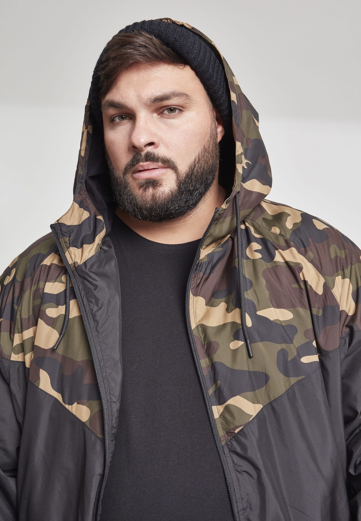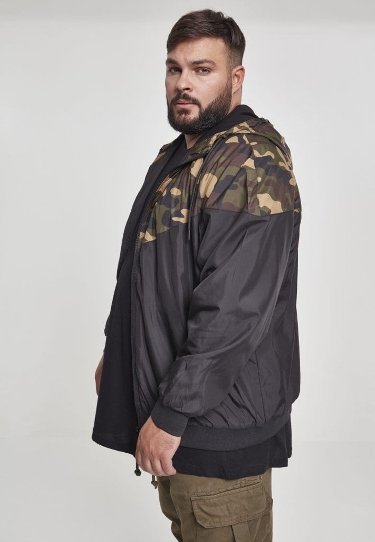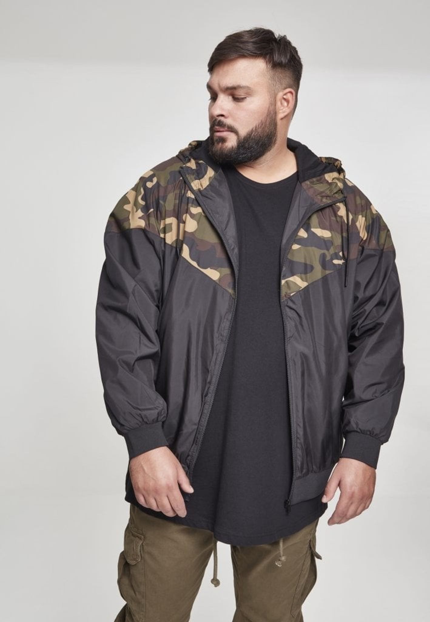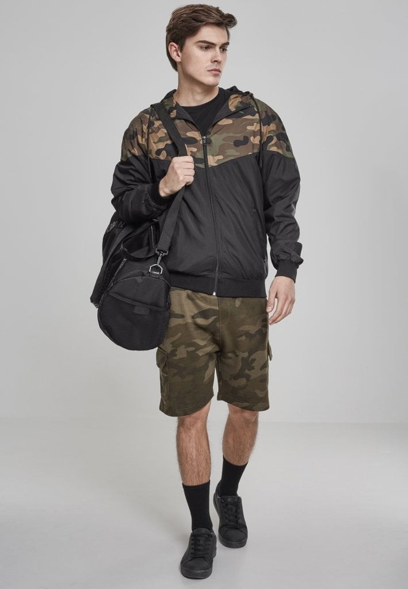 En vindjacka med en överdel som går i kamouflagemönster och en nederdel i svart tyg.