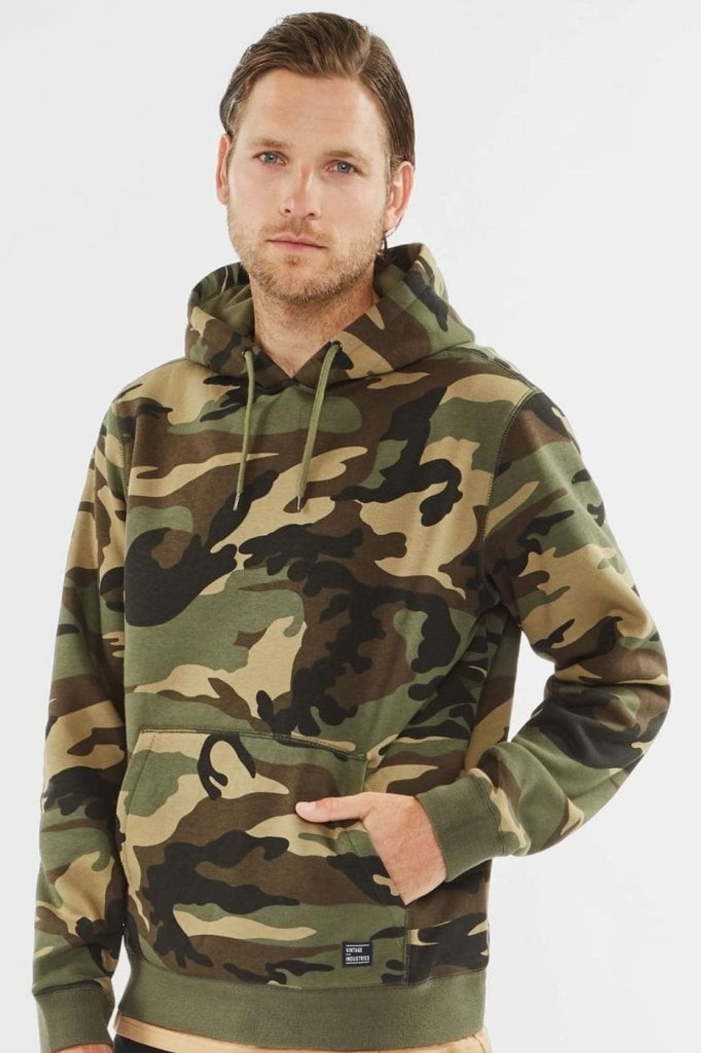 En snyggt kamouflagemönstrad hoodie i tjockt tyg. Här får du en varm hoodie med kvalité i både tyg och muddar.
