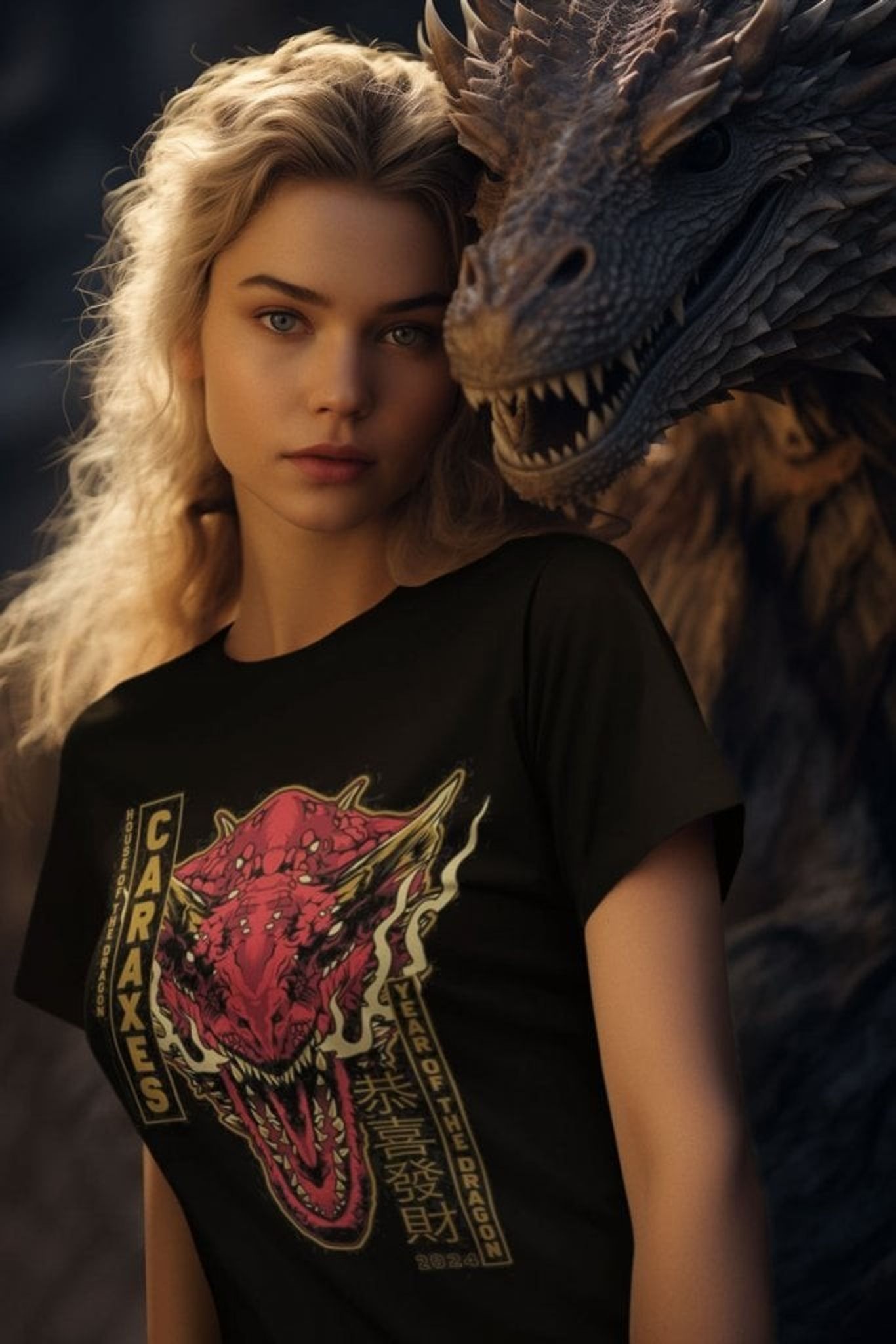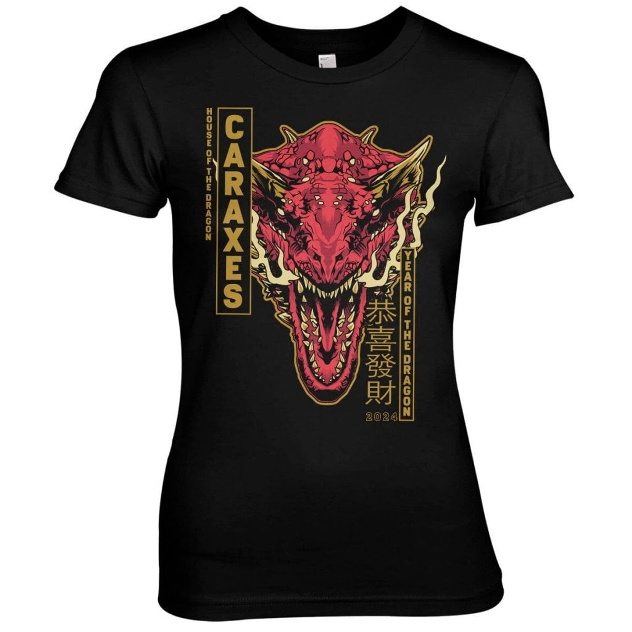 Namnet "Caraxes" står i stora, kraftfulla bokstäver på tröjan, vilket understryker drakens betydelse.