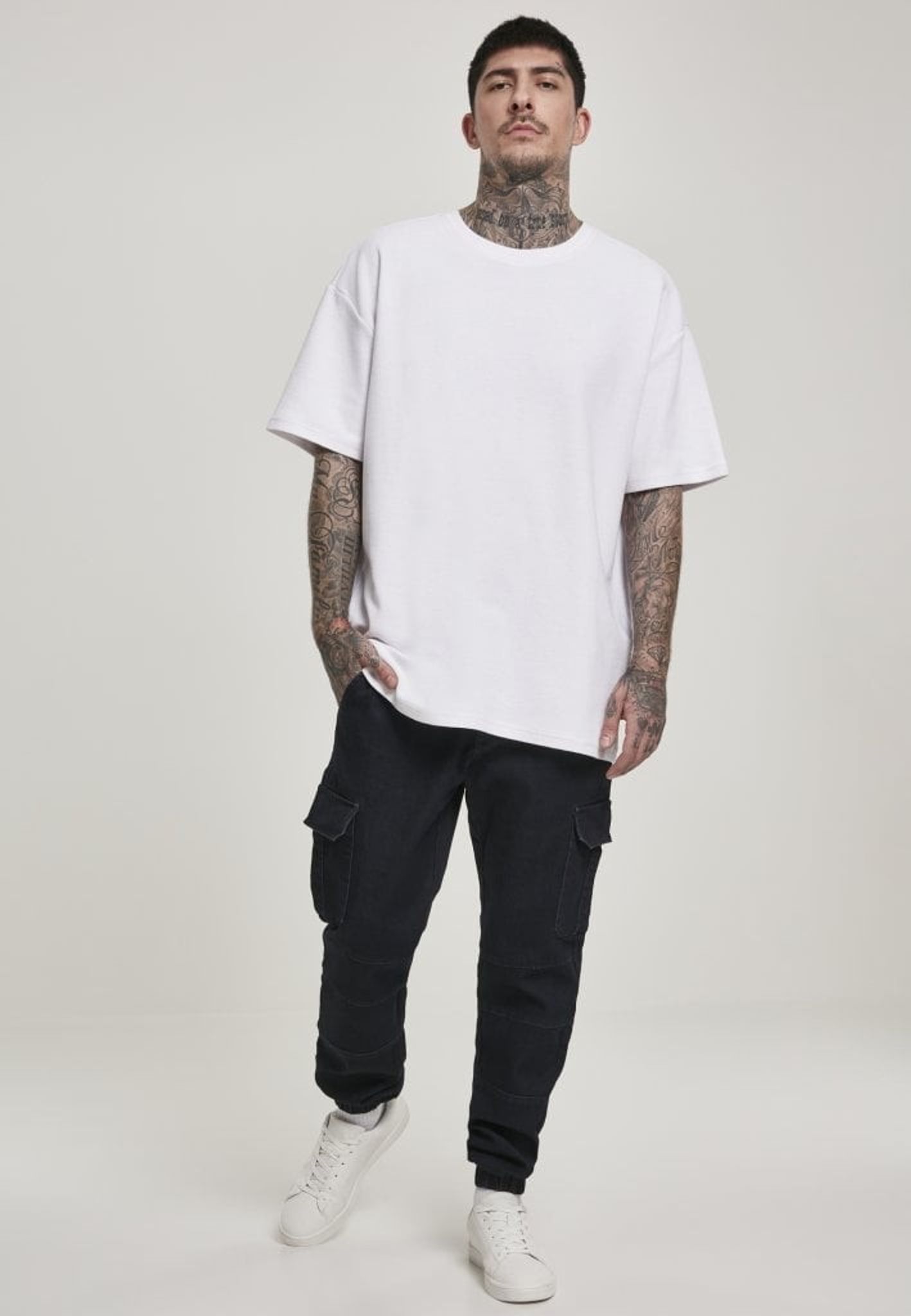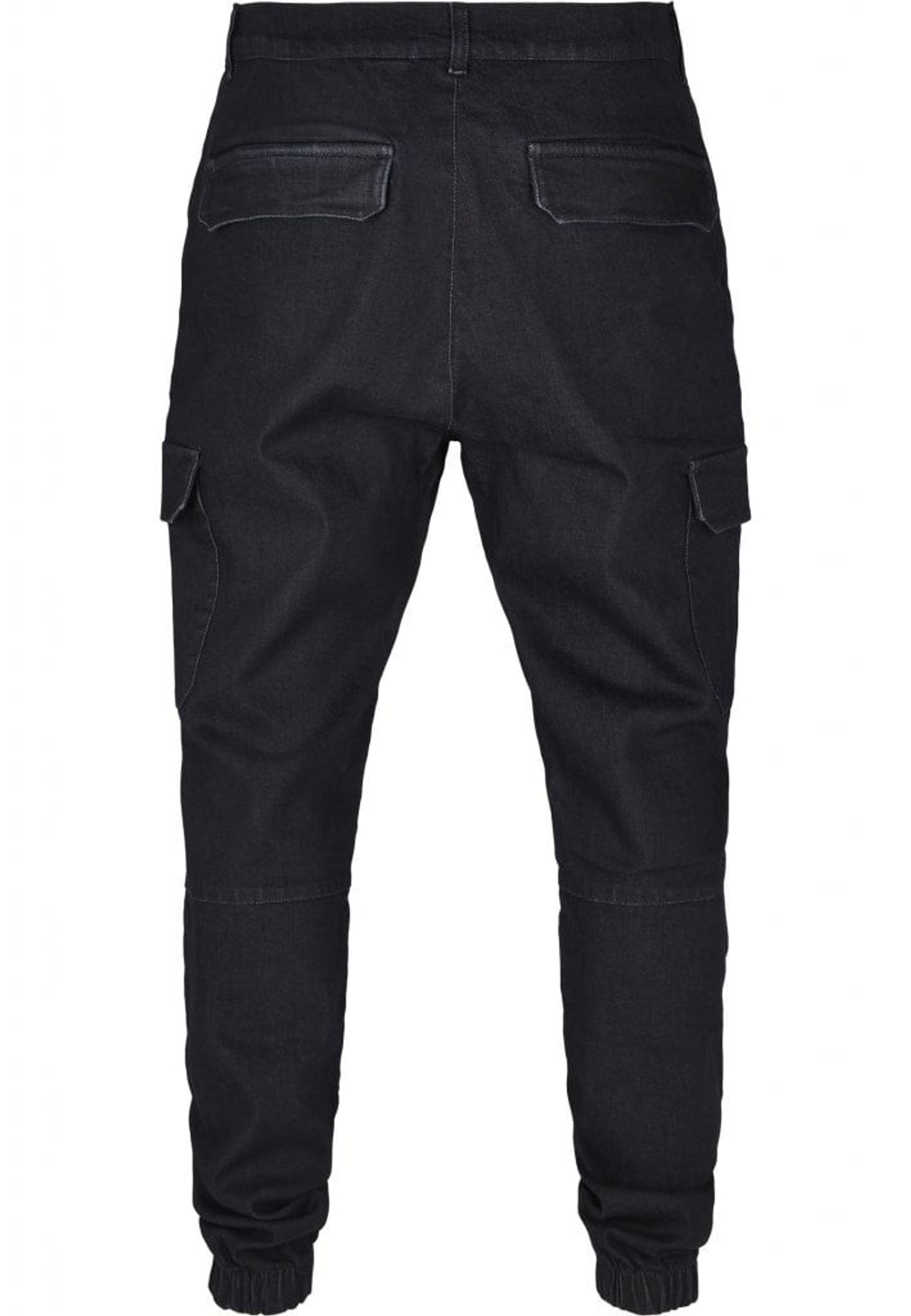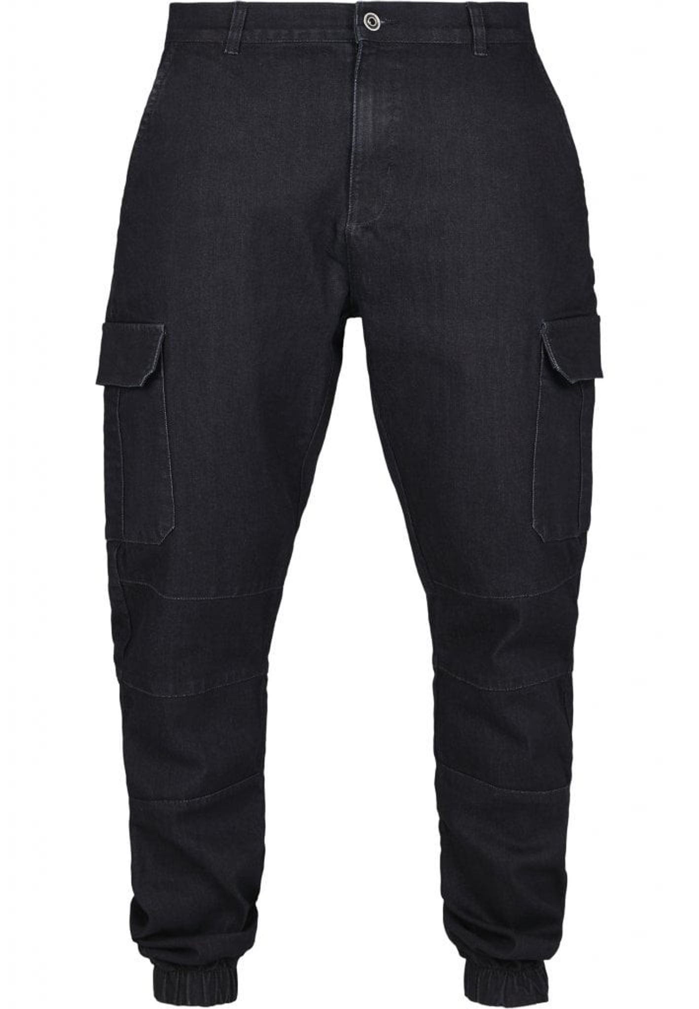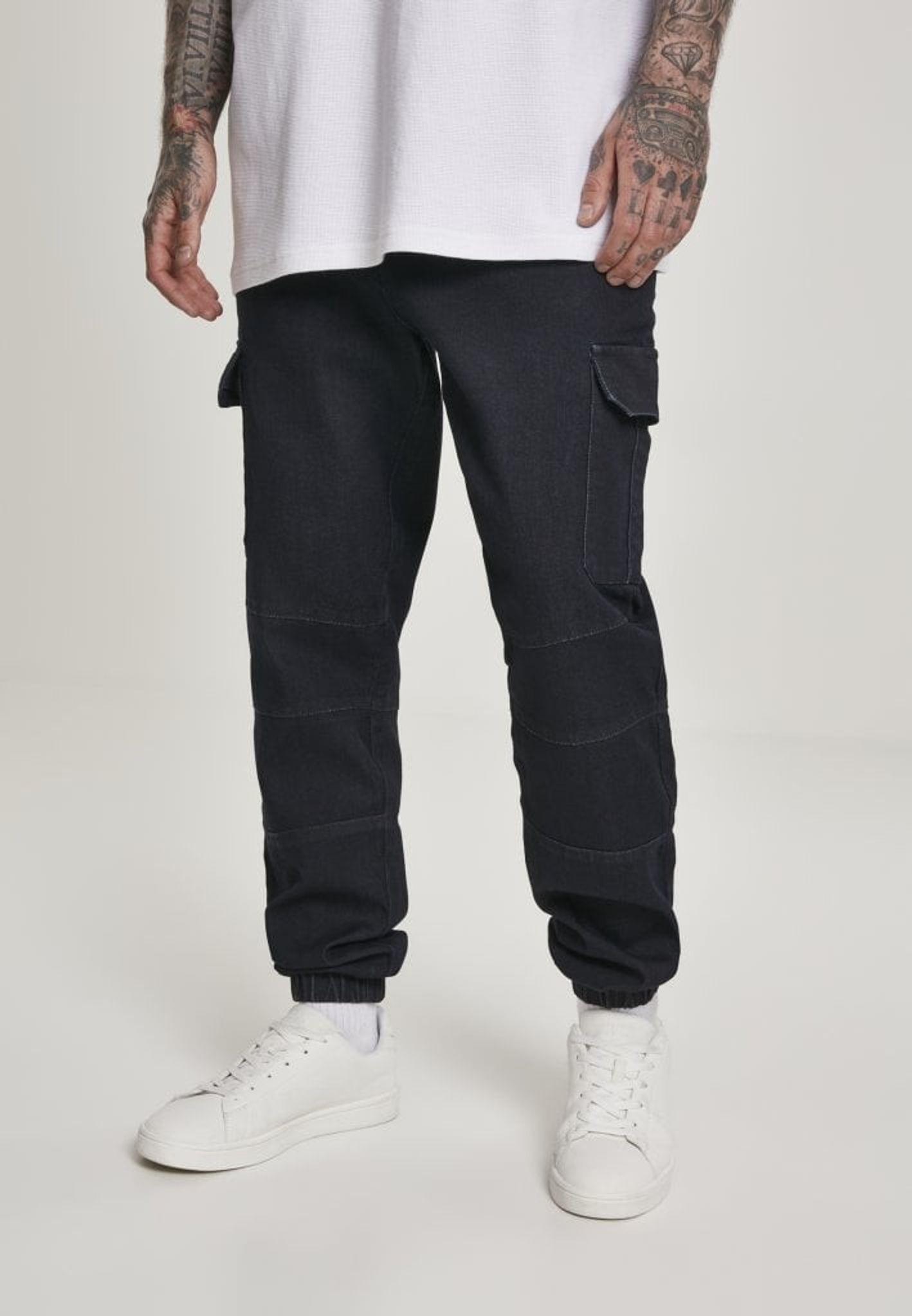 Cargojeans med stora fickor på benen och muddar i benslutet.