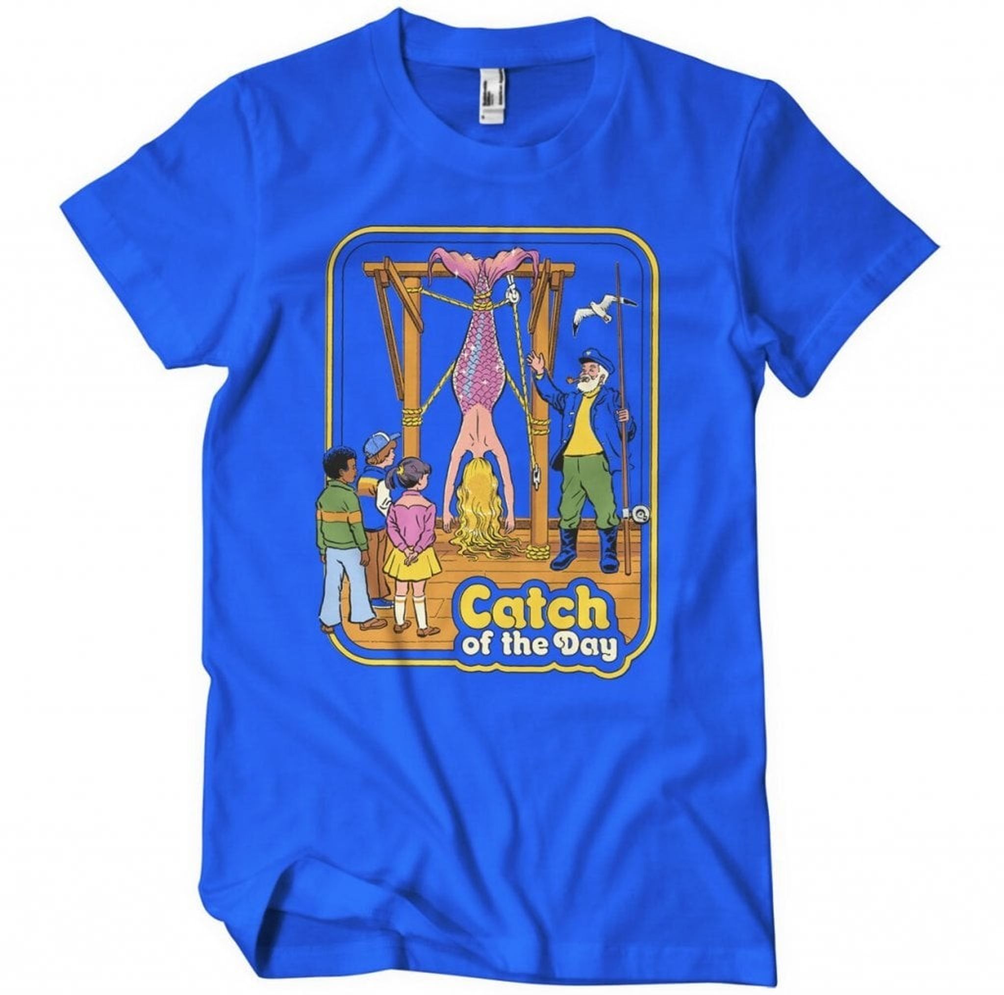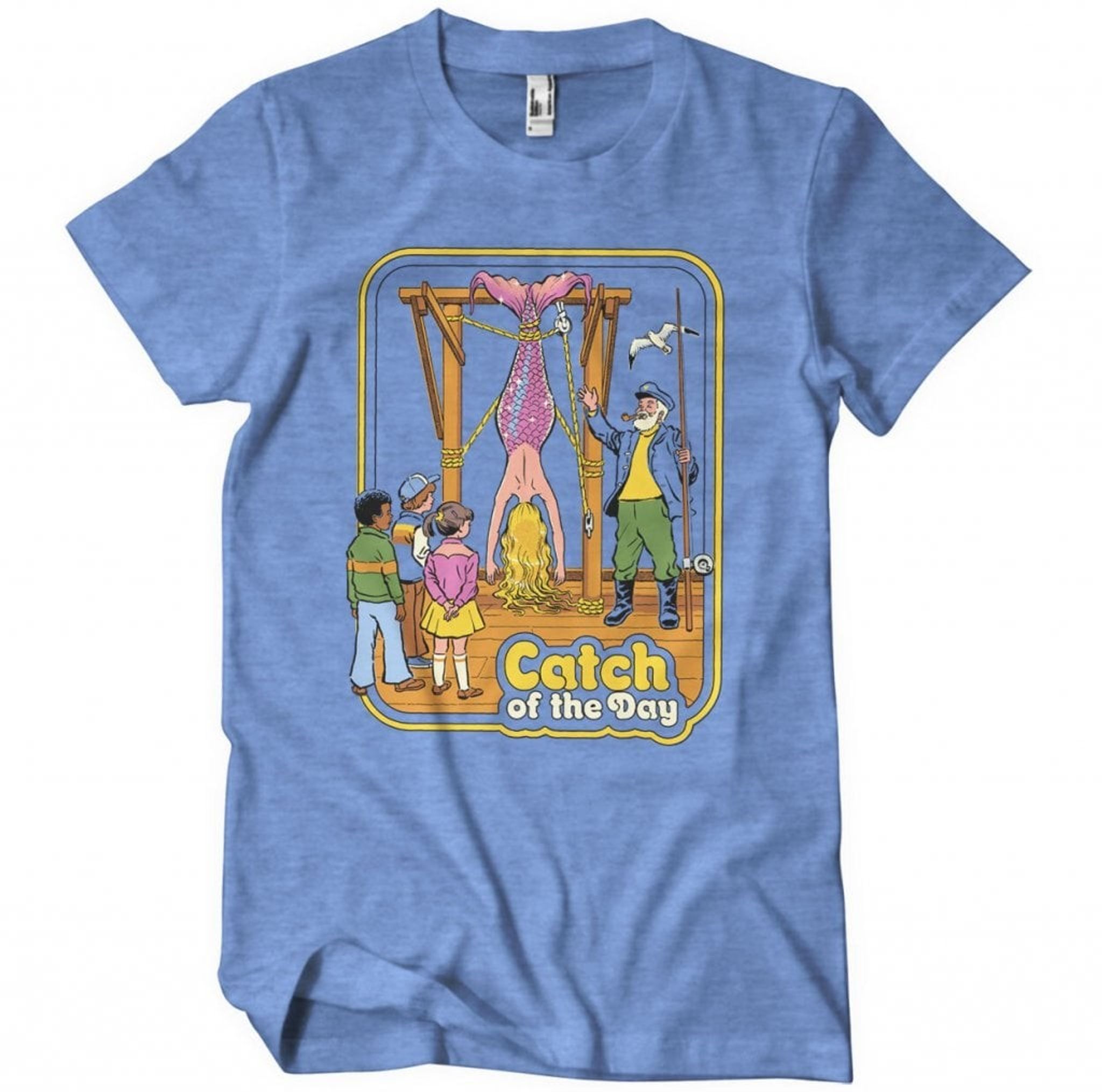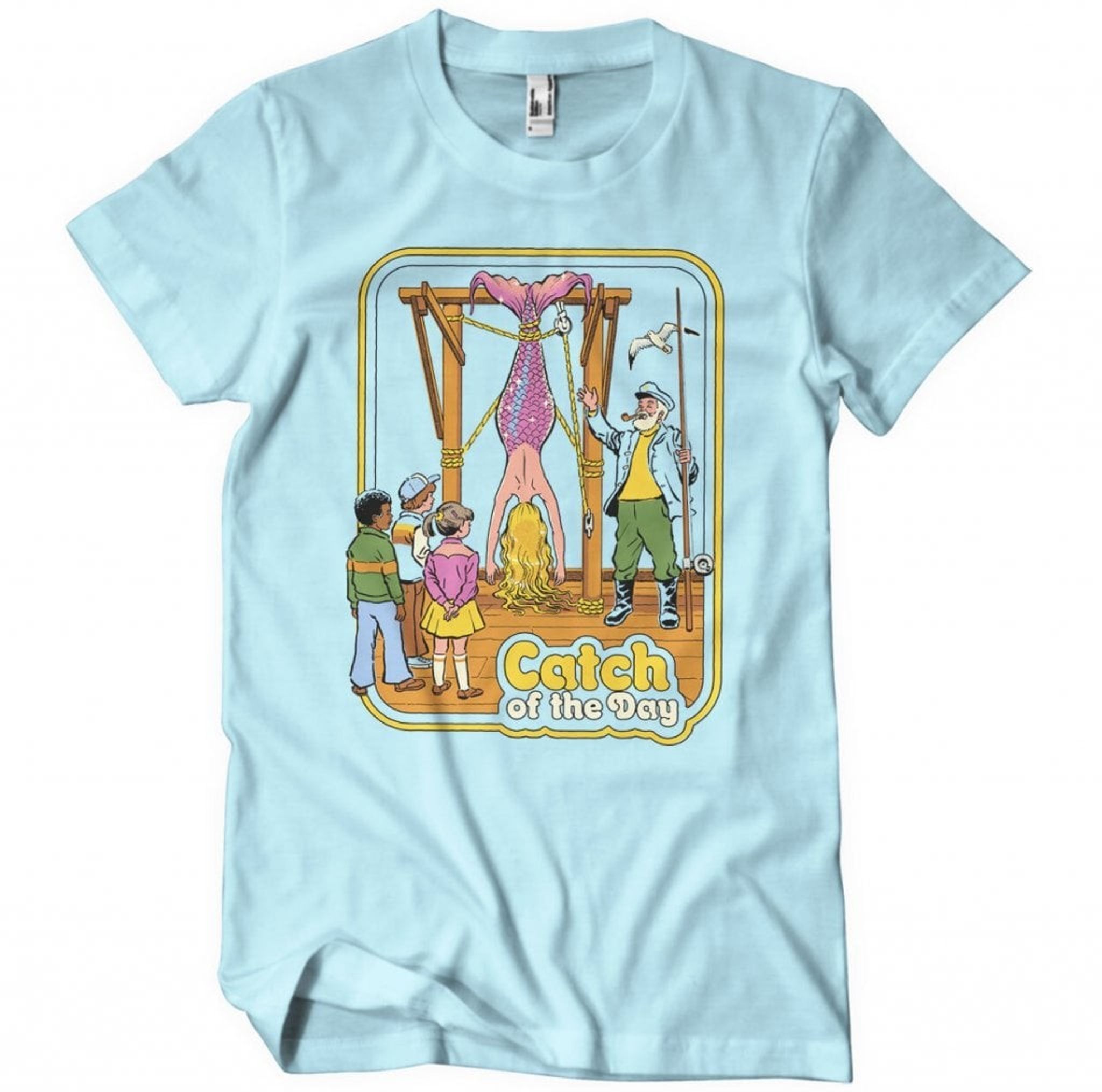 Denna T-shirt har en underbart lekfull design som inte kan annat än att få dig att skratta. Motivet, signerat Steven Rhodes, visar en makaber twist på fiskskrönor och sagoberättelser. Det visar en stolt gammal fiskare som håller i en ovanlig fångst – en gigantisk sjöjungfru hängande upp och ner som en fisk. Wow, snacka om att fånga "Catch of the Day"!