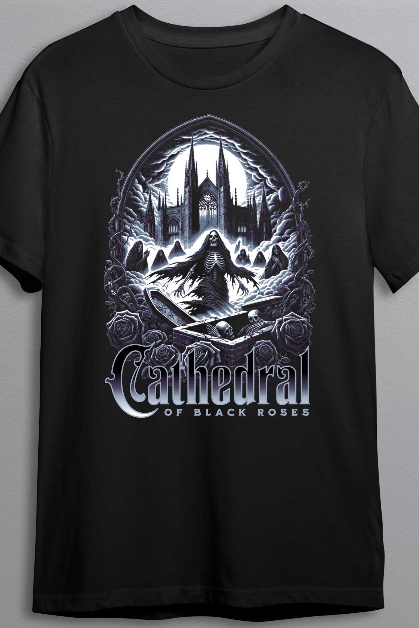 "Cathedral of Black Roses" är mer än bara en t-shirt – det är ett goth-mästerverk i bomull. Den passar lika bra på konserten, som när du beställer en espresso svart som din själ. Den säger: "Jag kom inte hit för att småprata om vädret – jag är här för att väcka de döda med stil."